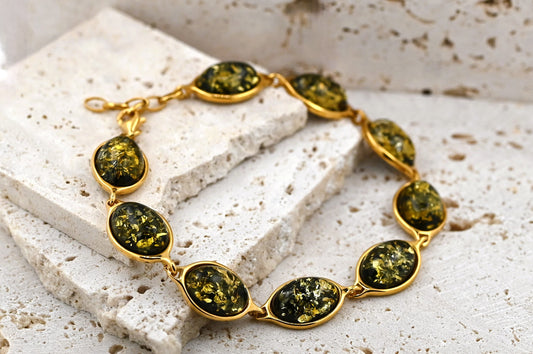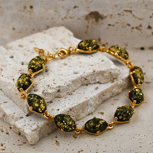 Bransoletka Bursztynowy Blask, Zielony, Pozłacane Srebro 925