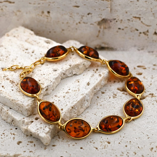 Bransoletka Bursztynowa Elegancja, Koniak, Pozłacane srebro