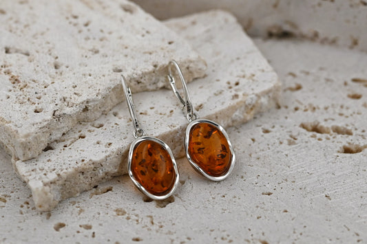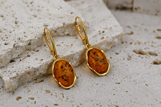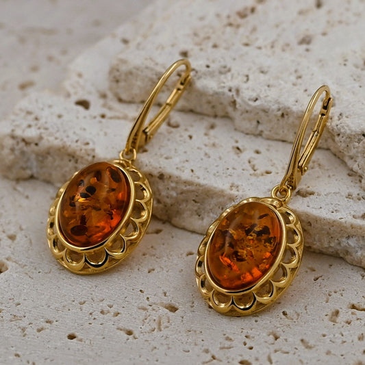 Kolczyki Bursztynowa Elegancja, Koniak, Pozłacane Srebro 925