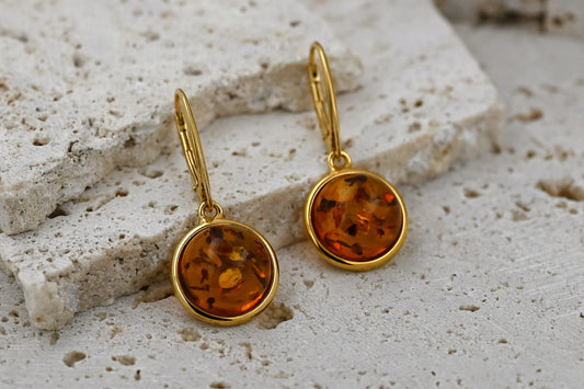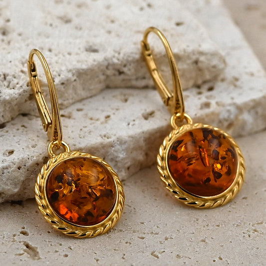 Kolczyki Bursztynowa Aureola, Koniak, Pozłacane srebro