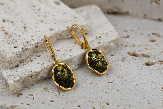 Amber Wave Earrings, Green, Gold-plated Silver 925