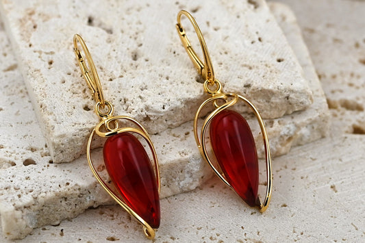 Kolczyki Bursztynowa Kropla, Czerwony, Pozłacane srebro