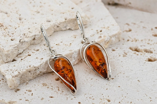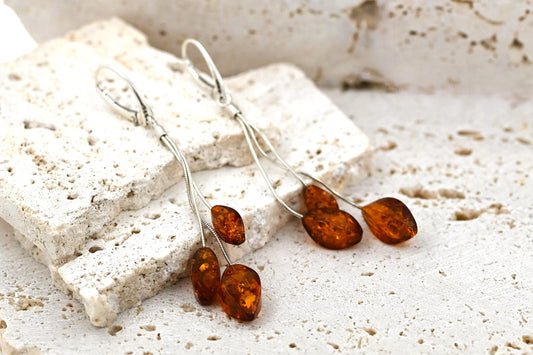 Kolczyki Bursztynowa Harfa, Koniak, Srebro 925