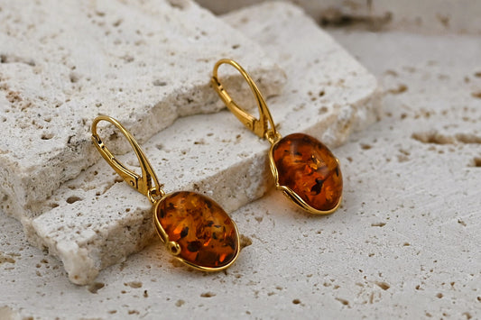 Amber Drop Earrings, Cognac, Gold-Plated Silver 925