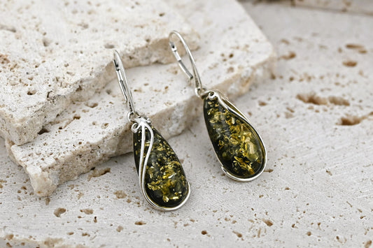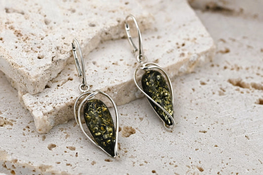 Kolczyki Bursztynowa Harfa, Zielony, Srebro 925