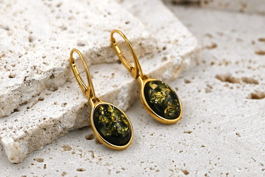 Amber Moon Earrings, Green, Gold Plated Silver 925