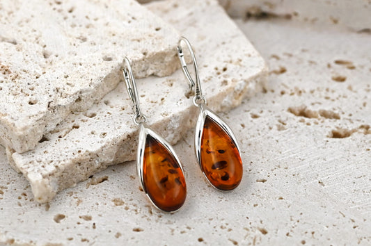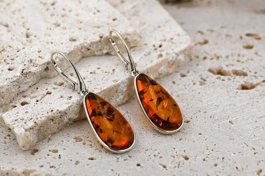 Amber Drop Earrings, Cognac, Silver