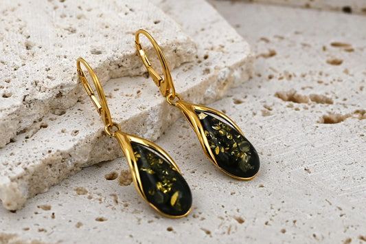 Amber Drop Earrings, Green, Gold Plated Silver