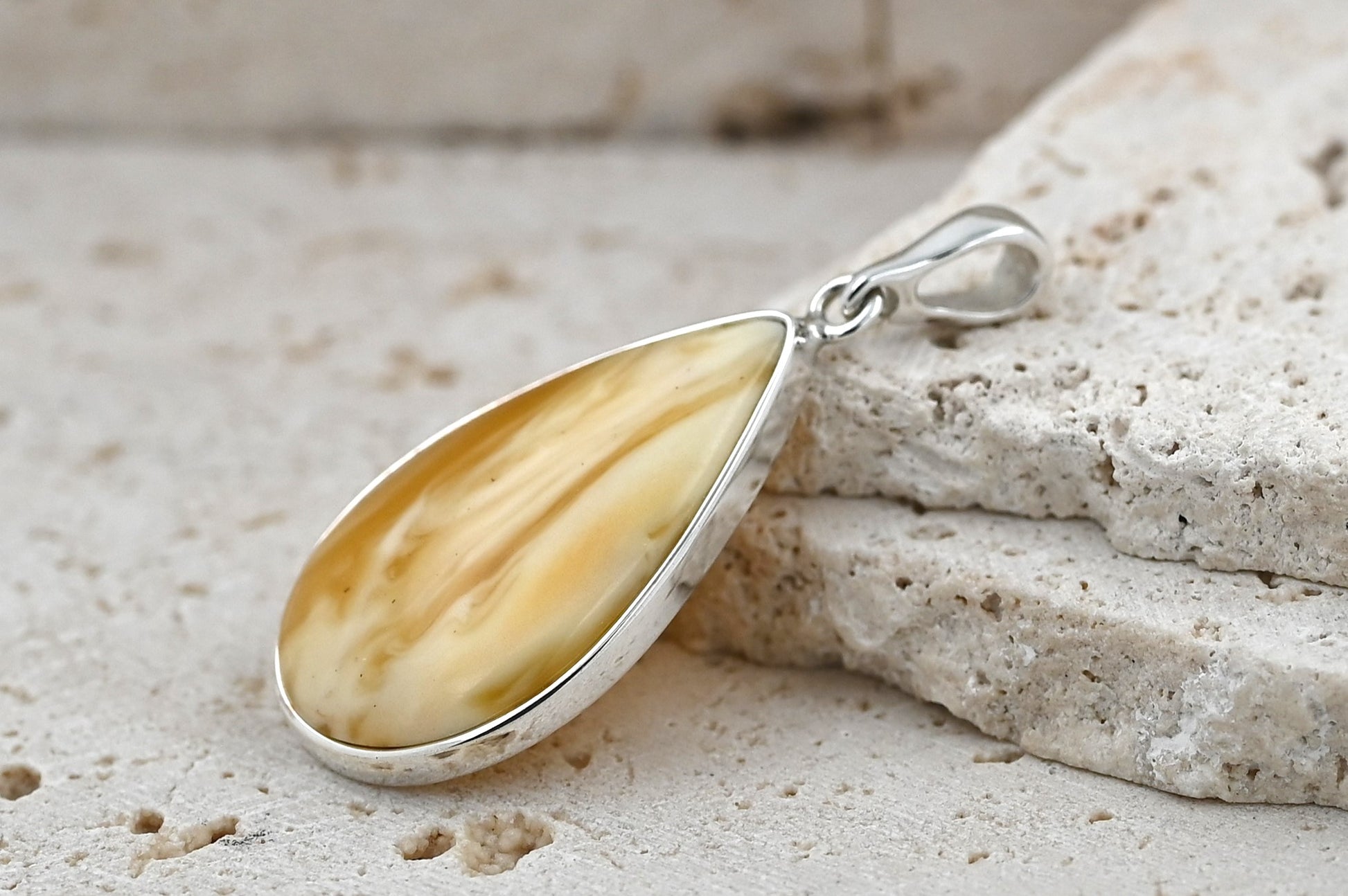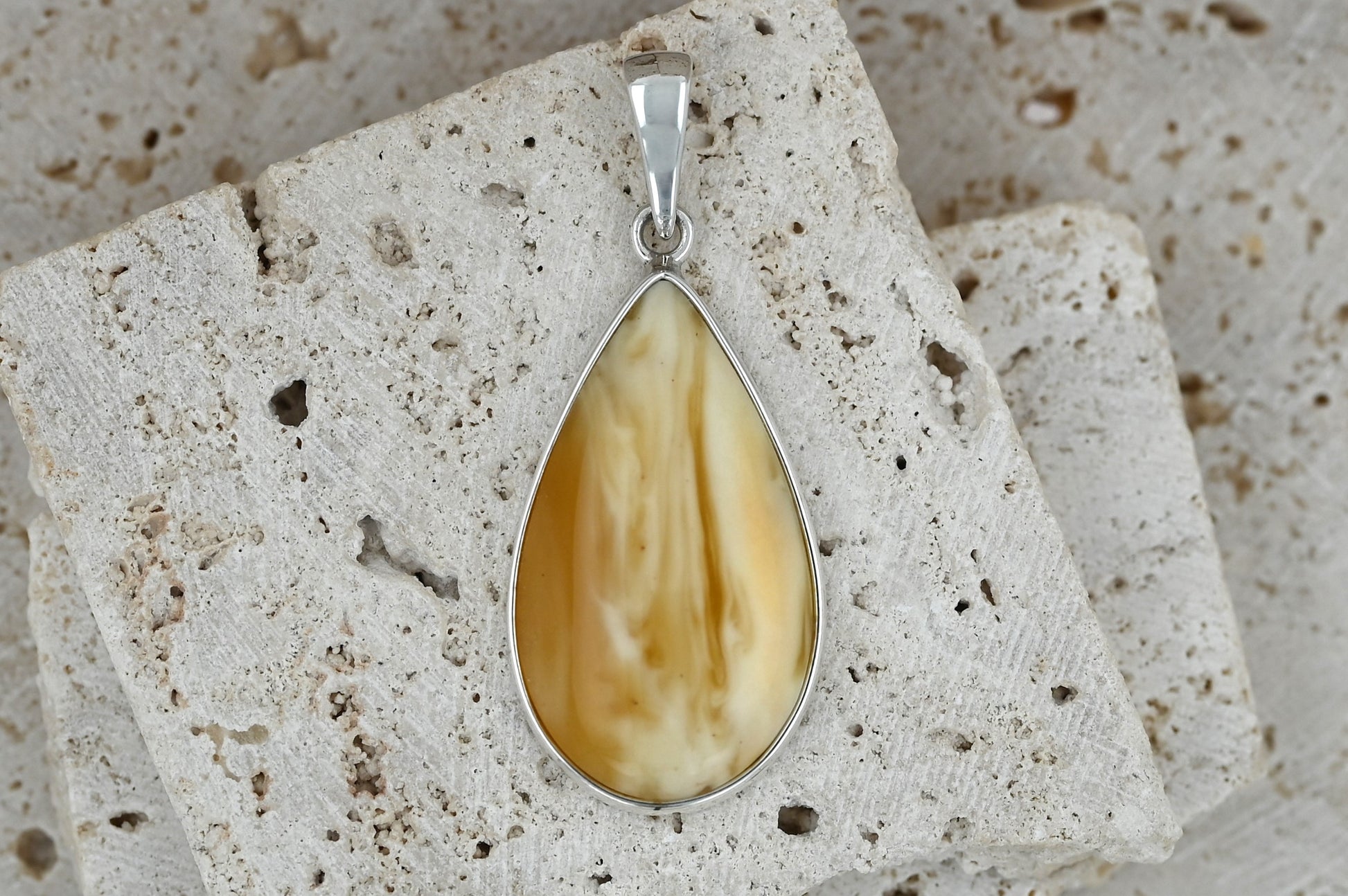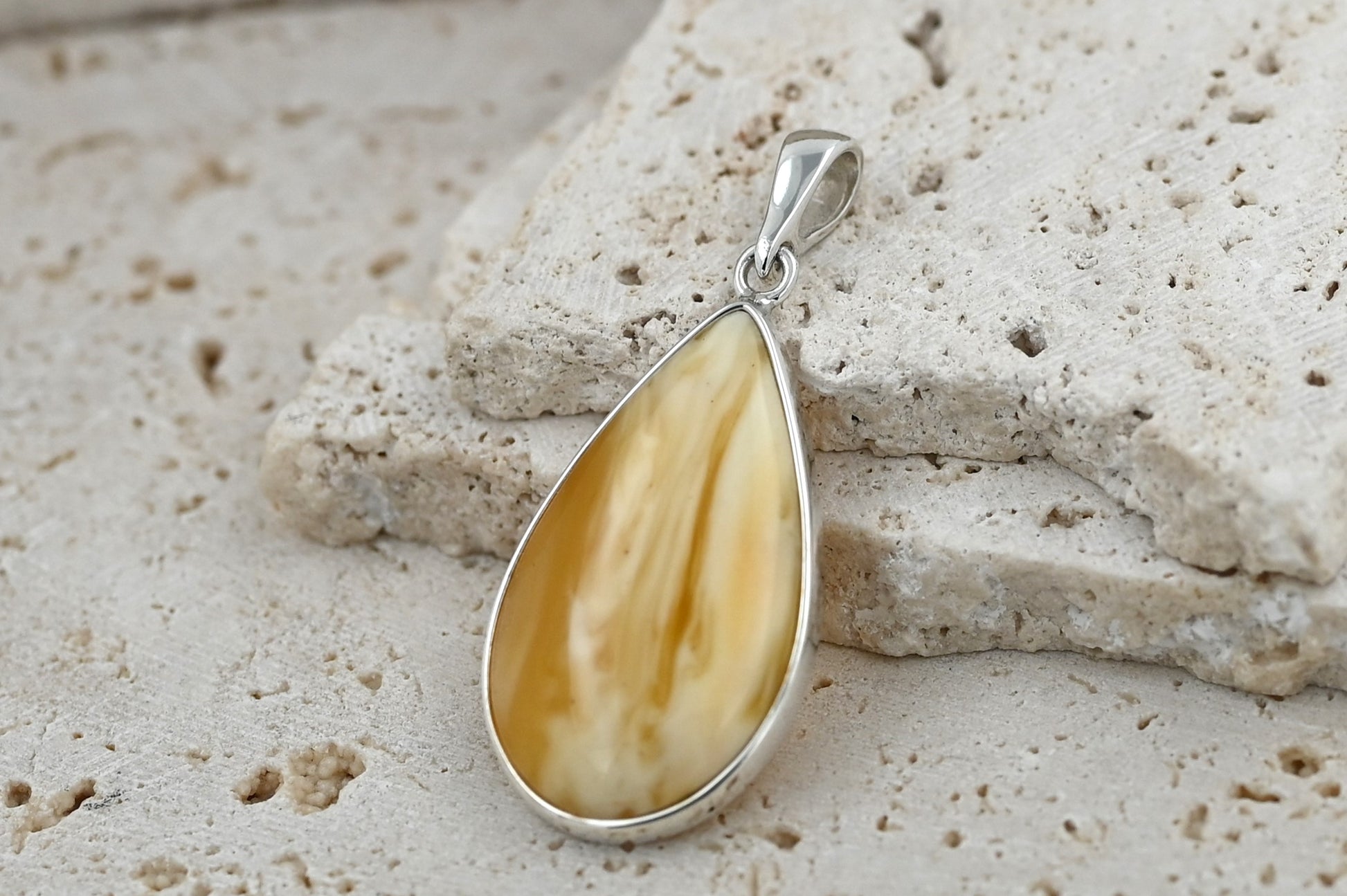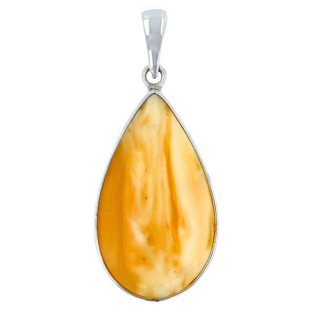Prezentujemy niepowtarzalny wisiorek z mlecznym bursztynem bałtyckim, oprawionym w srebro próby 925. Kamień w kształcie kropli zachwyca unikatowym połączeniem mlecznych i miodowych tonów, które tworzą naturalny, jedyny w swoim rodzaju wzór.