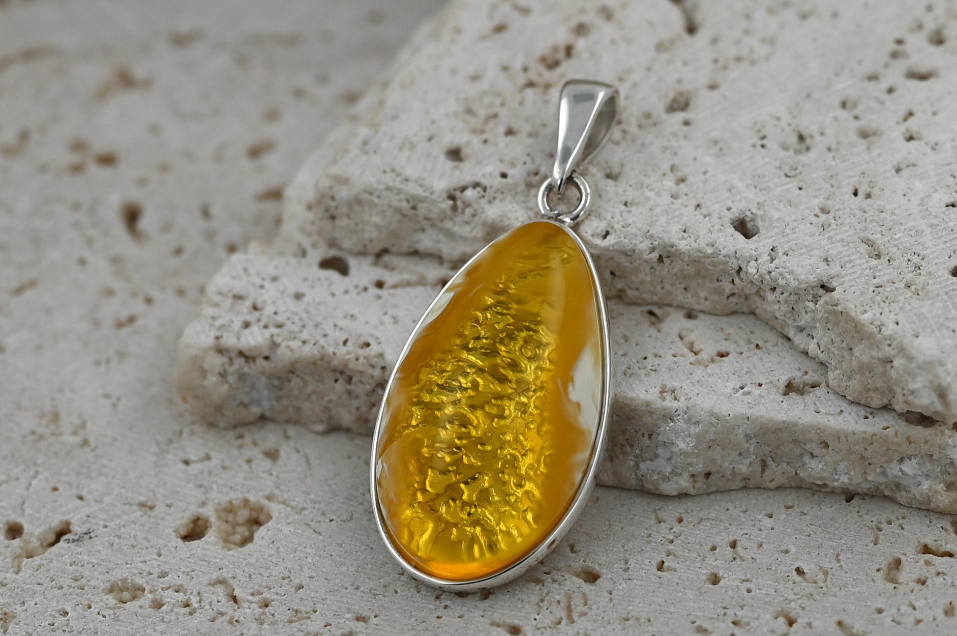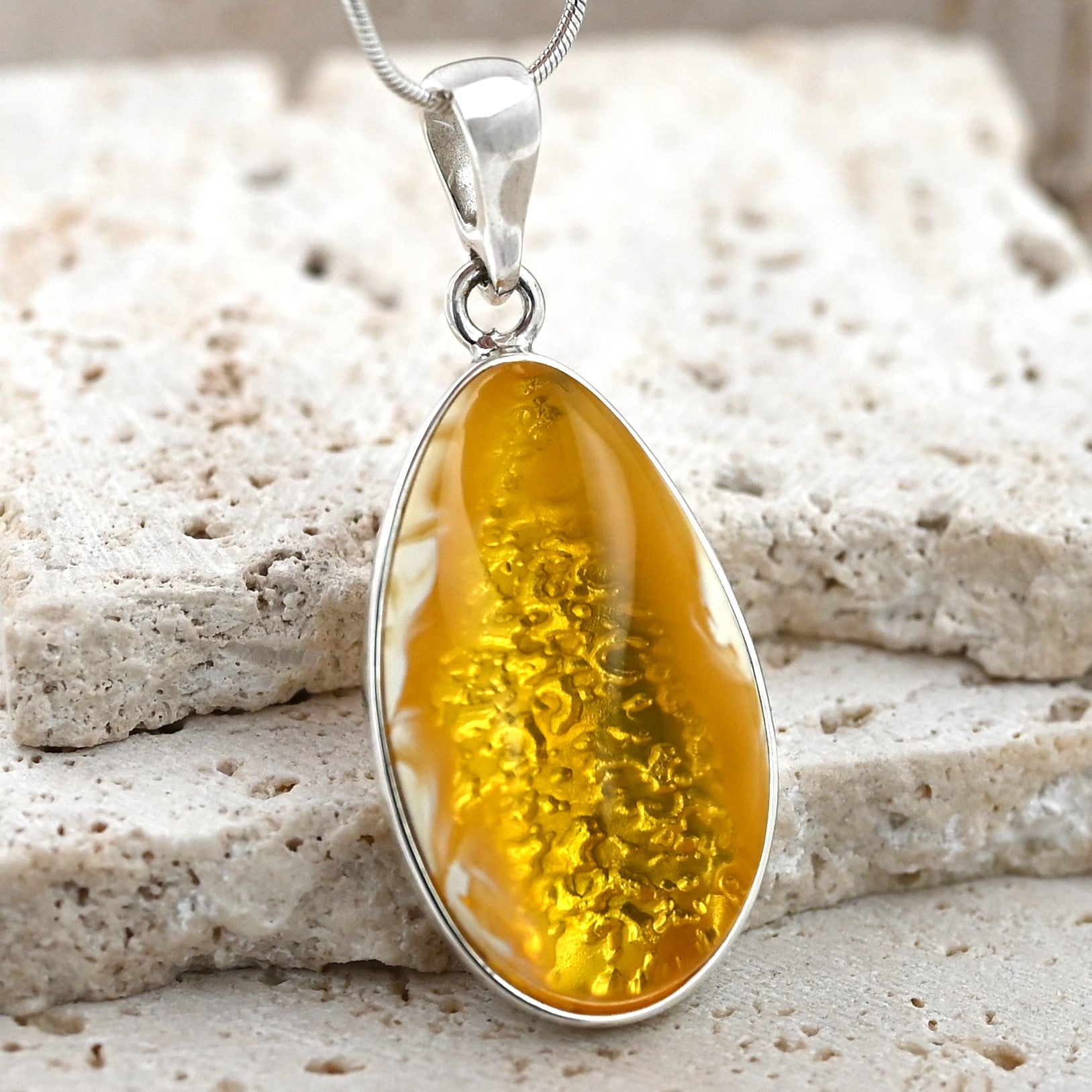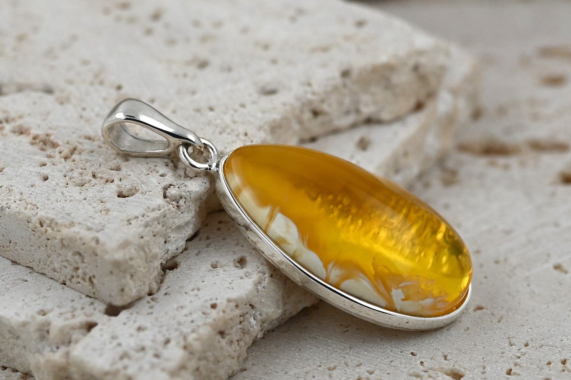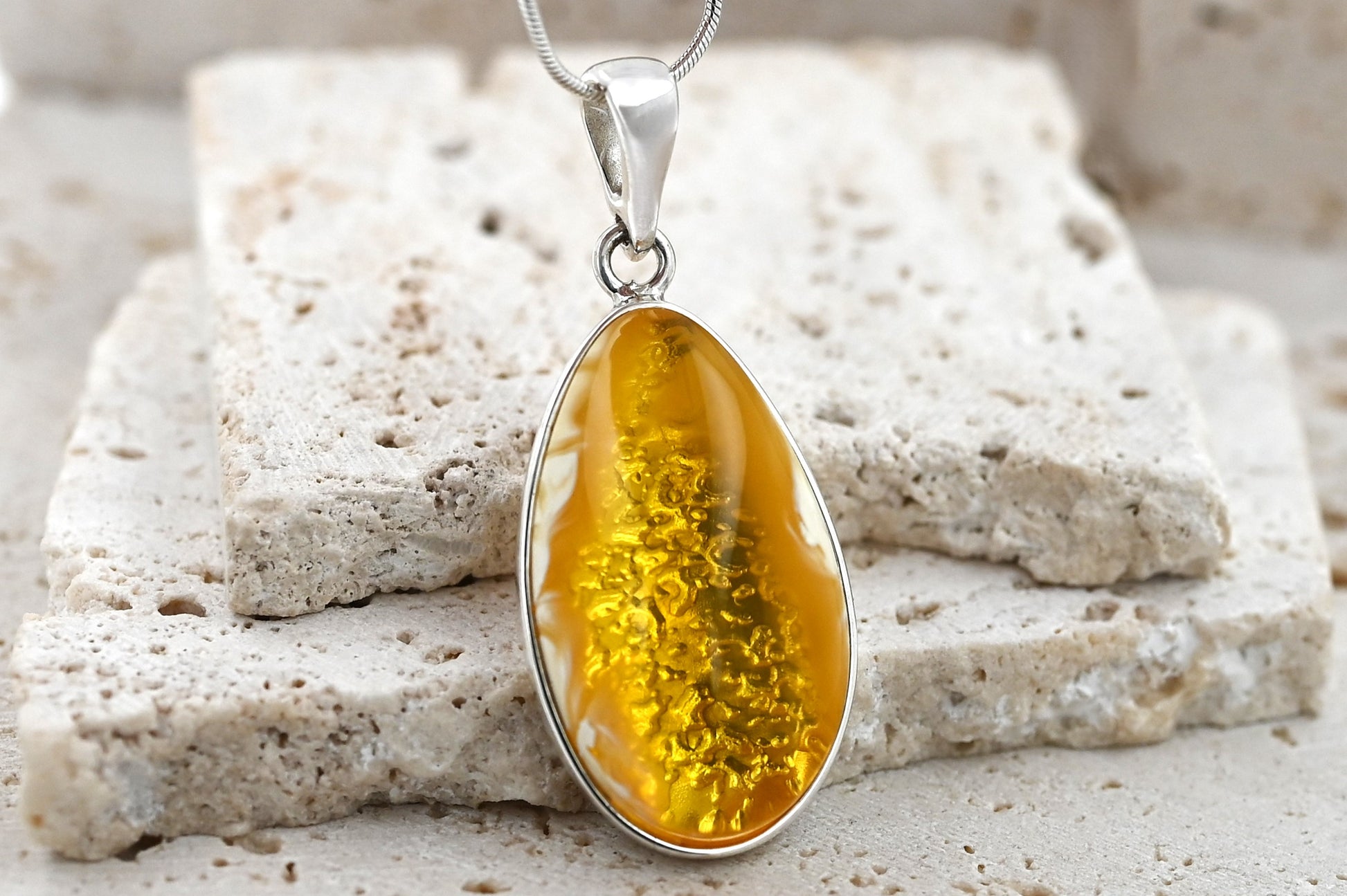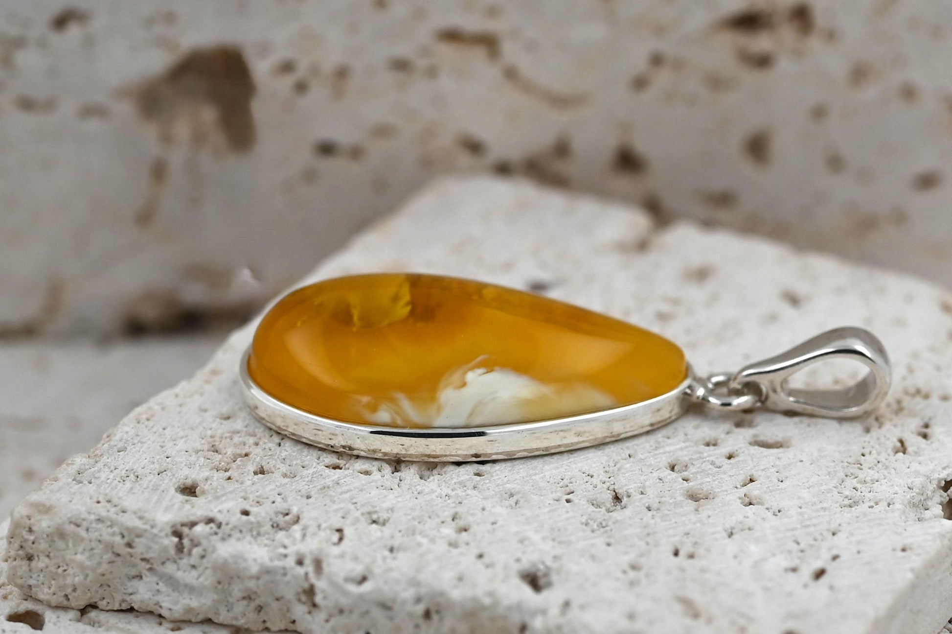 Ten niezwykły wisiorek z naturalnym bursztynem bałtyckim zachwyca swoją niepowtarzalnością. W bursztynie kryją się mleczne mozaiki, które tworzą organiczny, malarski wzór – każdy kamień to małe dzieło sztuki natury.