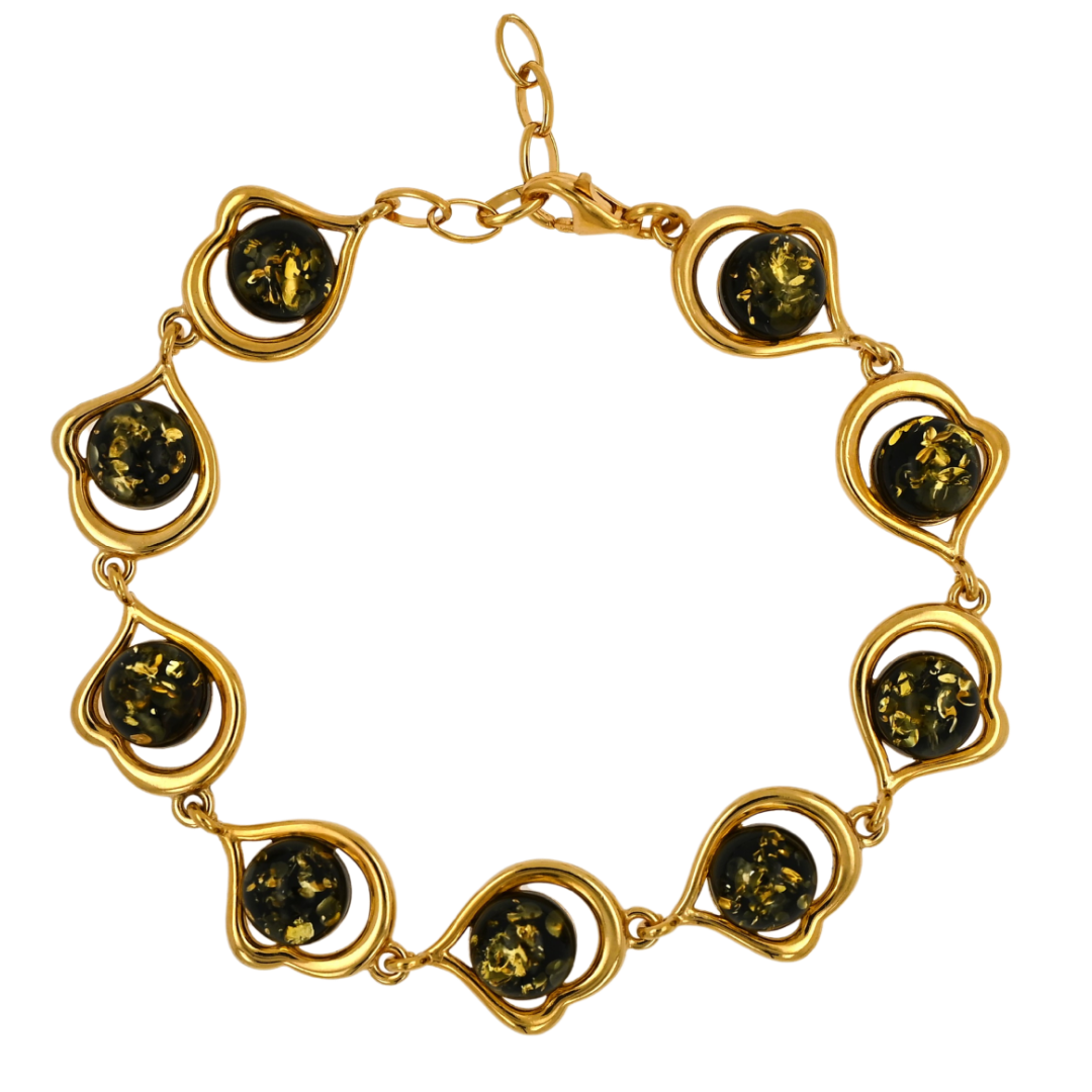 Podaruj wyjątkowy prezent pełen ciepła i blasku ✨ Ta elegancka bransoletka w kształcie serca łączy naturalny, zielony bursztyn z luksusową, pozłacaną oprawą ze srebra 925, tworząc biżuterię pełną romantyzmu i elegancji.