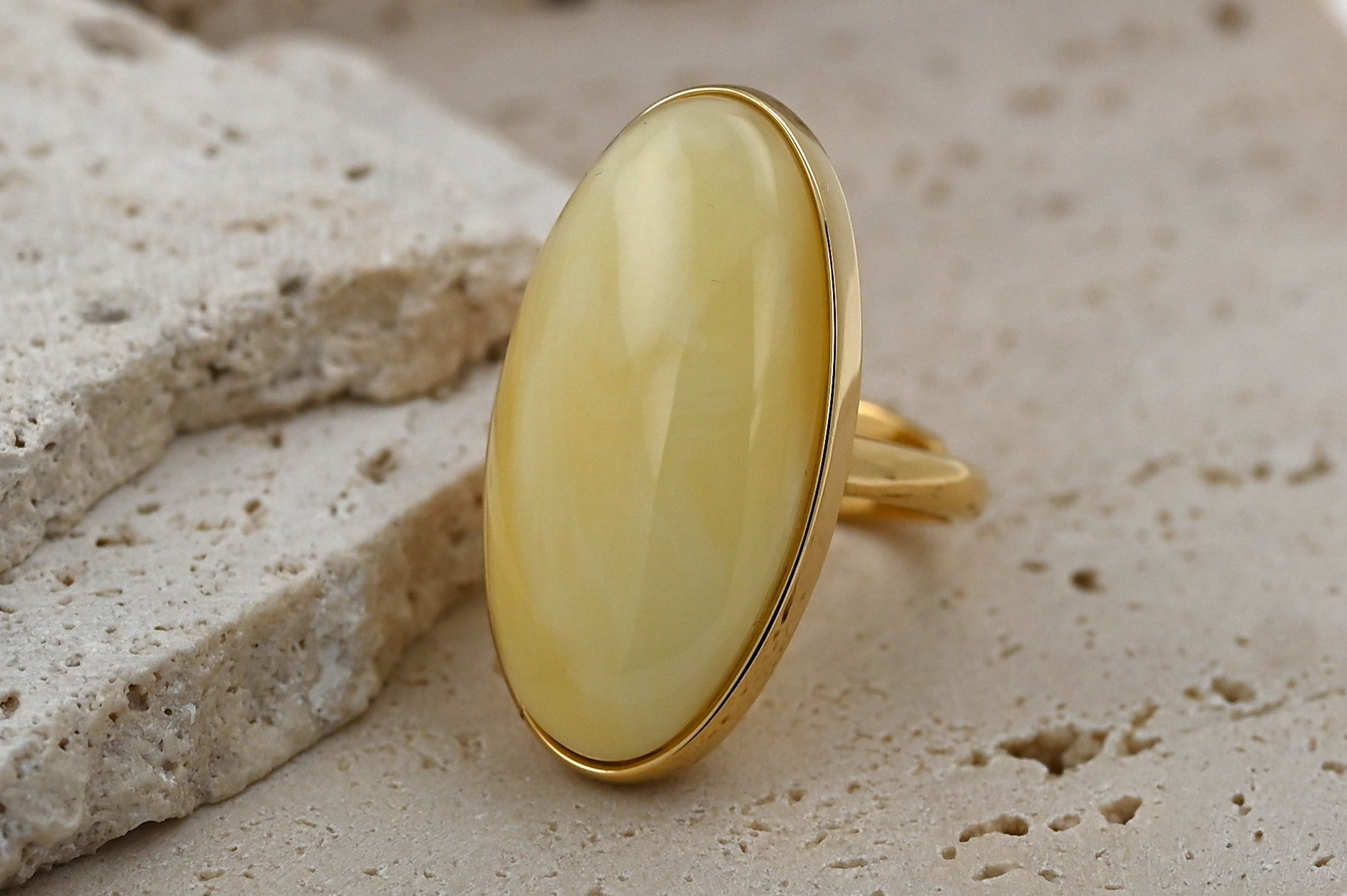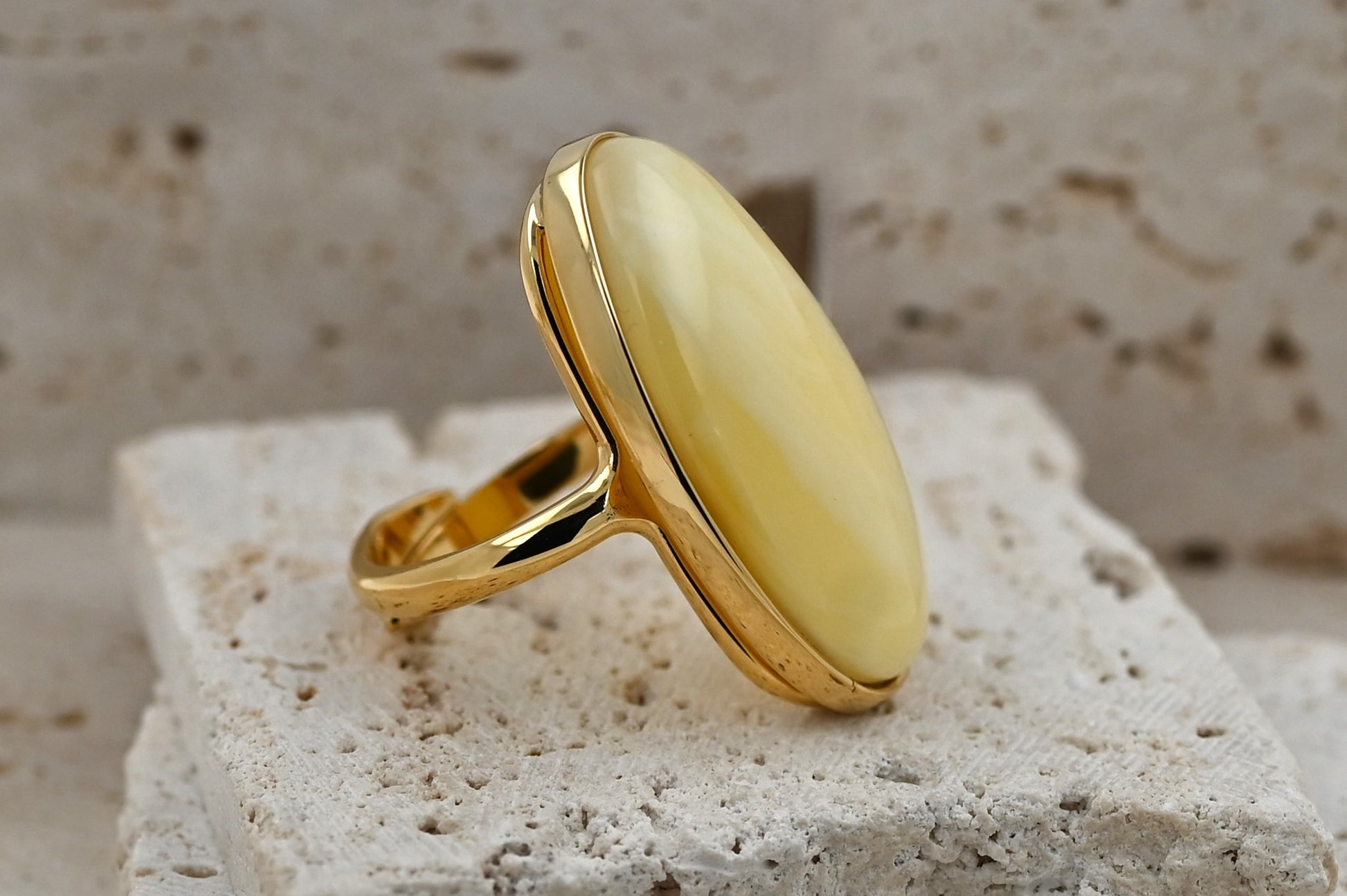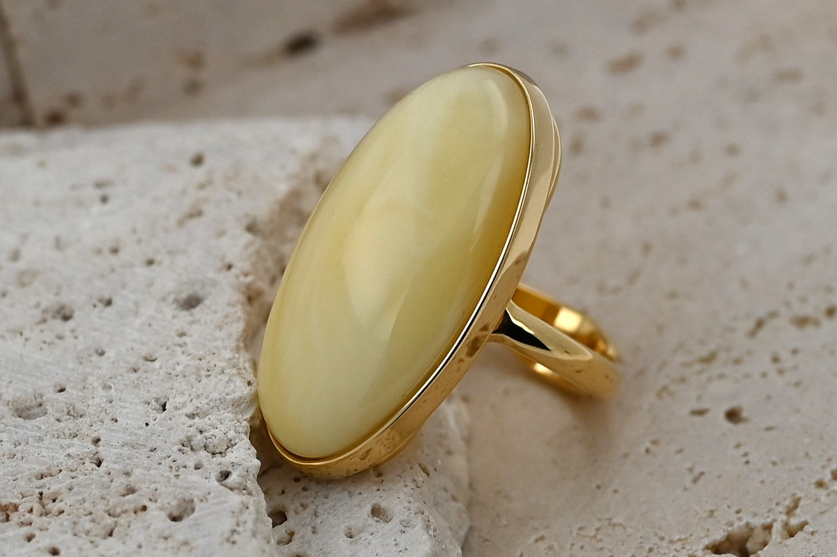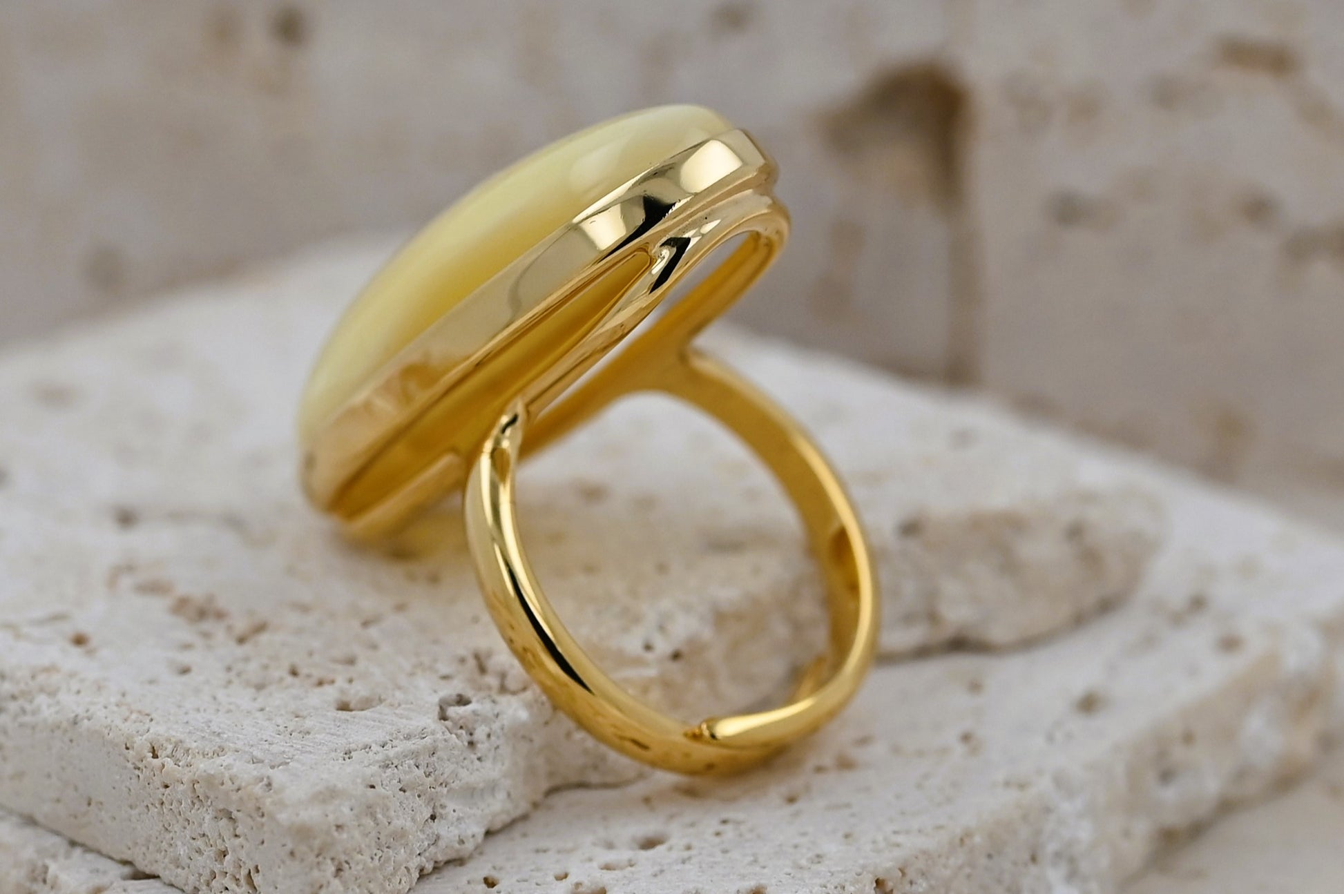 Duży Unikatowy Pierścionek Mleczny Bursztynowy, Unikat, Pozłacane Srebro 925