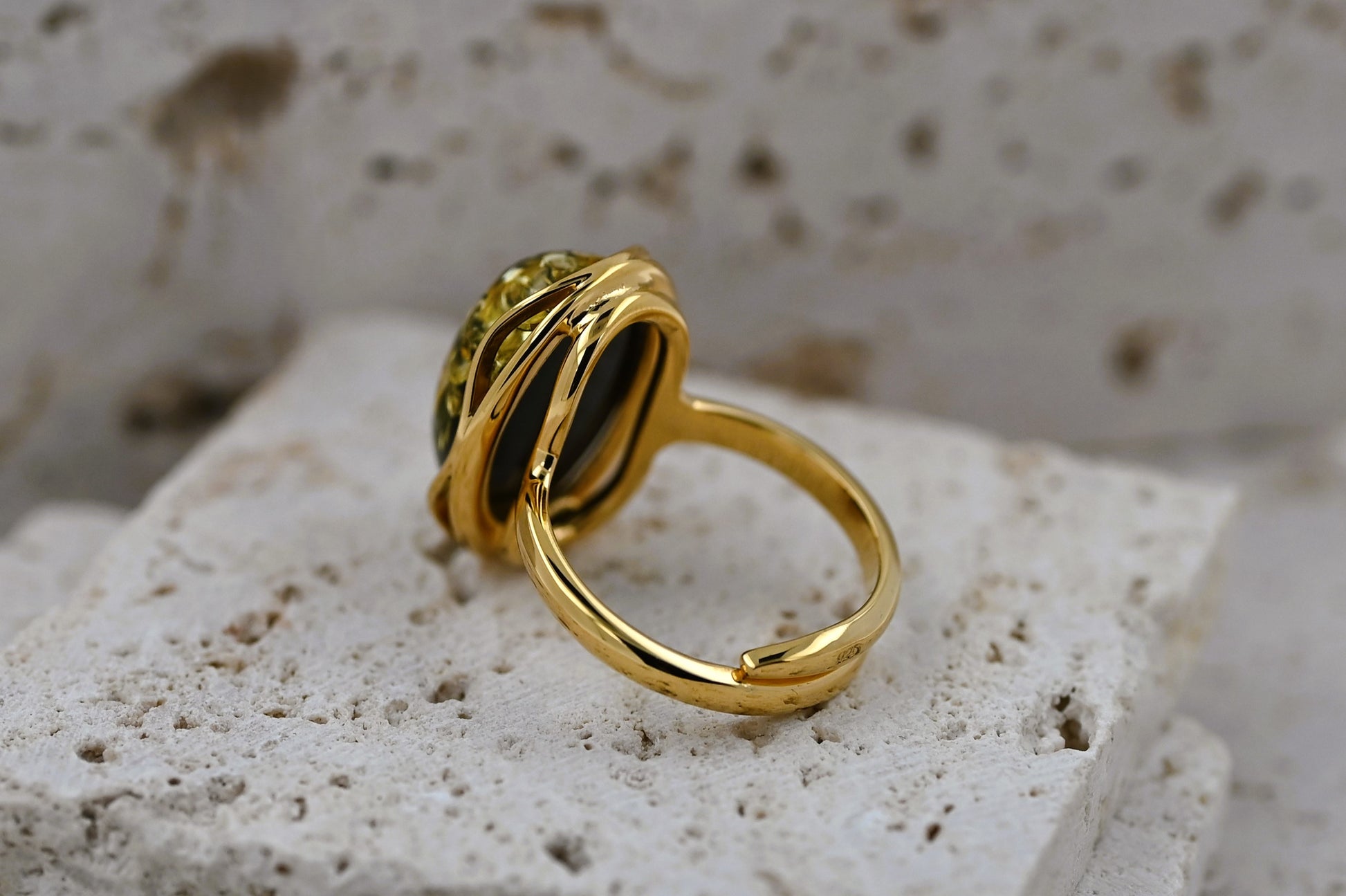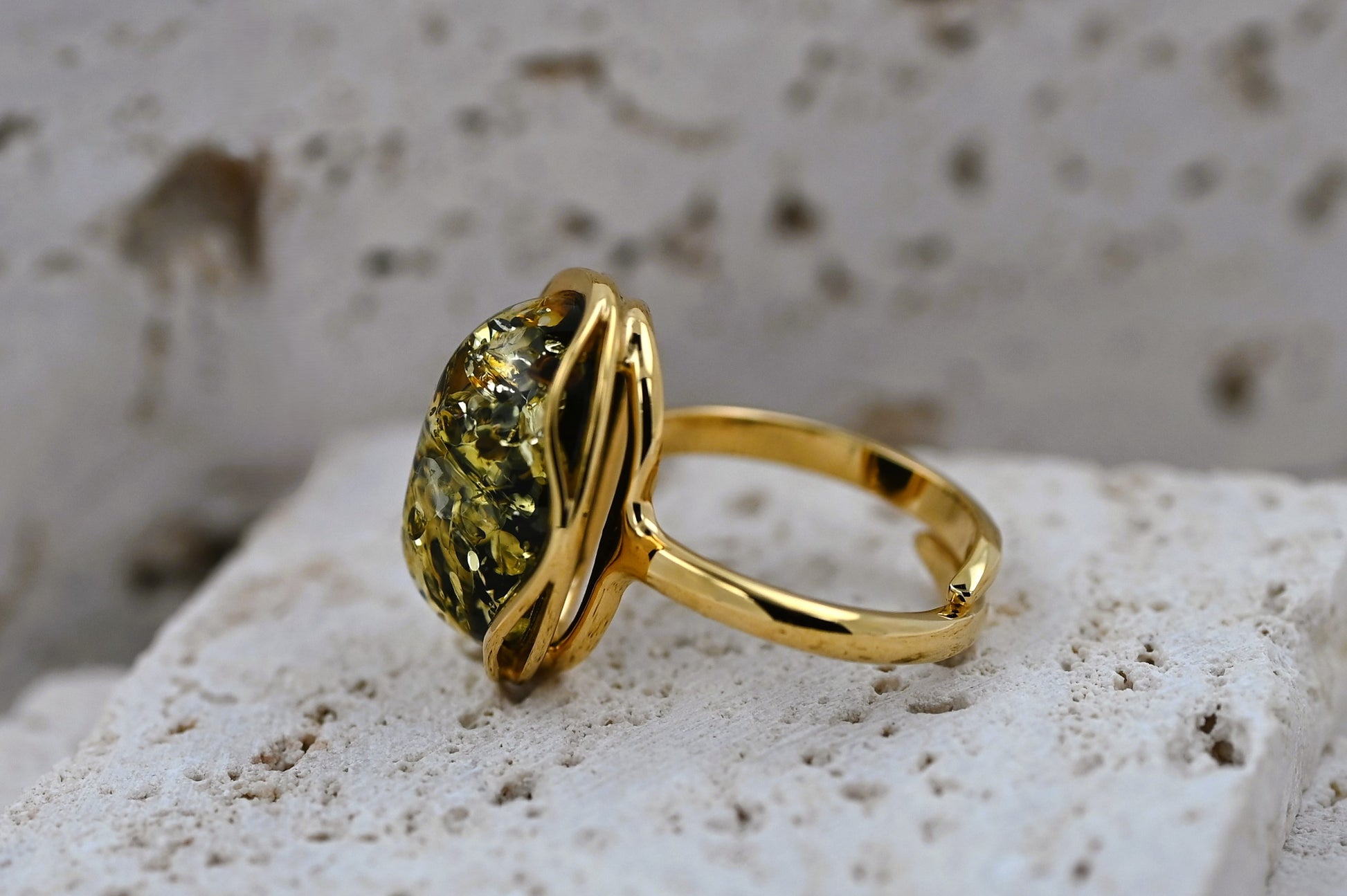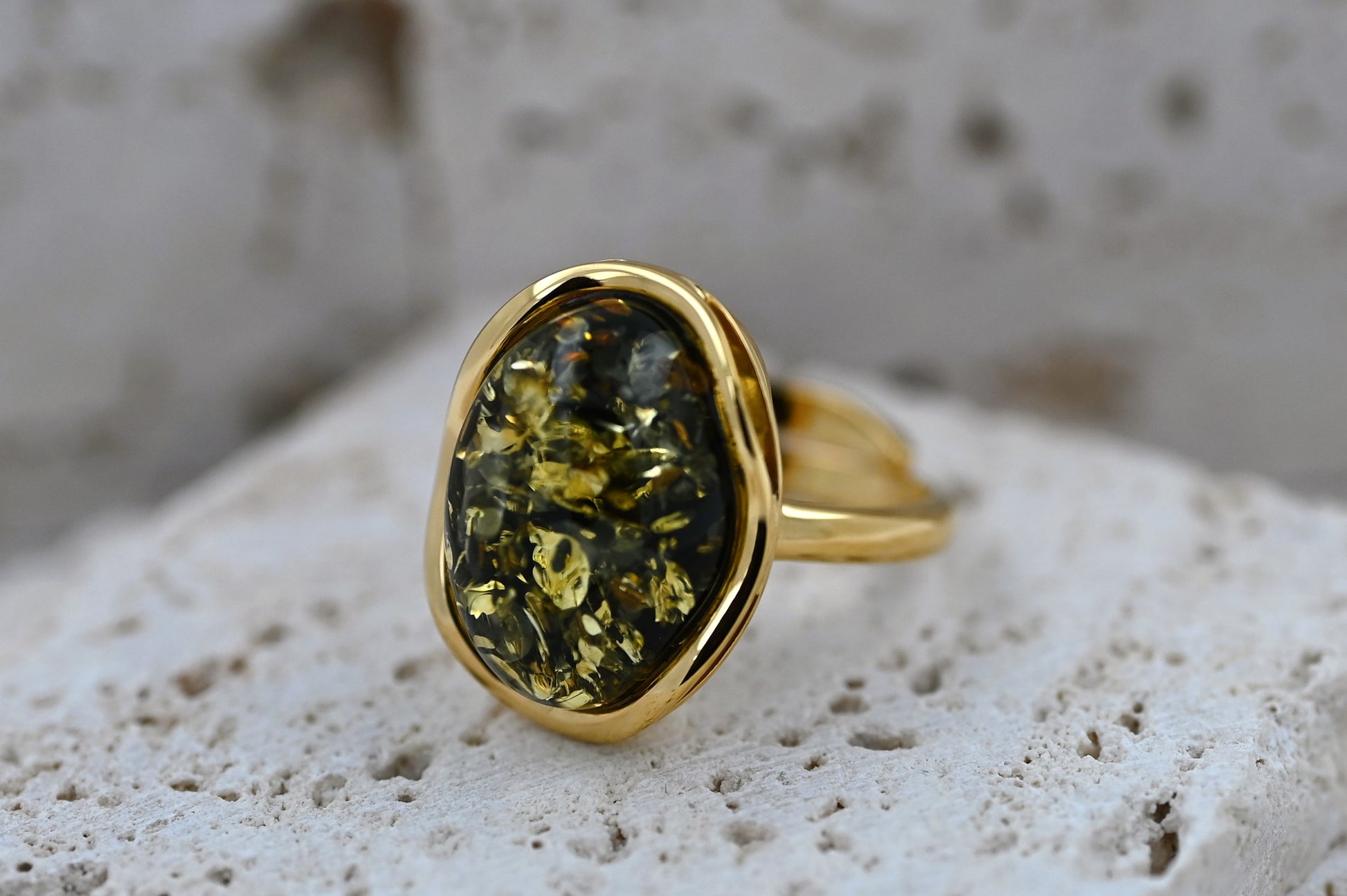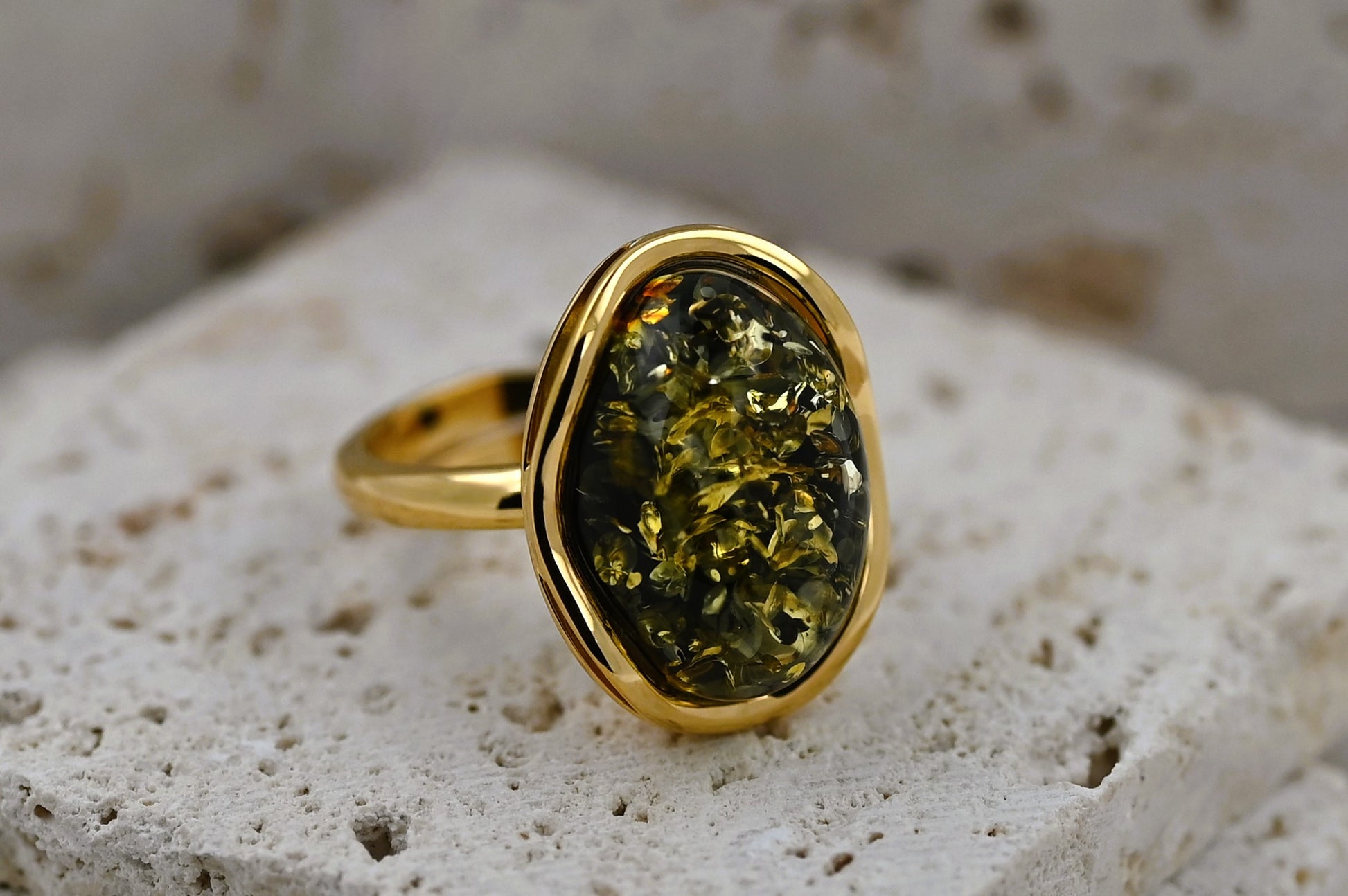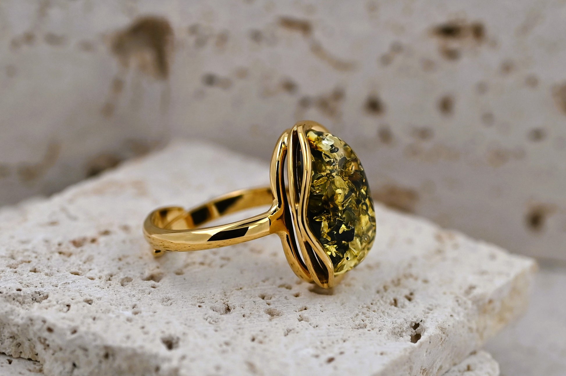Pierścień Bursztynowa Fala, Zielony, Pozłacane srebro