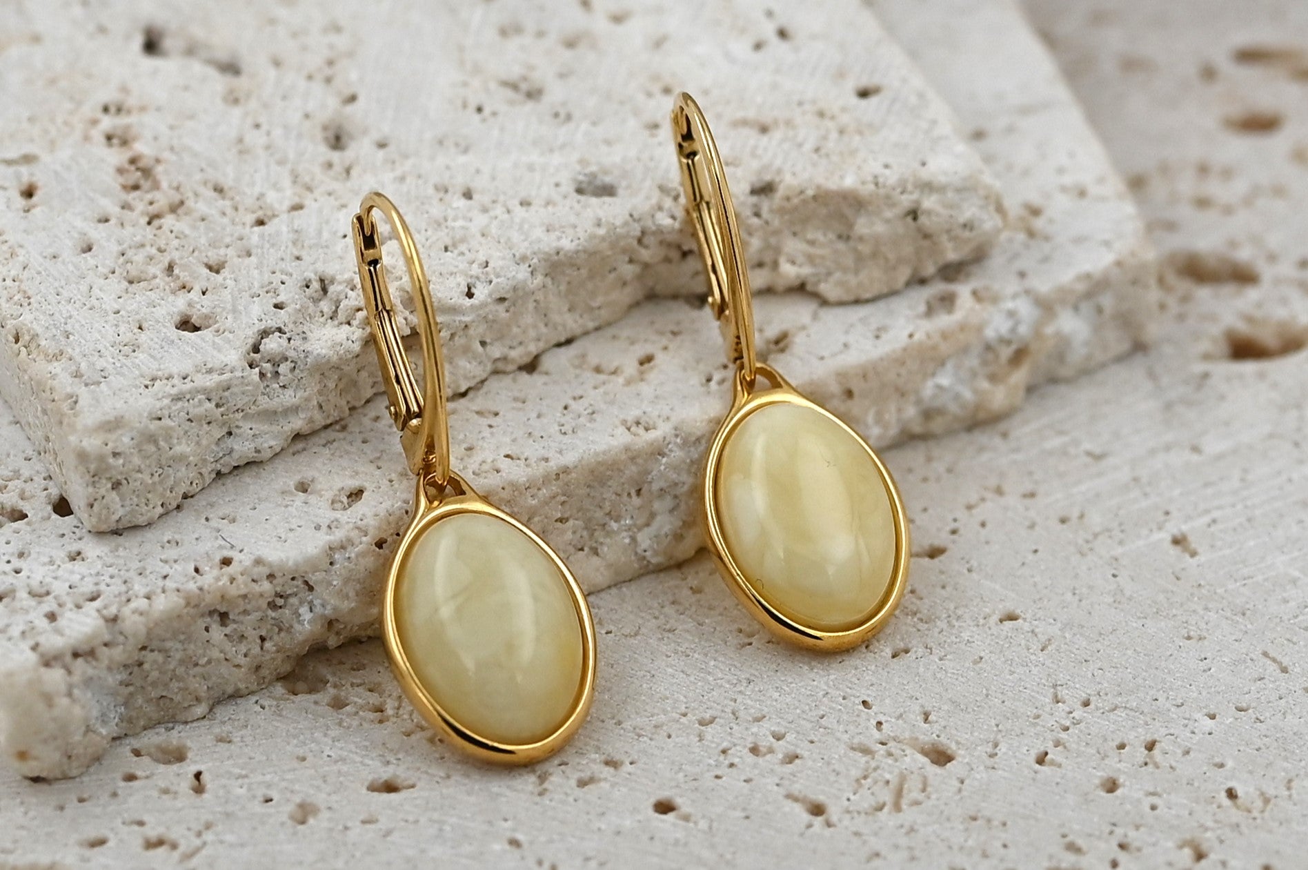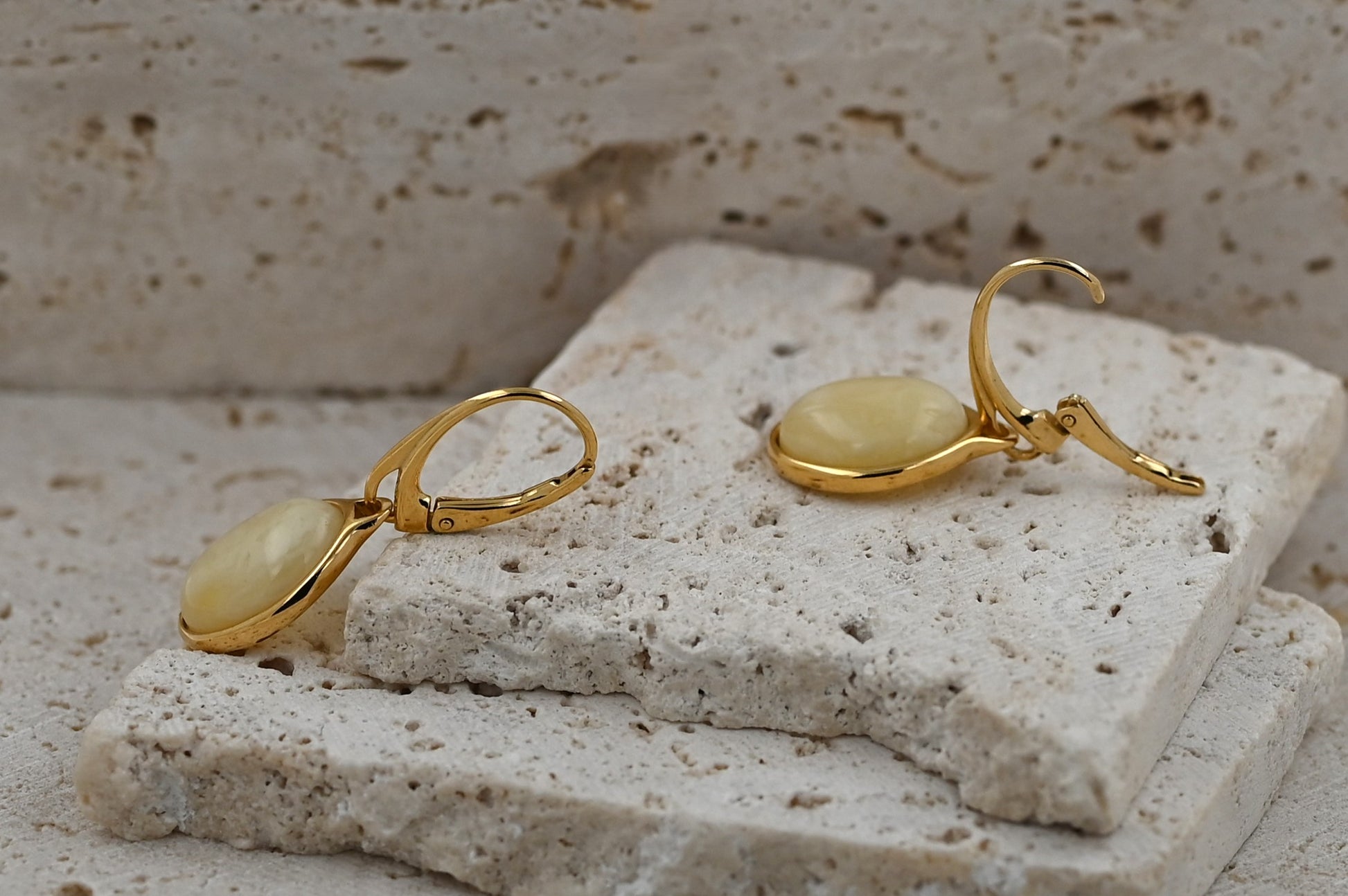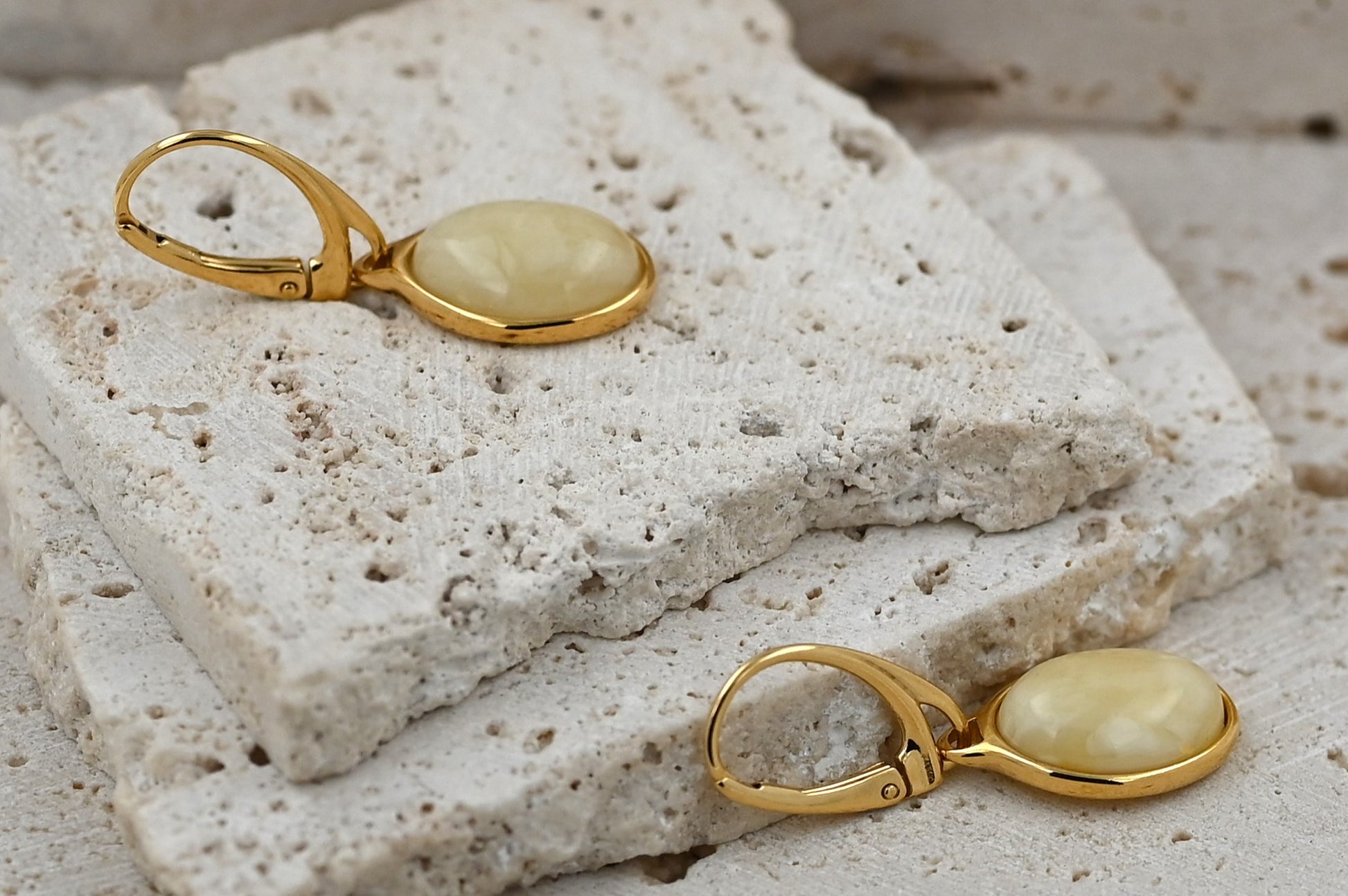 Prezentujemy kolczyki z mlecznym bursztynem bałtyckim w eleganckiej oprawie z pozłacanego srebra 925.