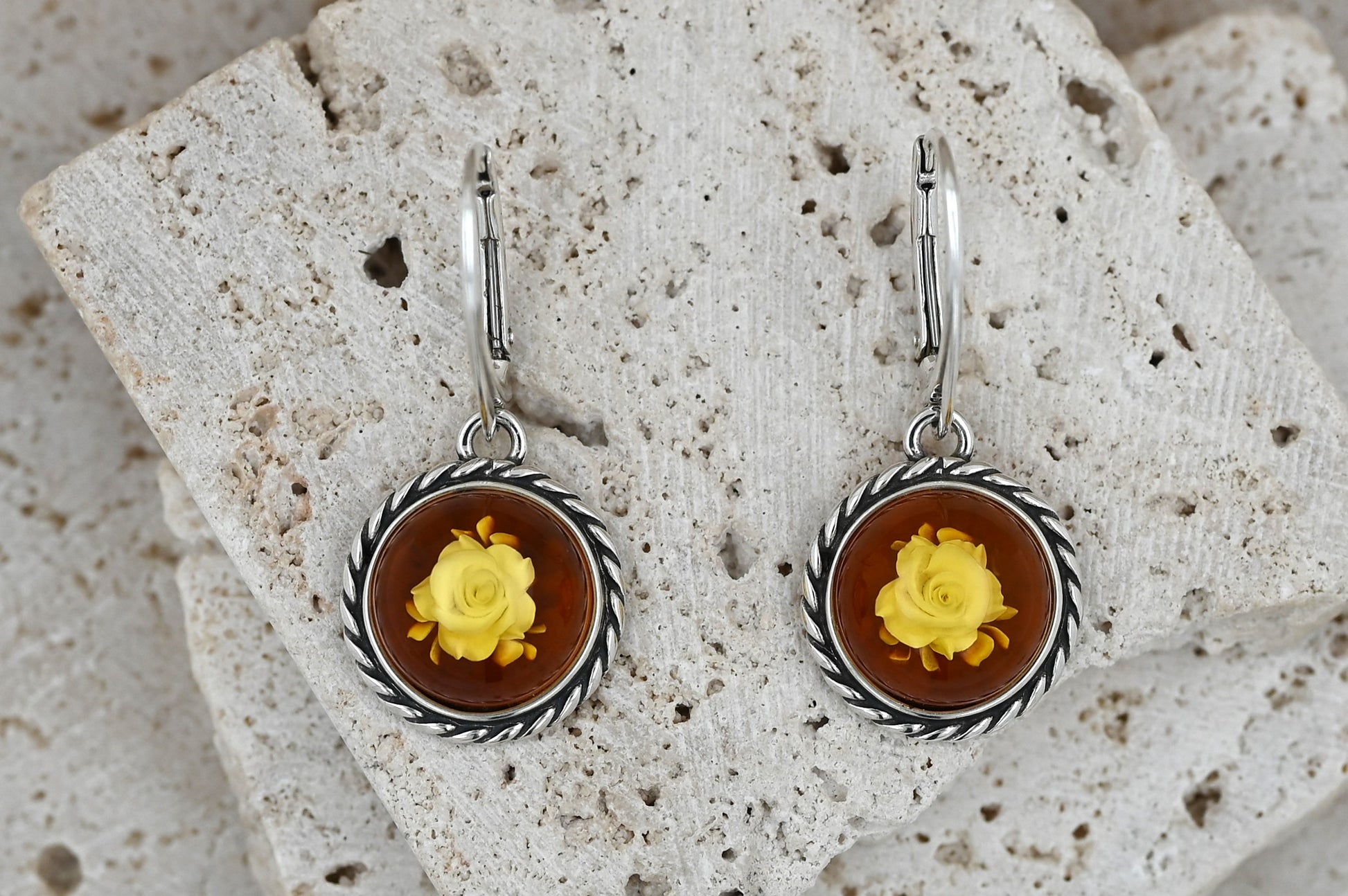 Kolczyki z Bursztynem i Rzeźbioną Różą Cameo | Srebro 925 | Elegancka Biżuteria