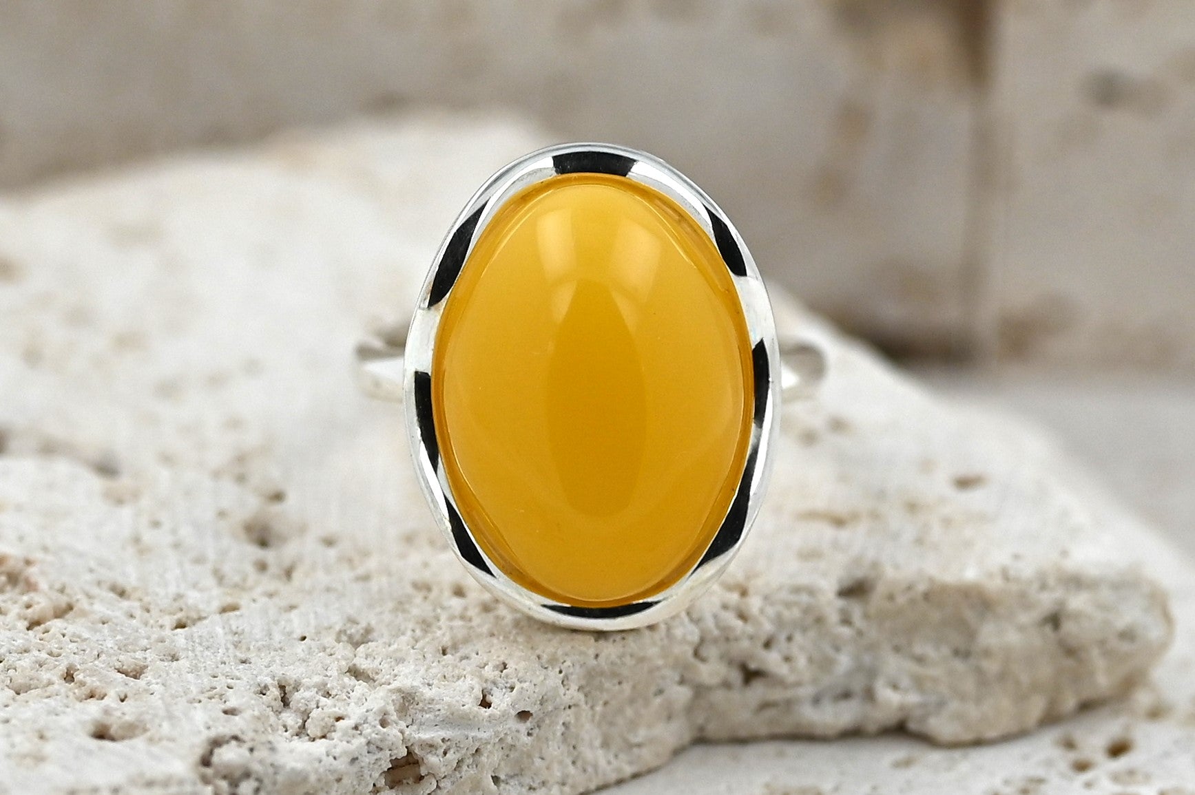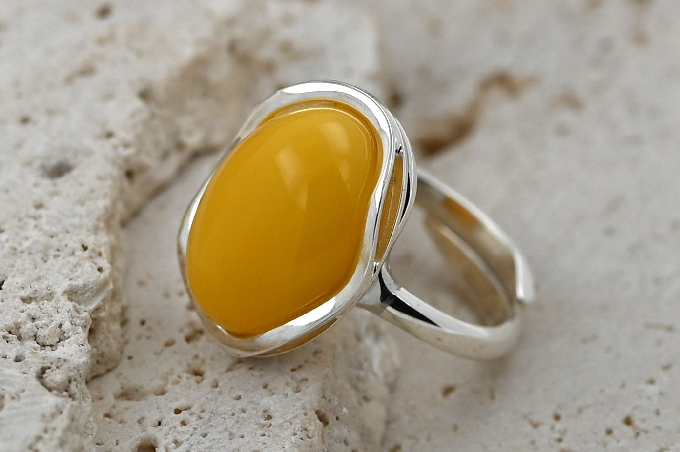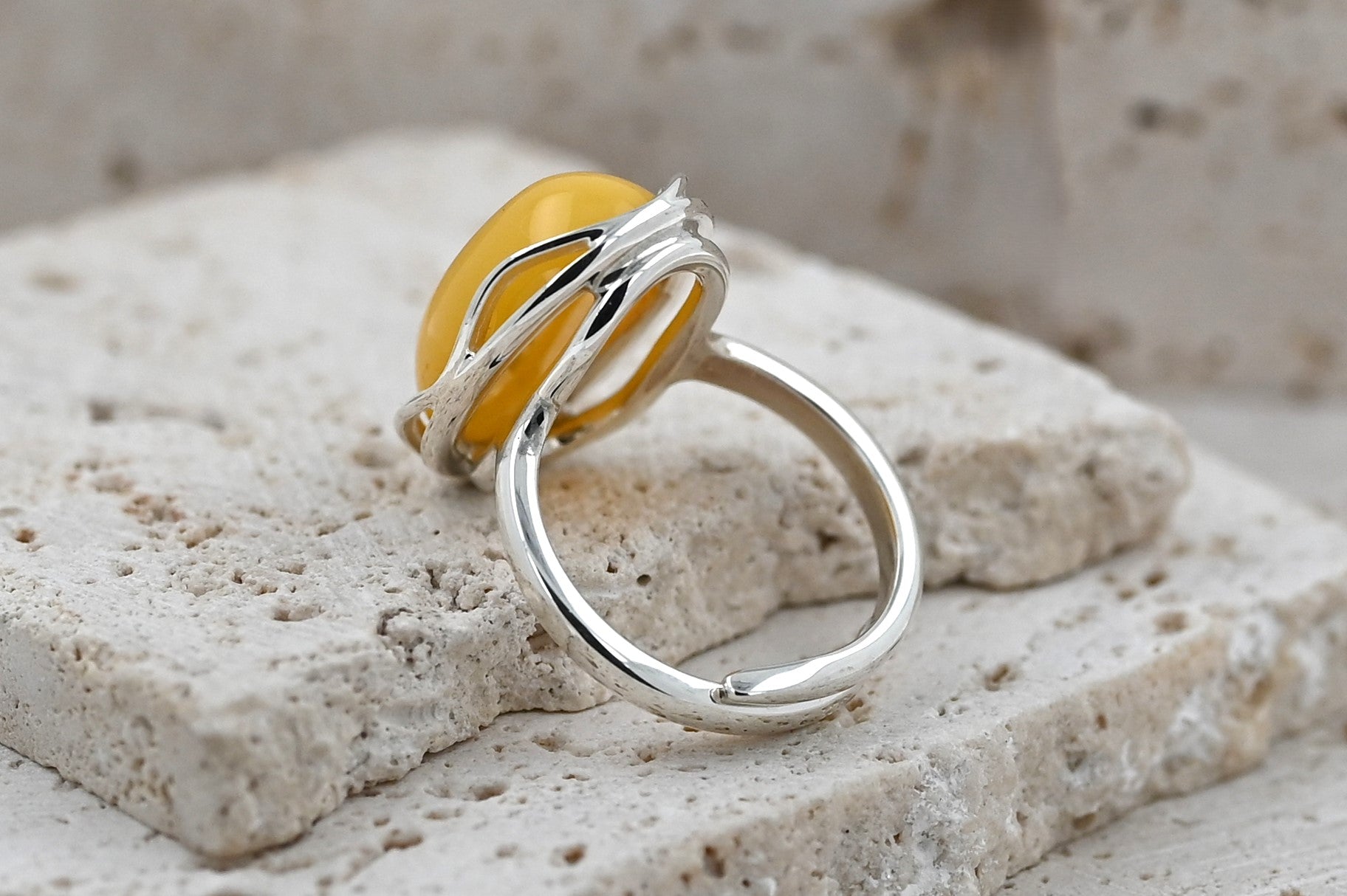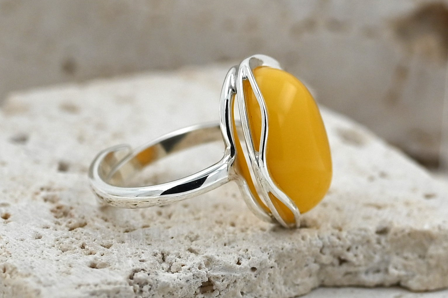 Ten wyjątkowy pierścionek zdobi mleczno-żółty bursztyn bałtycki, ceniony za swoją ciepłą, słoneczną barwę i niepowtarzalny charakter. Każdy kamień jest tworzony przez naturę, dlatego nie ma dwóch identycznych egzemplarzy – Twój pierścionek będzie naprawdę wyjątkowy.