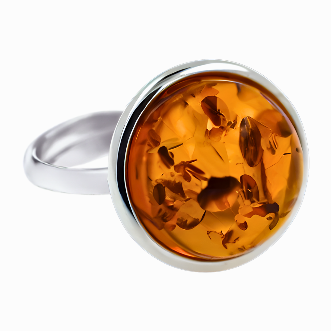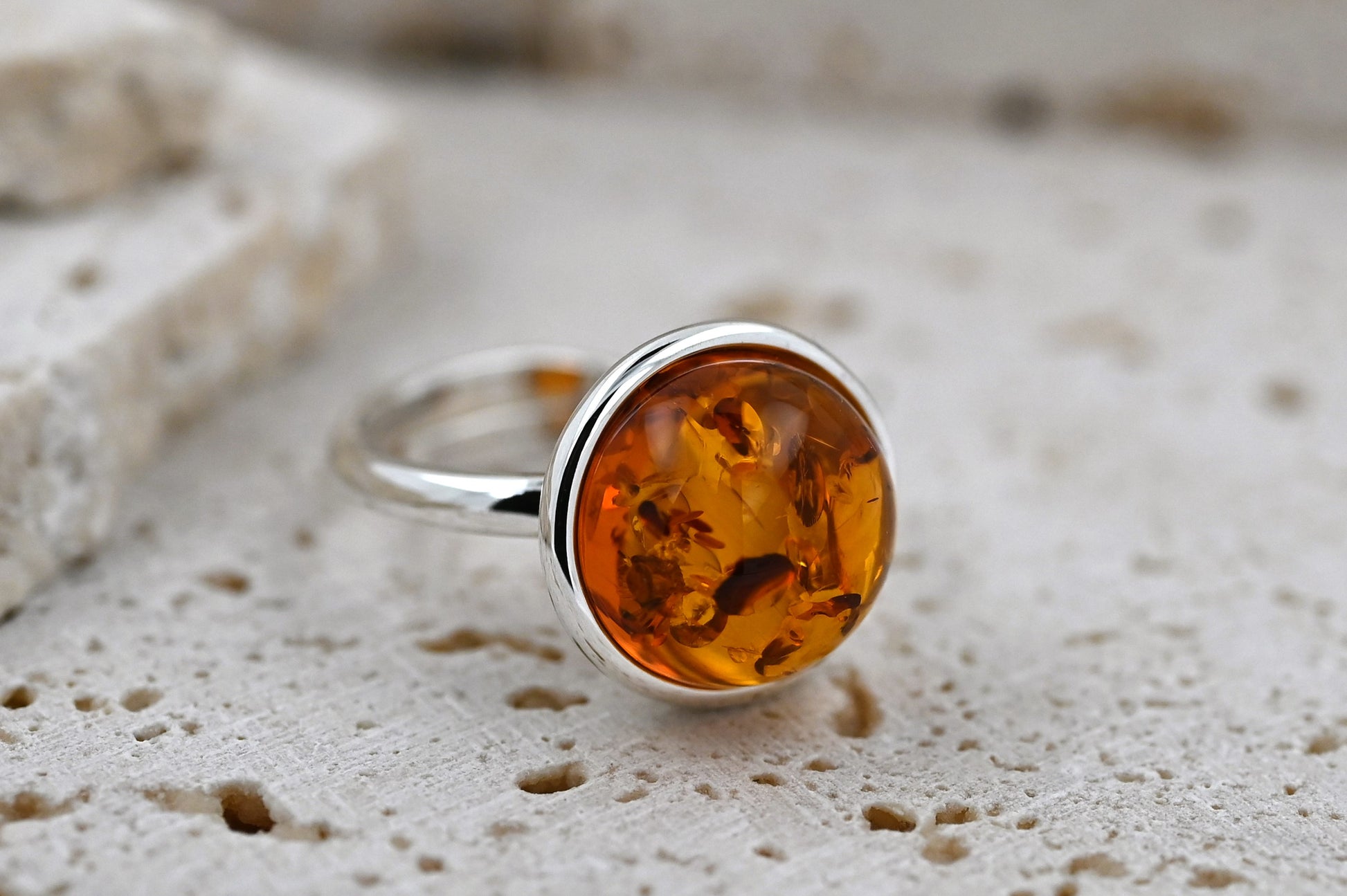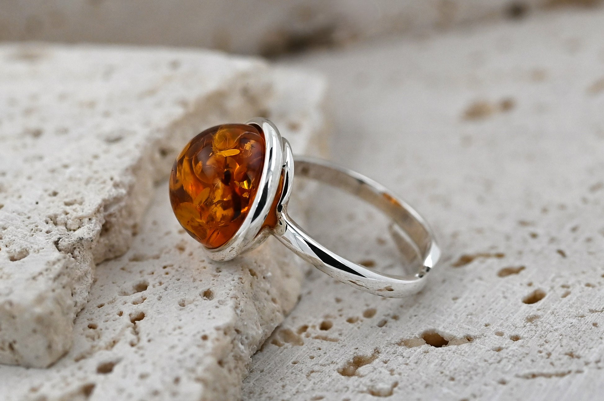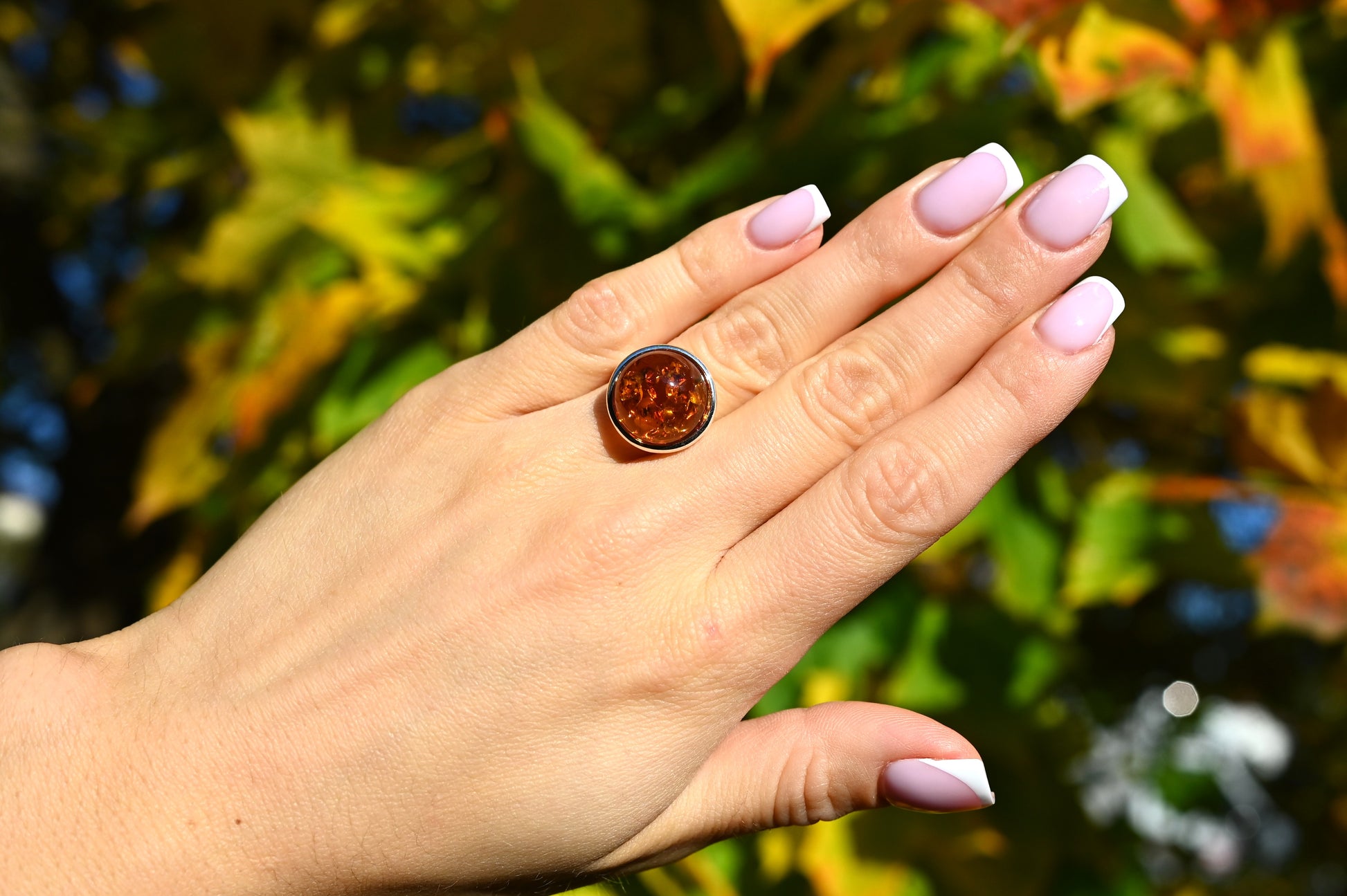 Podkreśl swój wyjątkowy styl z pierścionkiem z naturalnym bursztynem bałtyckim w odcieniu koniaku, oprawionym w szlachetne srebro próby 925.