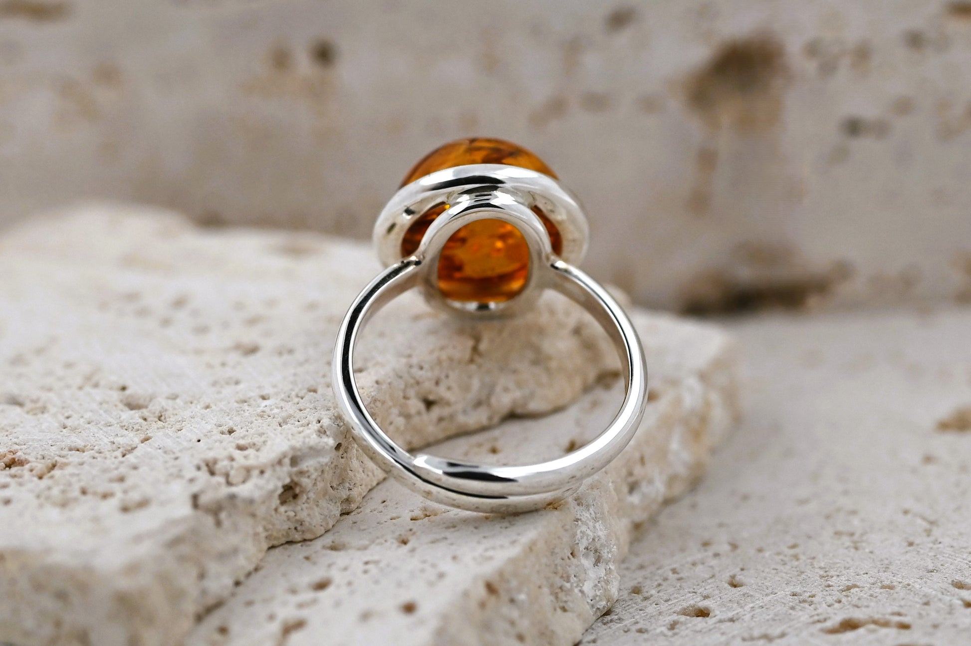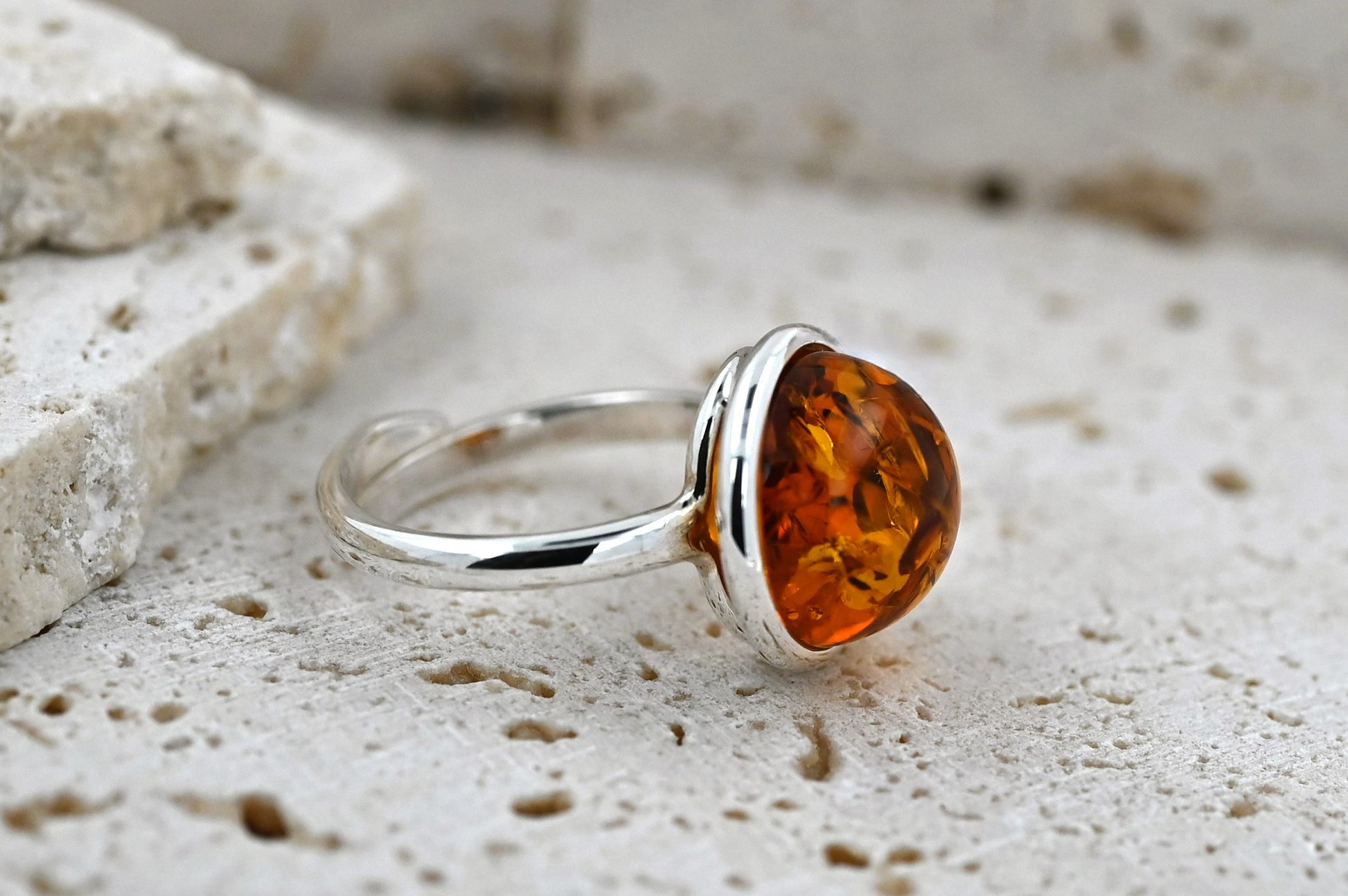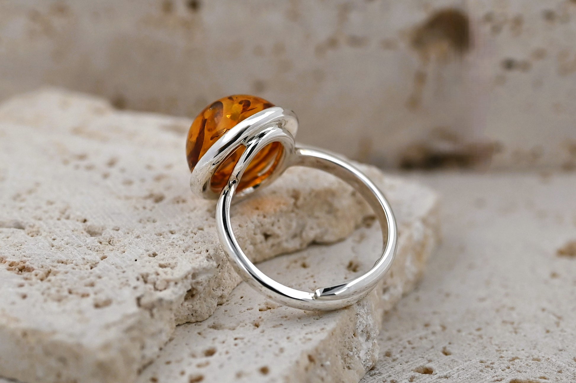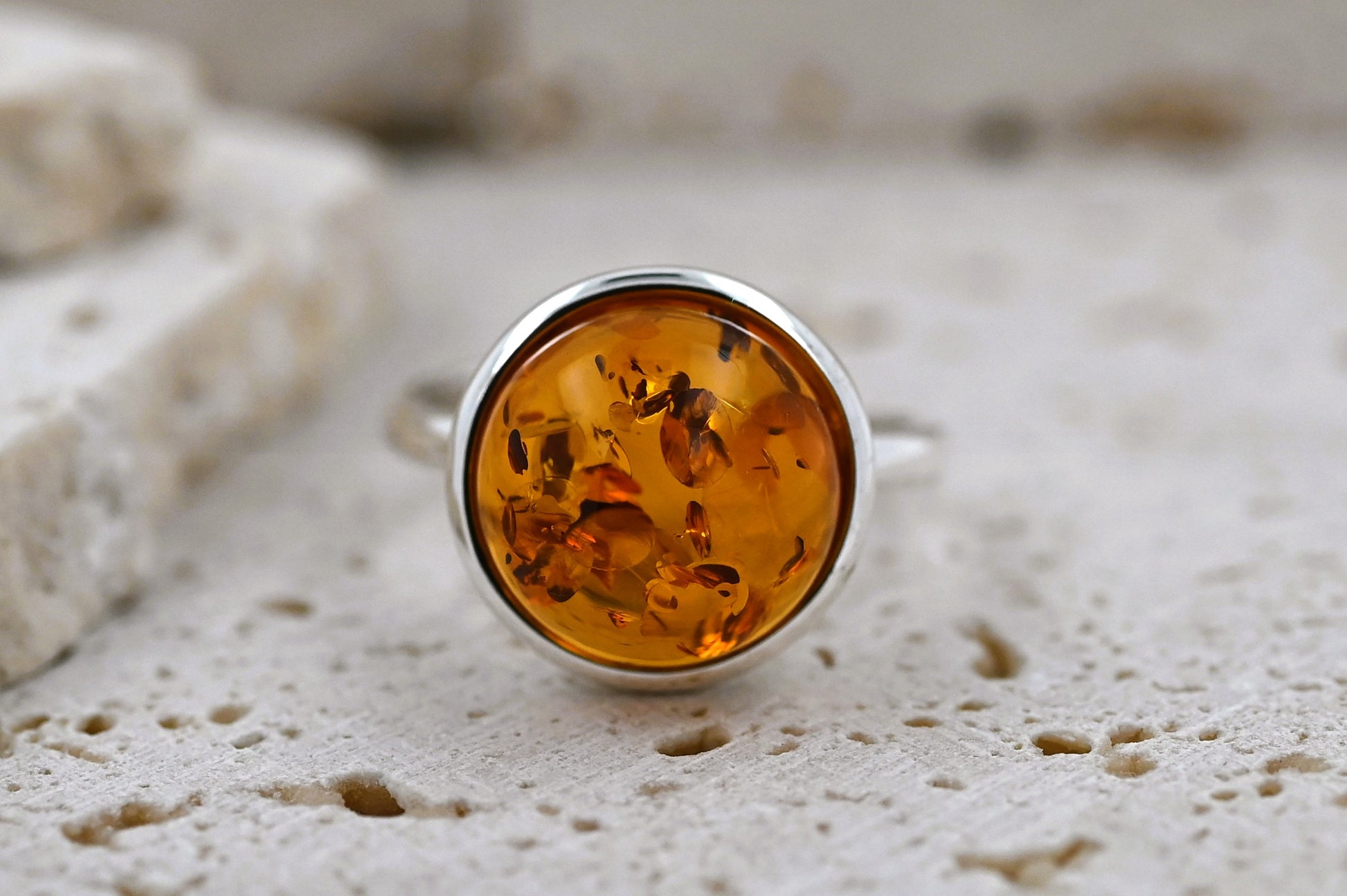 Podkreśl swój wyjątkowy styl z pierścionkiem z naturalnym bursztynem bałtyckim w odcieniu koniaku, oprawionym w szlachetne srebro próby 925.