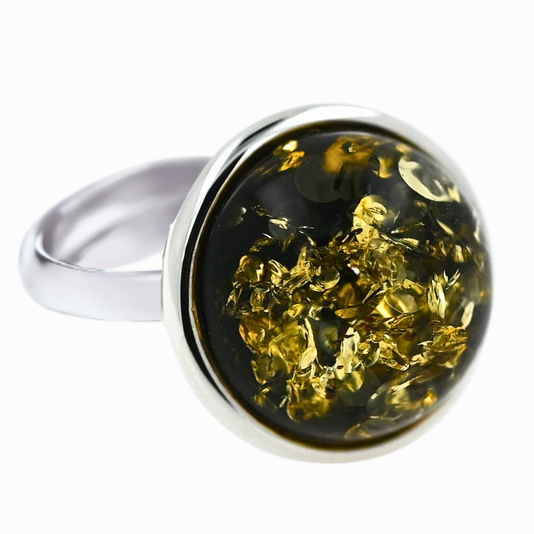Odkryj wyjątkowe piękno pierścionka "Bursztynowa Aura". Głęboki, zielony bursztyn zachwyca swoim naturalnym urokiem, a srebro próby 925 podkreśla jego wyjątkową barwę i strukturę.