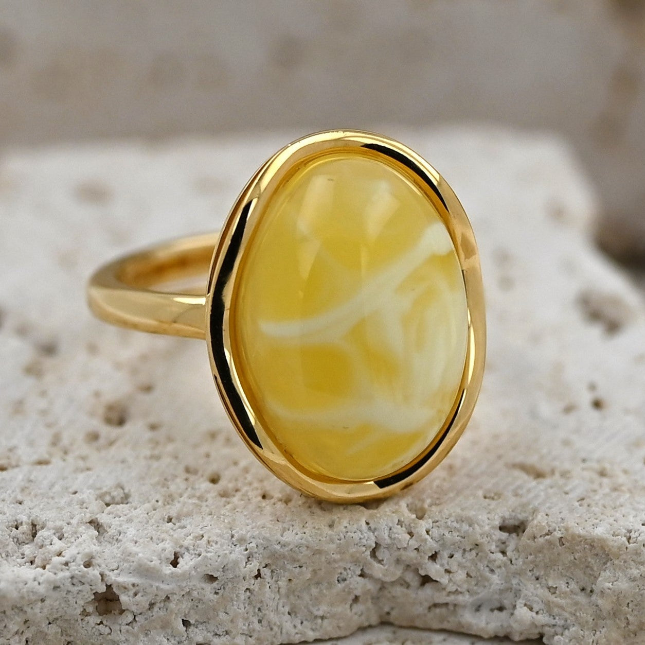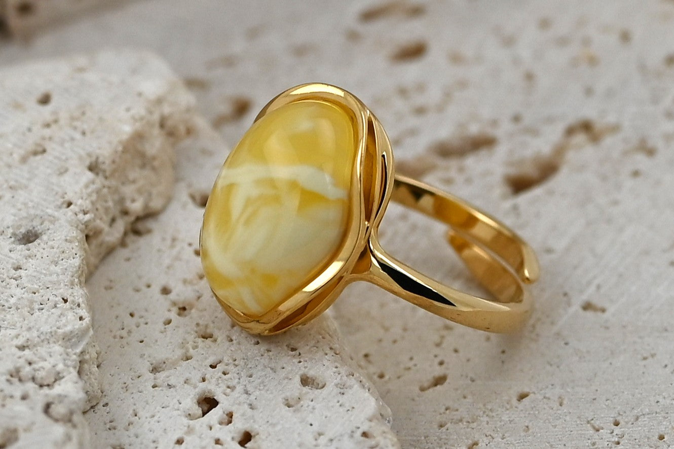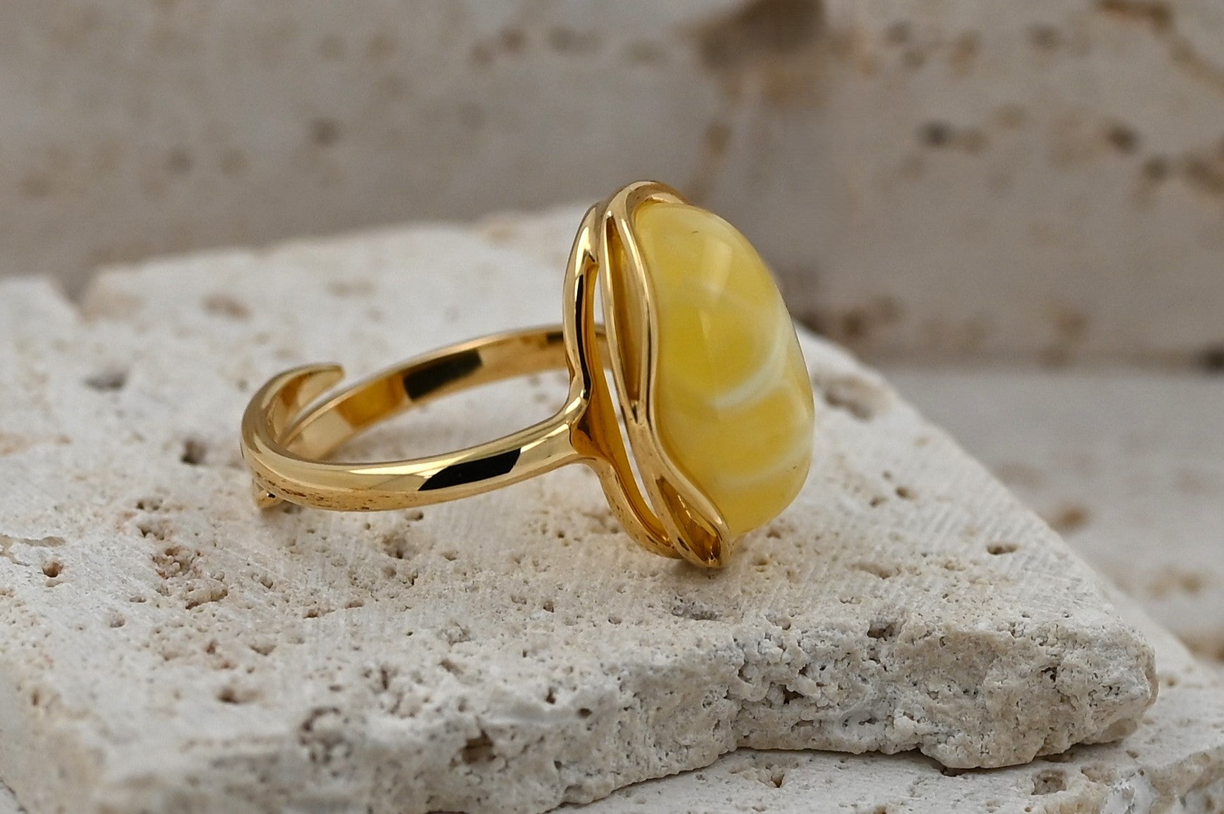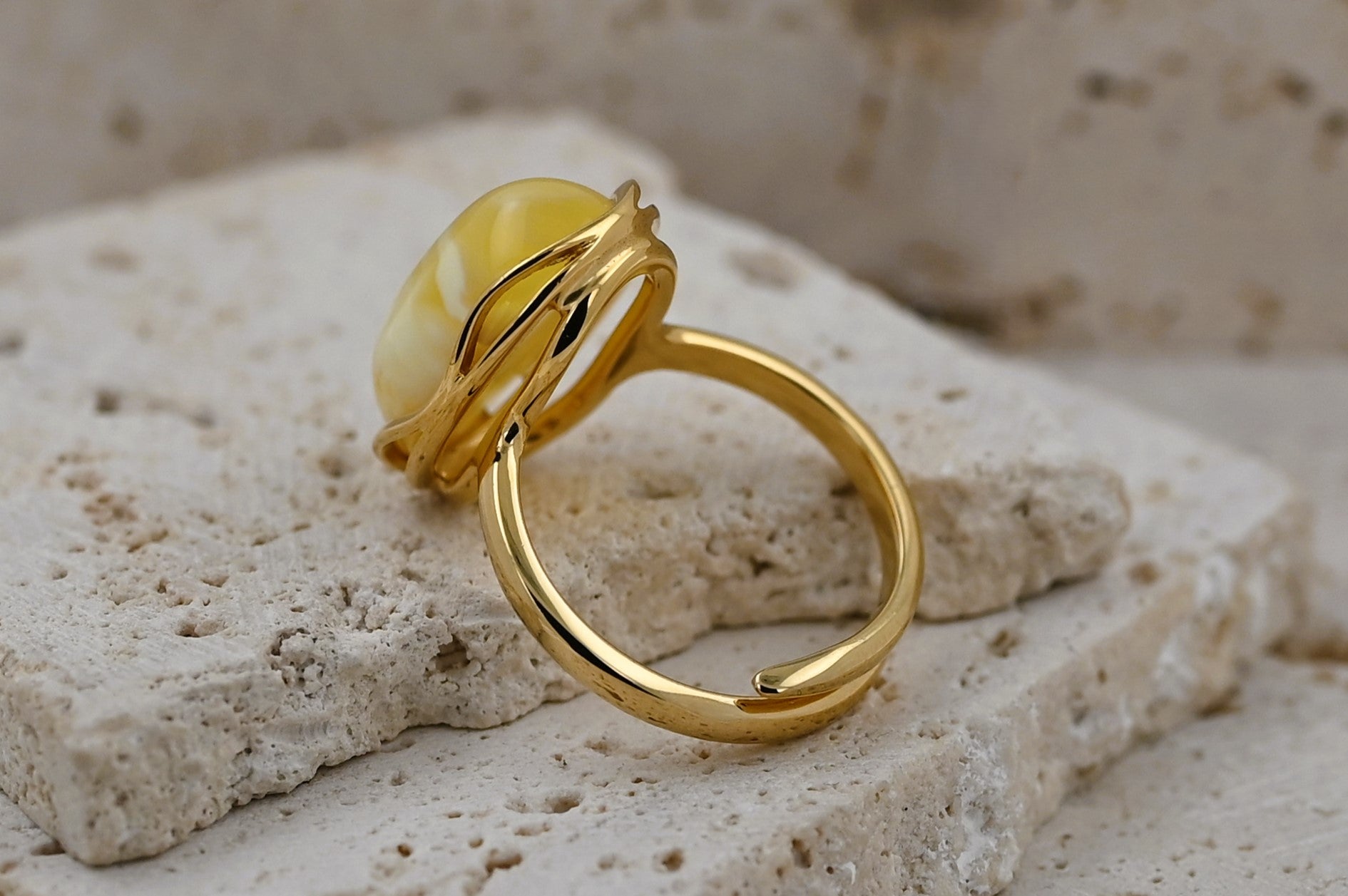 Pierścionek Bursztynowa Fala, Mleczny, Pozłacane srebro, Unikat