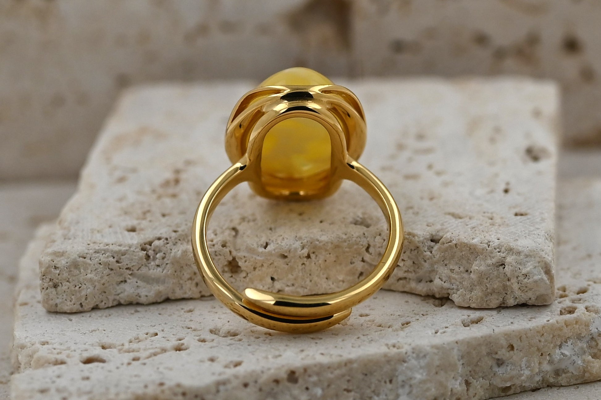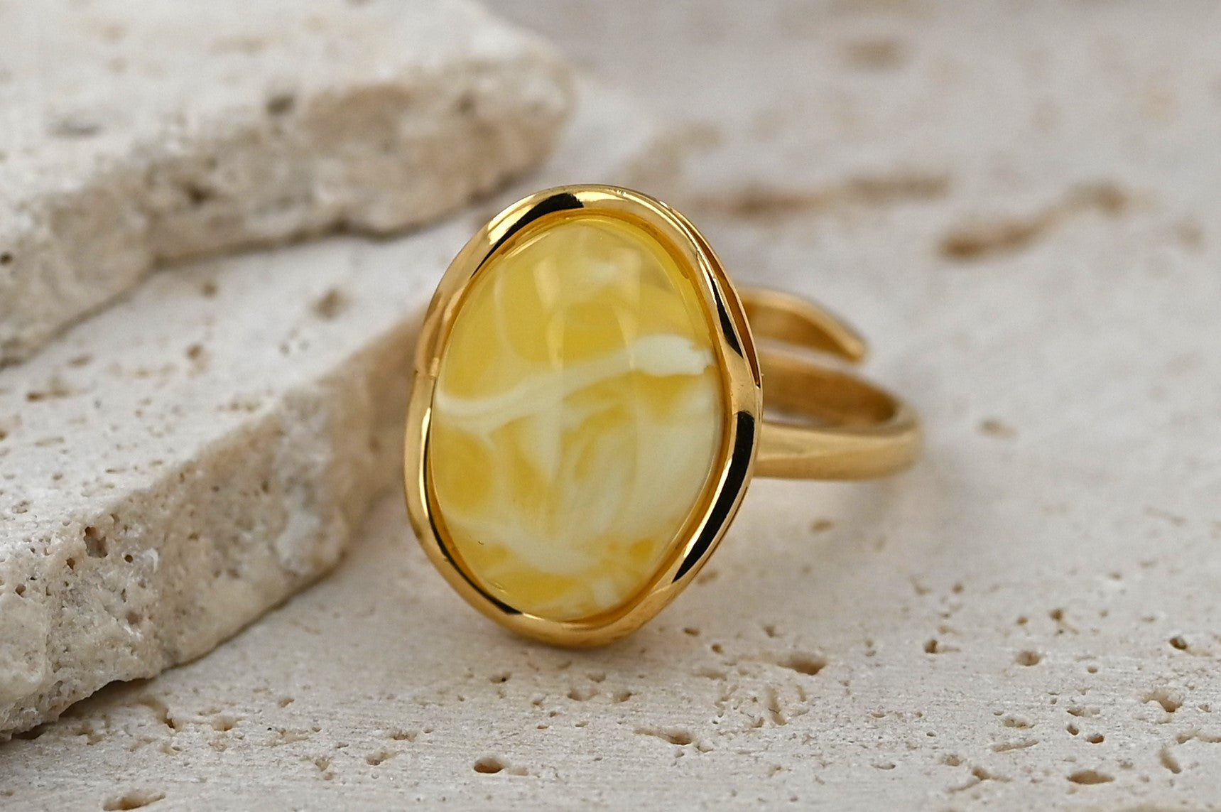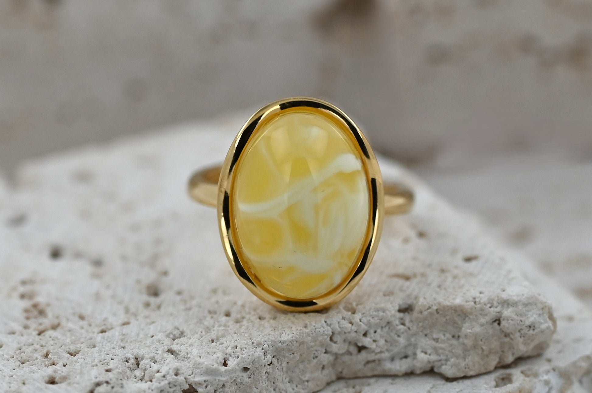 Pierścionek Bursztynowa Fala, Mleczny, Pozłacane srebro, Unikat