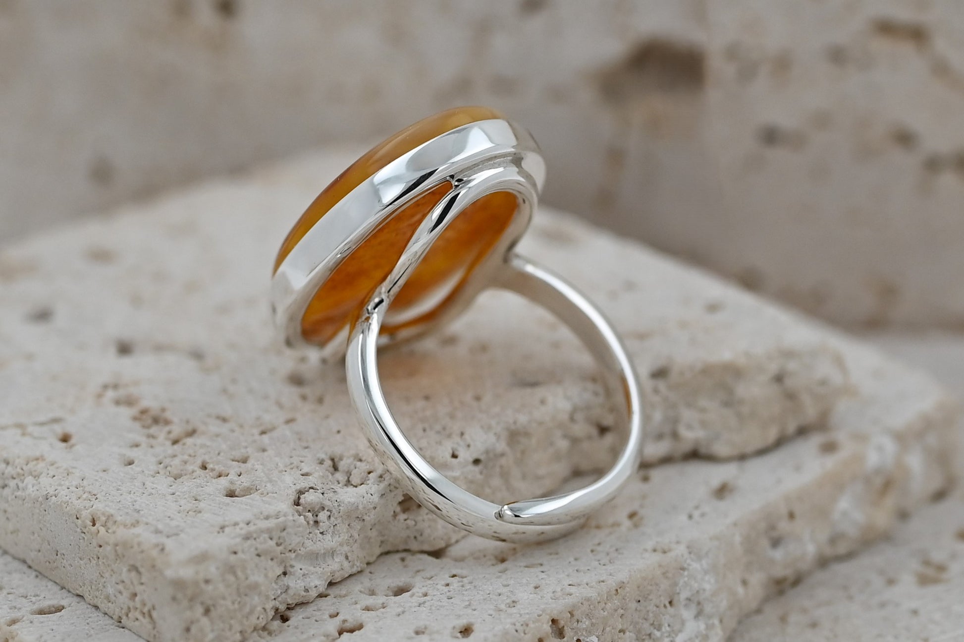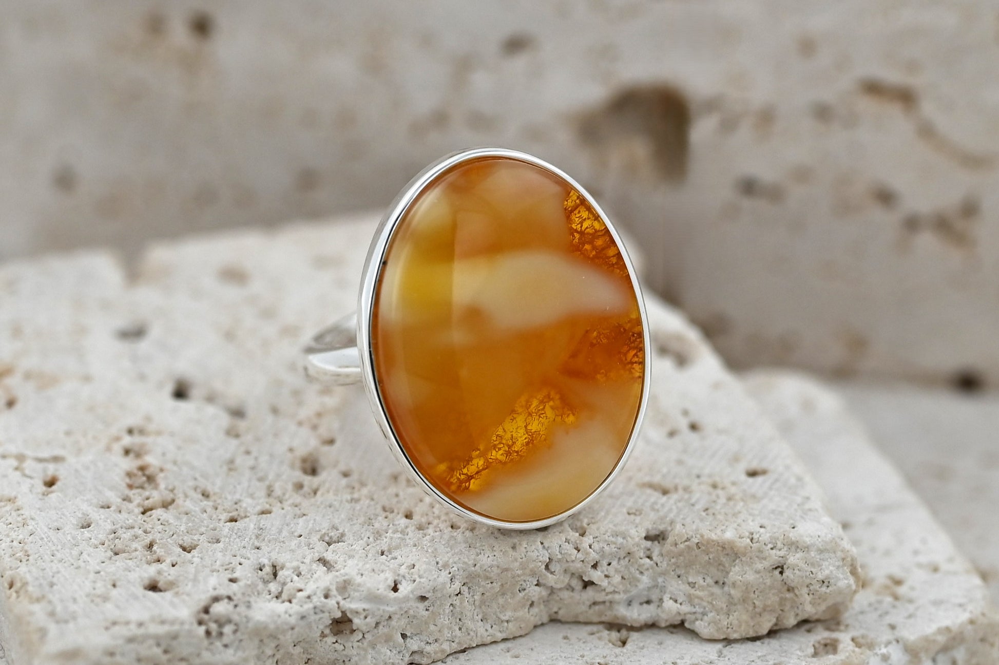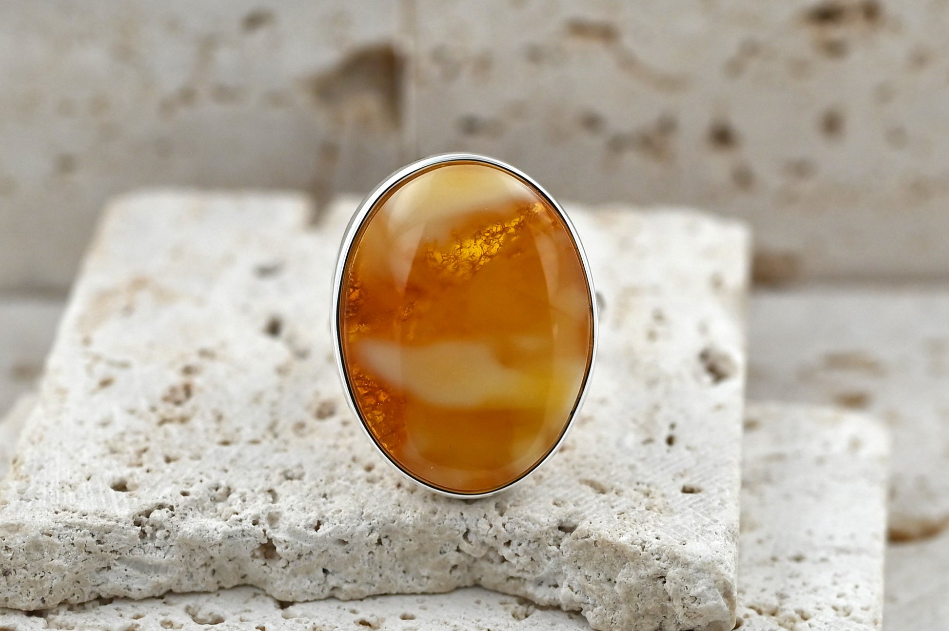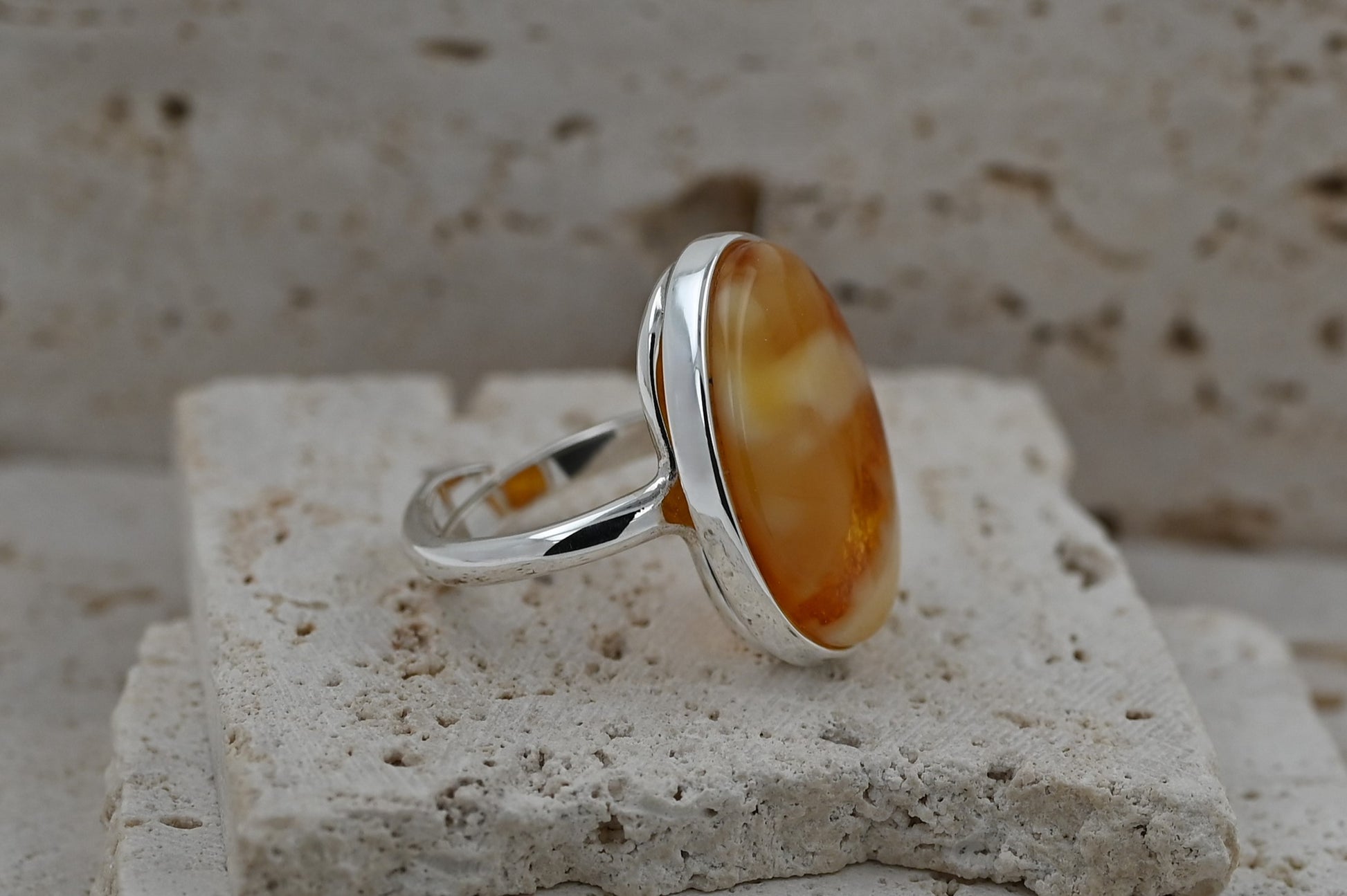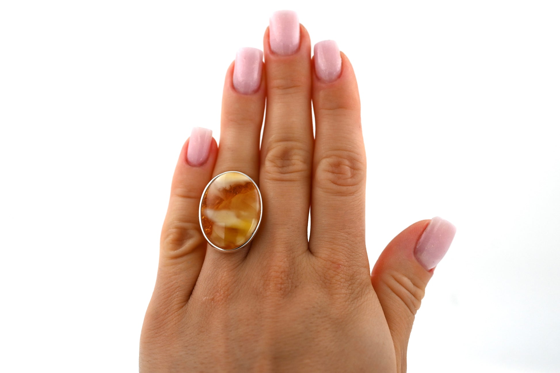 Odkryj pierścionek "Bursztynowa Mozaika" z karmelowym i mlecznym bursztynem, osadzony w srebrze próby 925. Ten unikatowy pierścionek łączy w sobie ciepłe odcienie karmelowego bursztynu z delikatnymi, mlecznymi tonami, tworząc wyjątkową mozaikę kolorów. Bursztyn, pochodzący z żywicy drzew sprzed milionów lat, jest ceniony za swoje naturalne piękno i unikalne właściwości. Idealny na każdą okazję, pierścionek "Bursztynowa Mozaika" dodaje elegancji i wyjątkowego uroku każdej stylizacji.