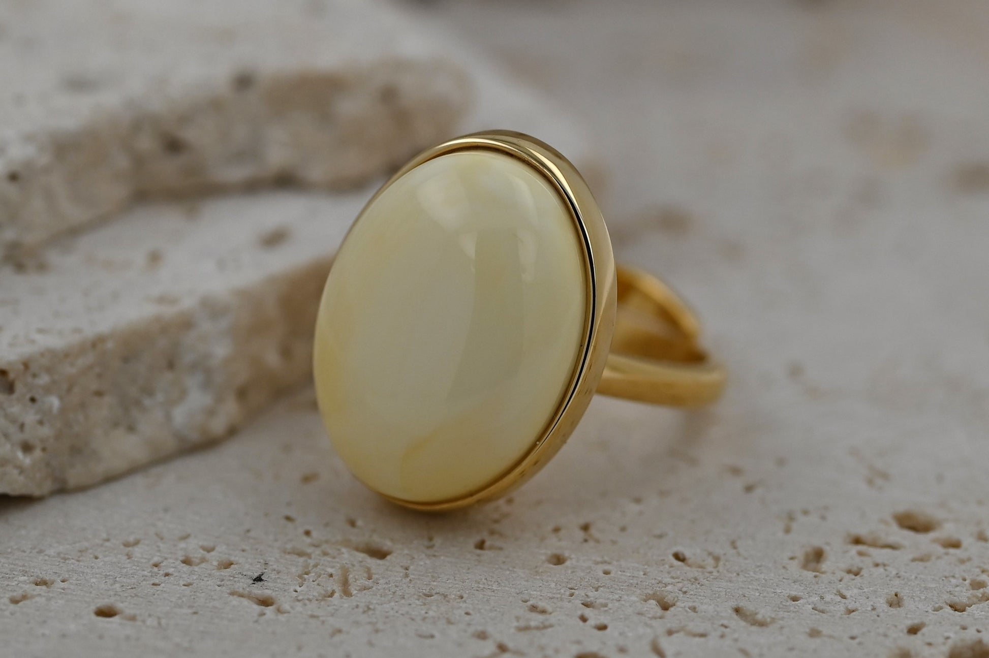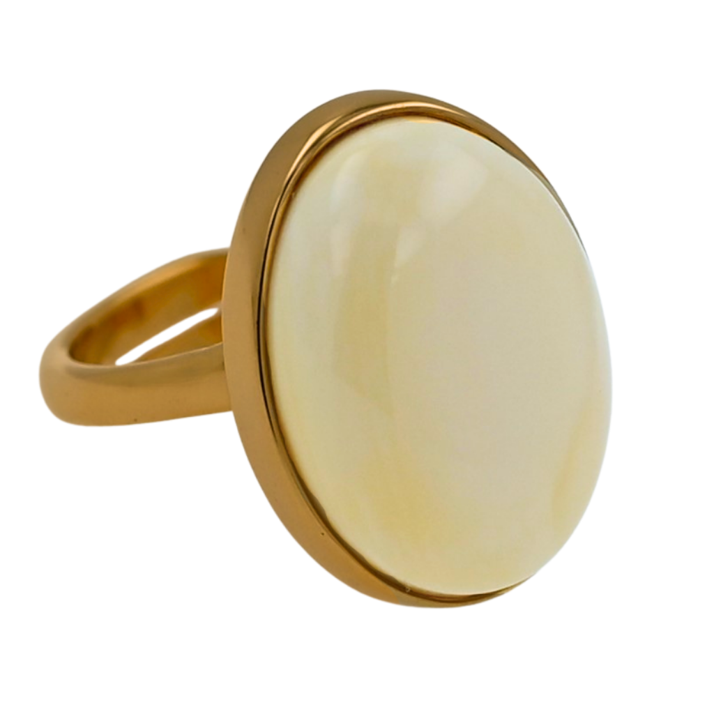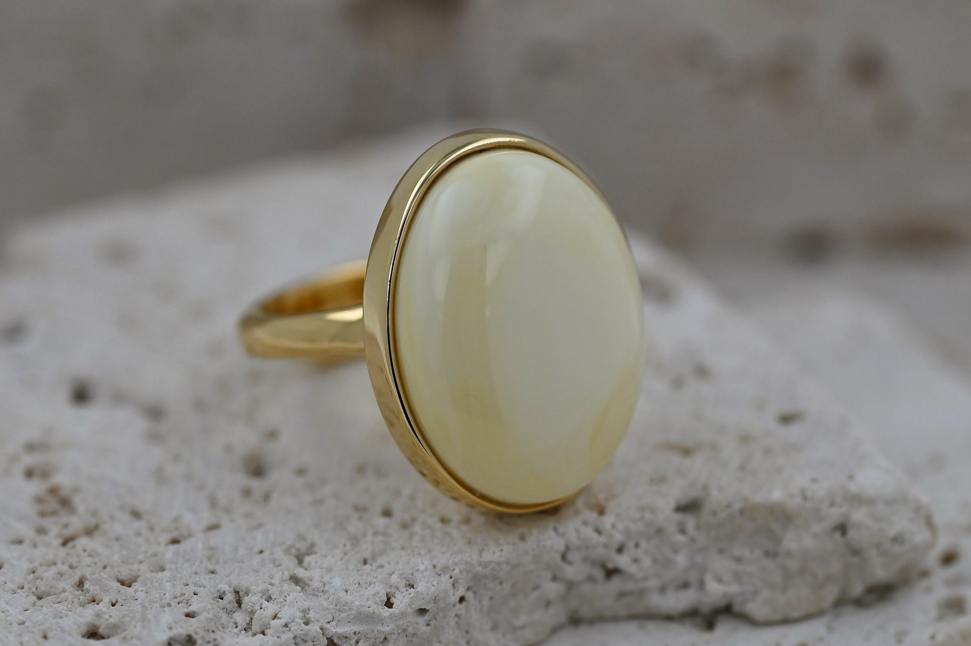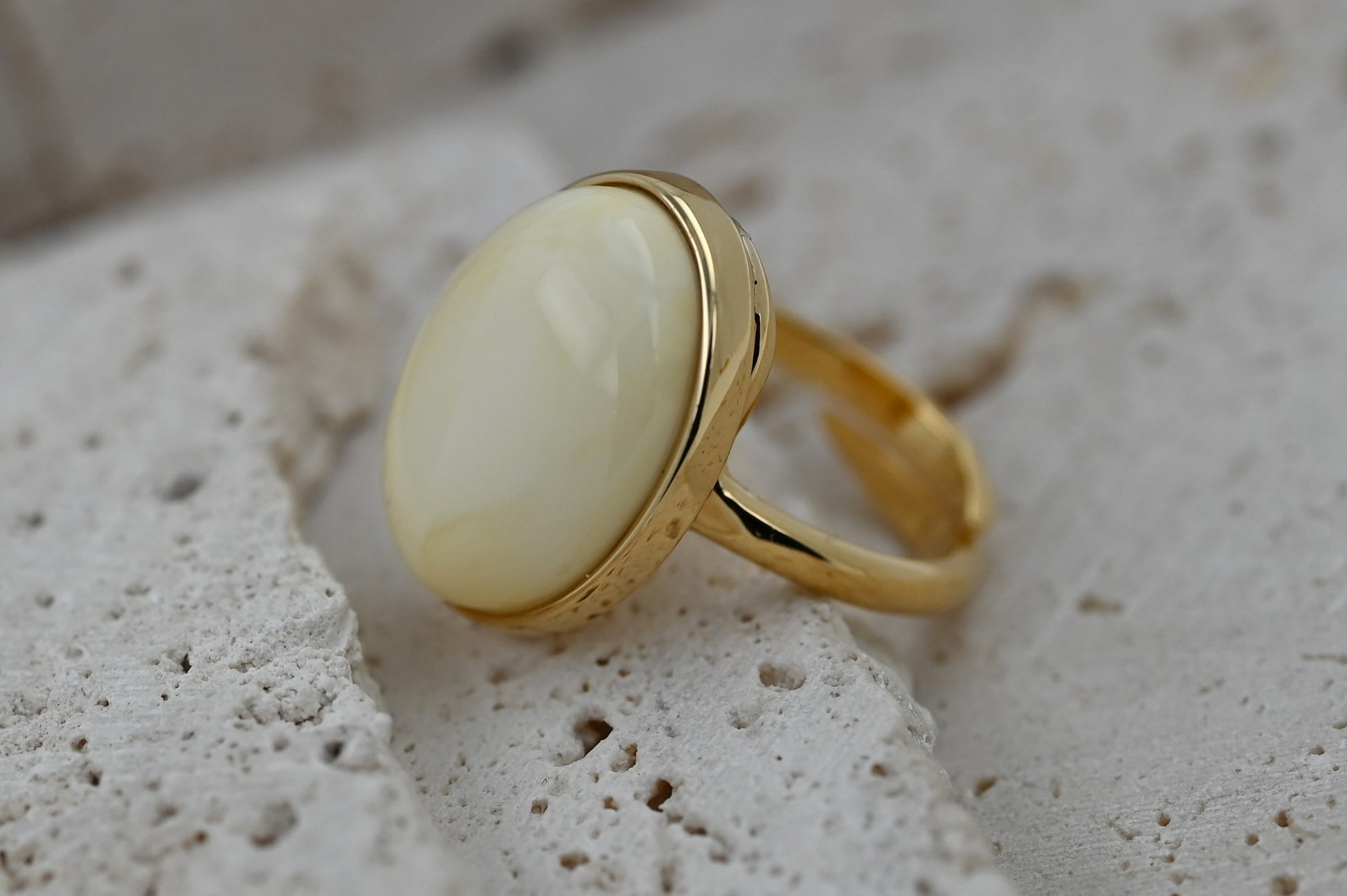 Odkryj ponadczasową elegancję zaklętą w naturalnym białym bursztynie bałtyckim. Ten wyjątkowy pierścionek został wykonany z najwyższą starannością z pozłacanego srebra 925, dzięki czemu łączy luksusowy wygląd z trwałością biżuterii premium.