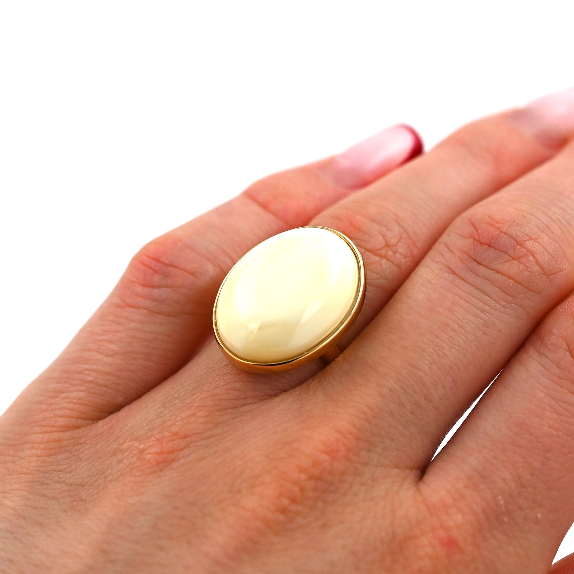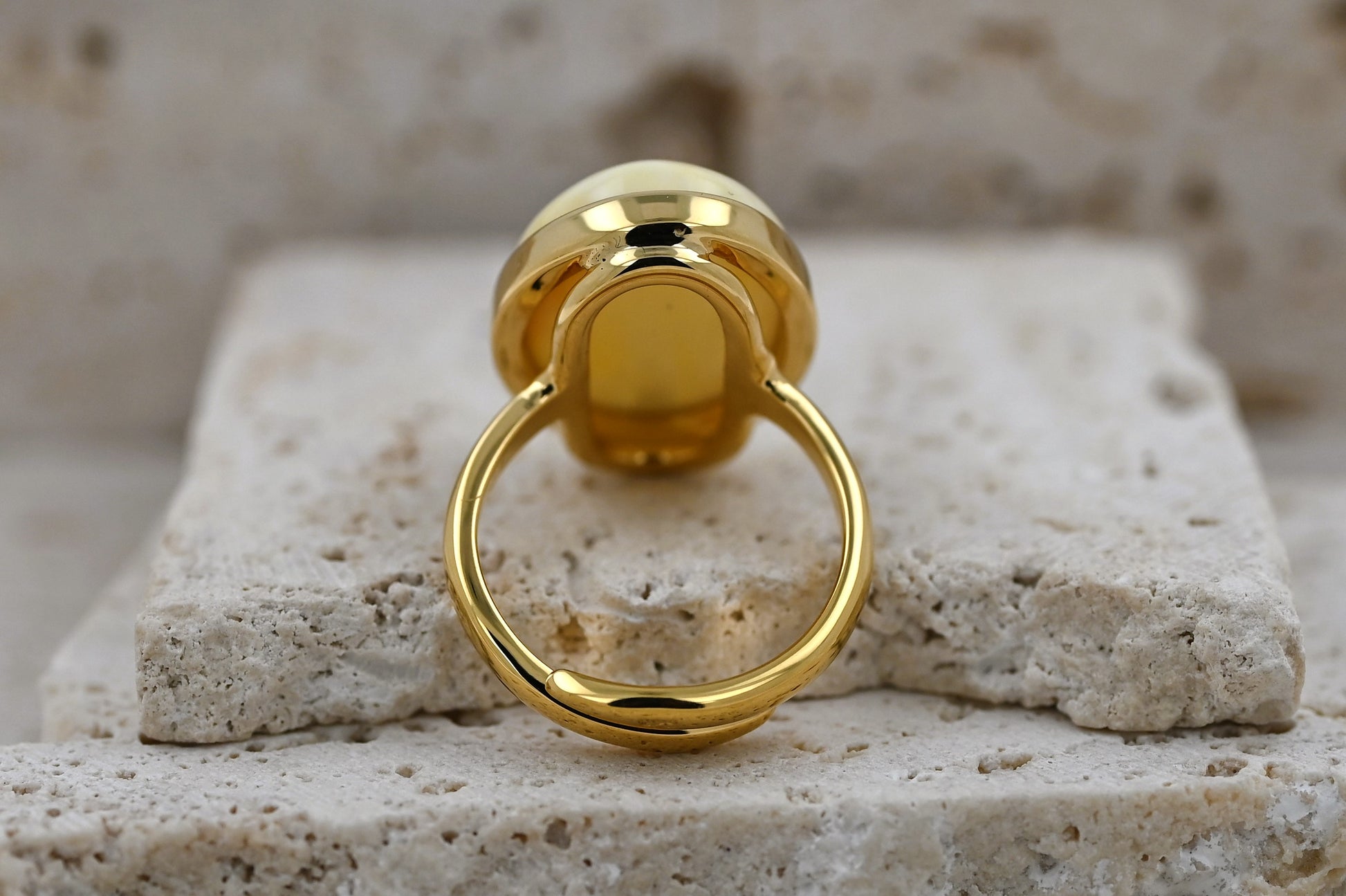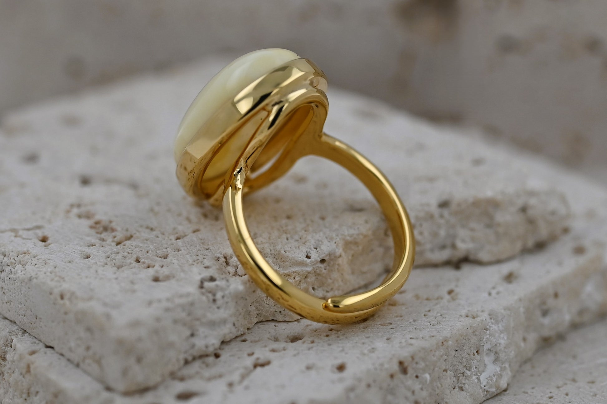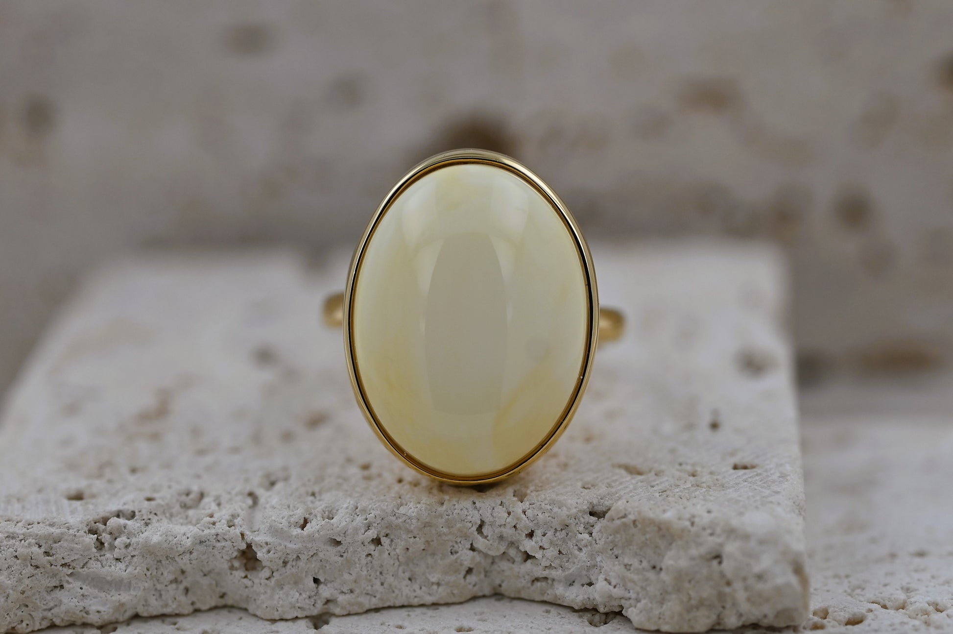 Odkryj ponadczasową elegancję zaklętą w naturalnym białym bursztynie bałtyckim. Ten wyjątkowy pierścionek został wykonany z najwyższą starannością z pozłacanego srebra 925, dzięki czemu łączy luksusowy wygląd z trwałością biżuterii premium.