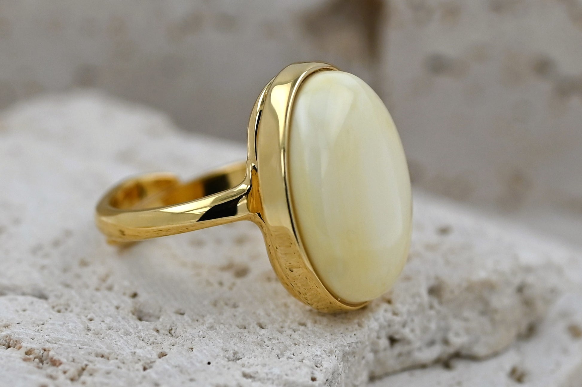 Unikatowy Klasyczny Pierścionek z Białym Bursztynem Bałtyckim, Pozłacane Srebro 925