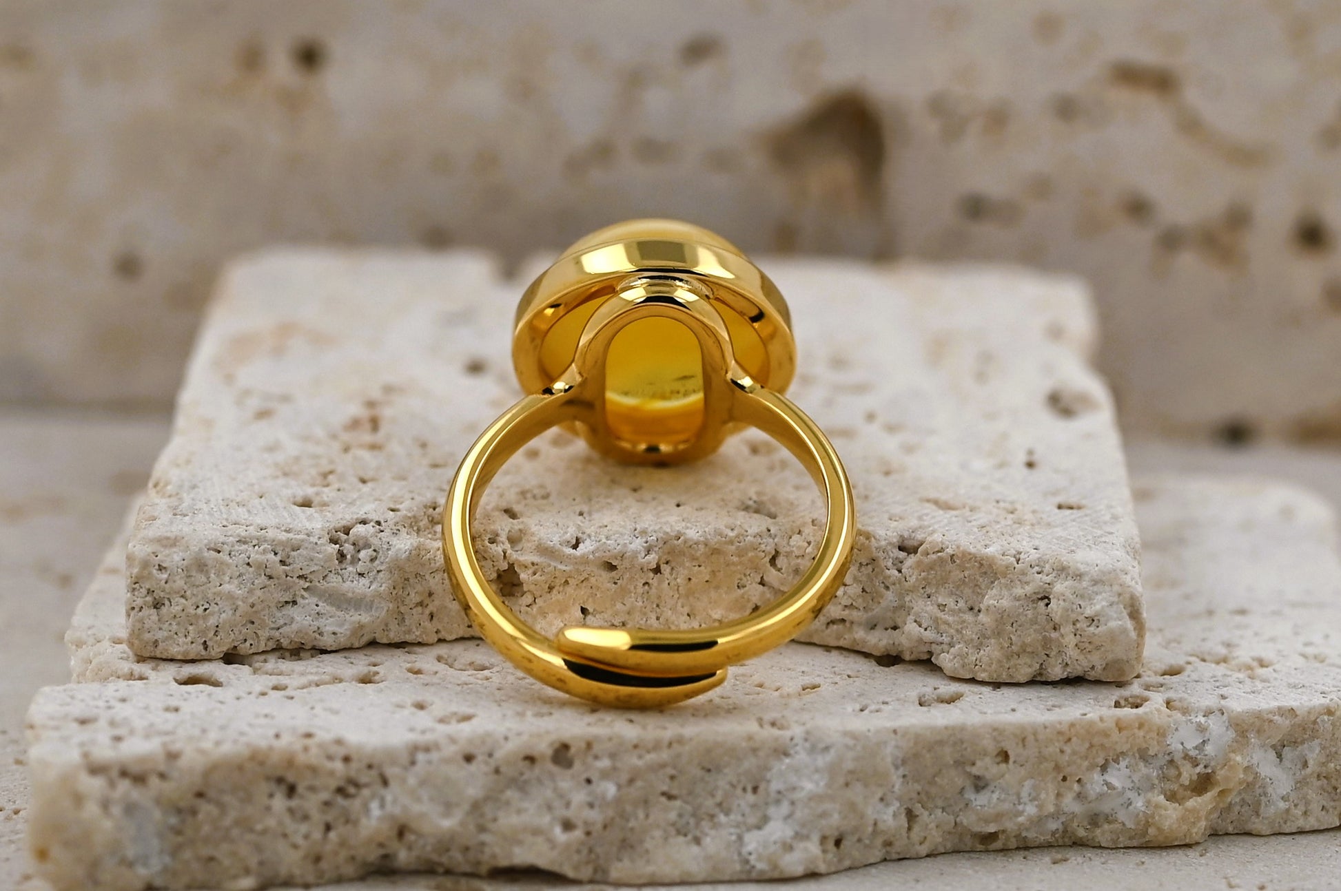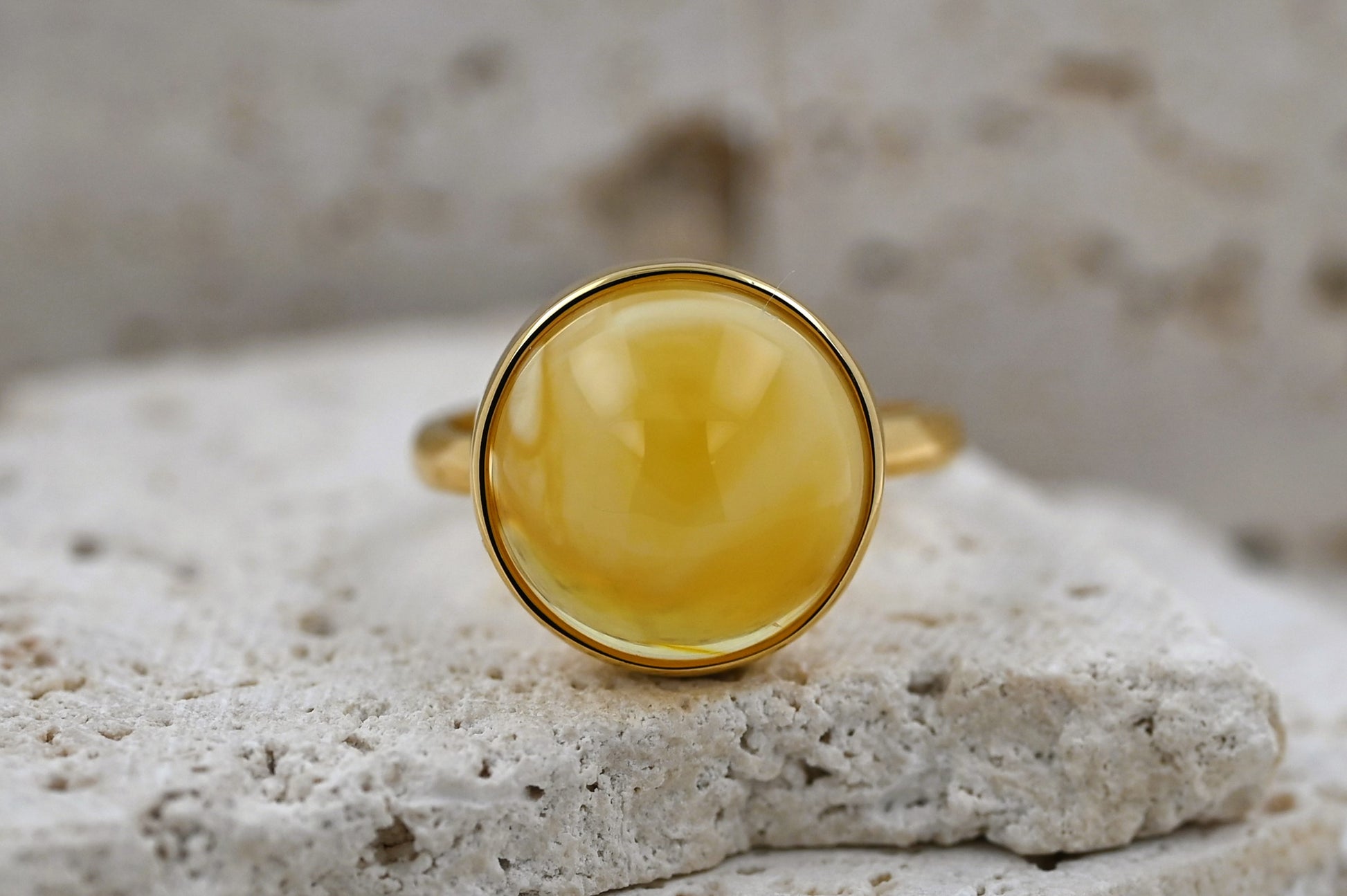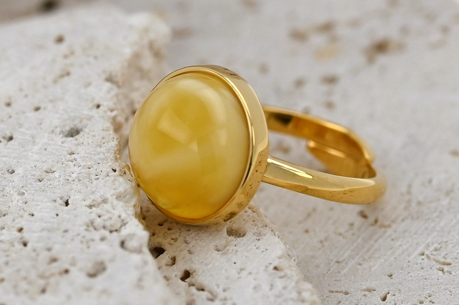 Ciepły, złocisty odcień bursztynu emanuje naturalnym blaskiem i unikalnym urokiem – każdy kamień jest niepowtarzalny, dzięki czemu Twój pierścionek będzie absolutnie wyjątkowy.