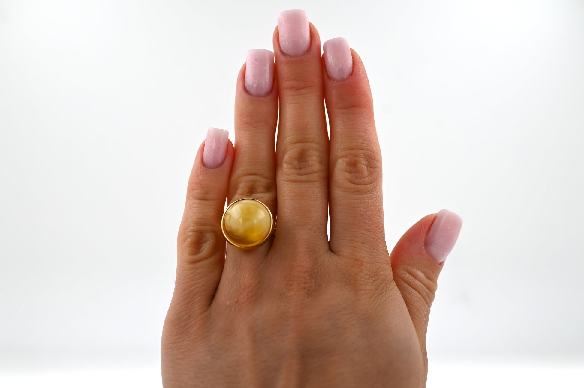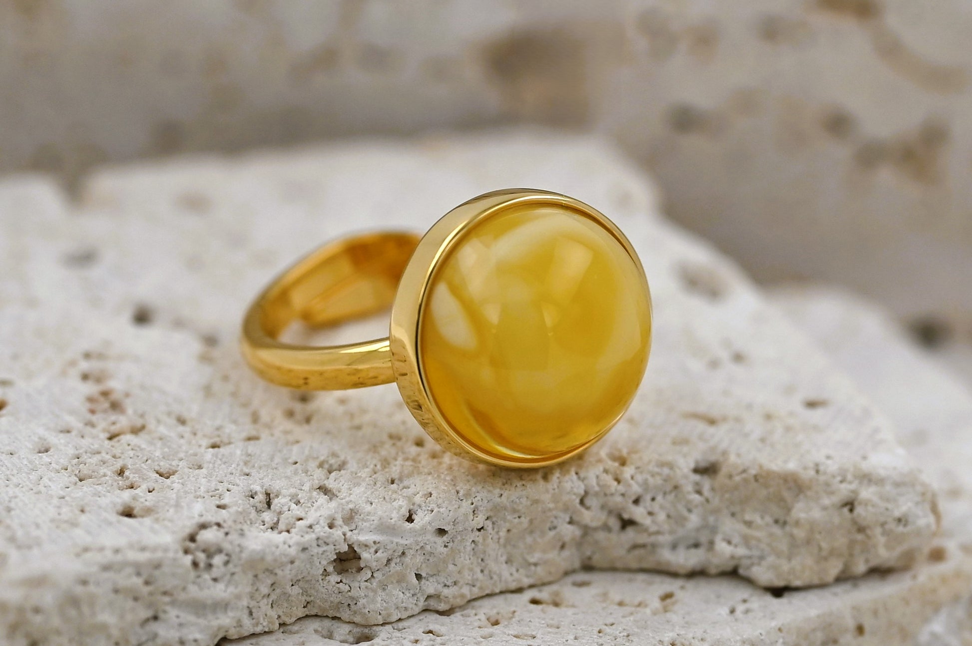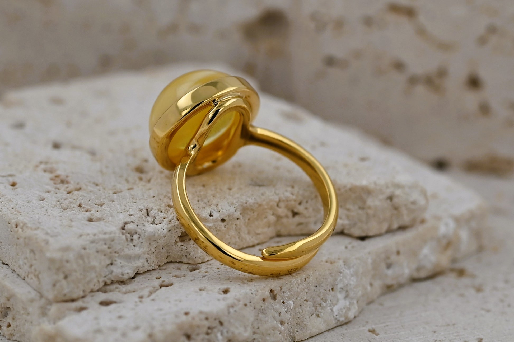 Ciepły, złocisty odcień bursztynu emanuje naturalnym blaskiem i unikalnym urokiem – każdy kamień jest niepowtarzalny, dzięki czemu Twój pierścionek będzie absolutnie wyjątkowy.