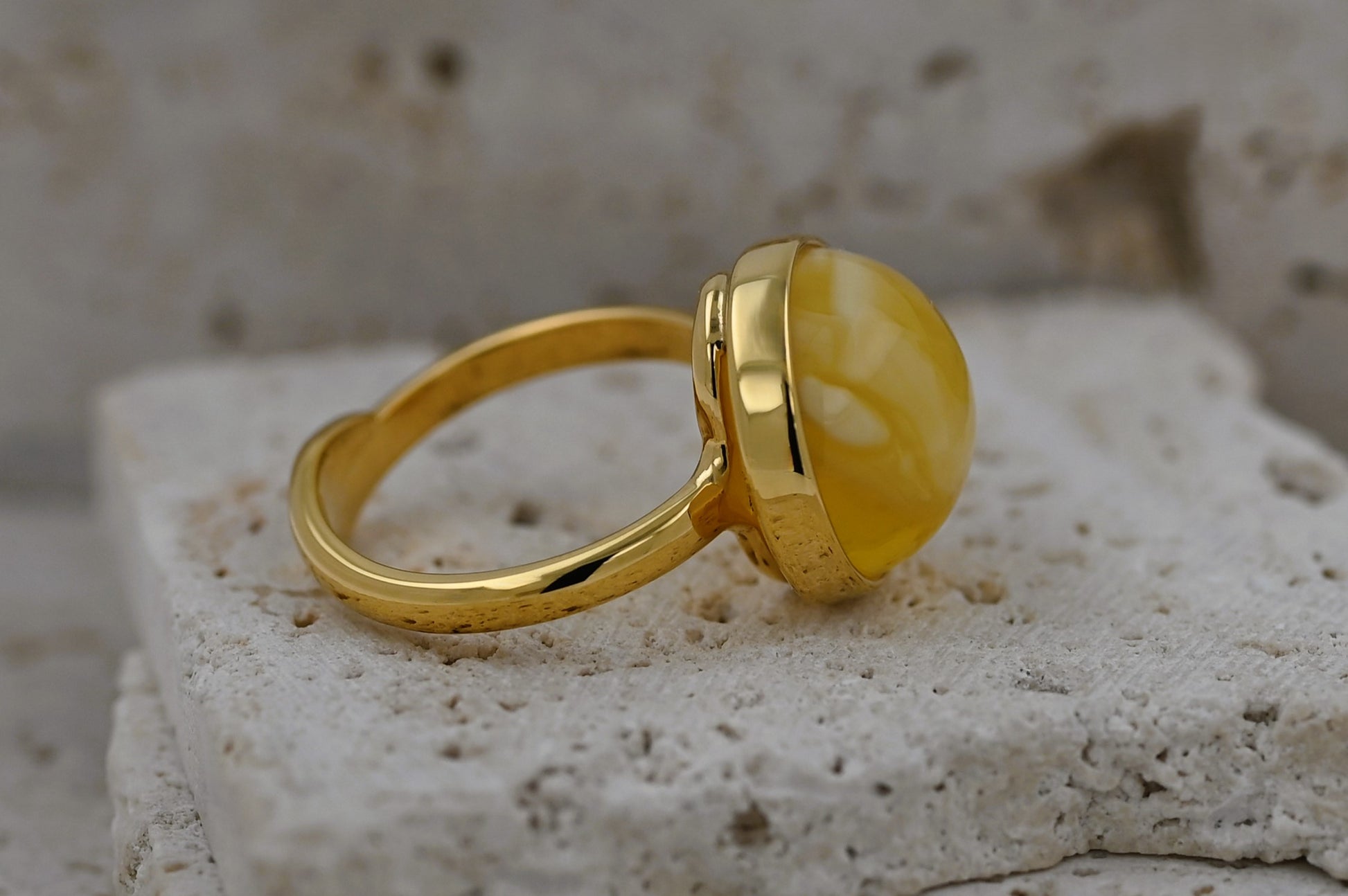 Odkryj ponadczasowe piękno natury w wyjątkowej formie. Ten elegancki pierścionek z naturalnym mlecznym bursztynem bałtyckim, osadzonym w pozłacanym srebrze próby 925, to idealne połączenie klasyki i nowoczesności.