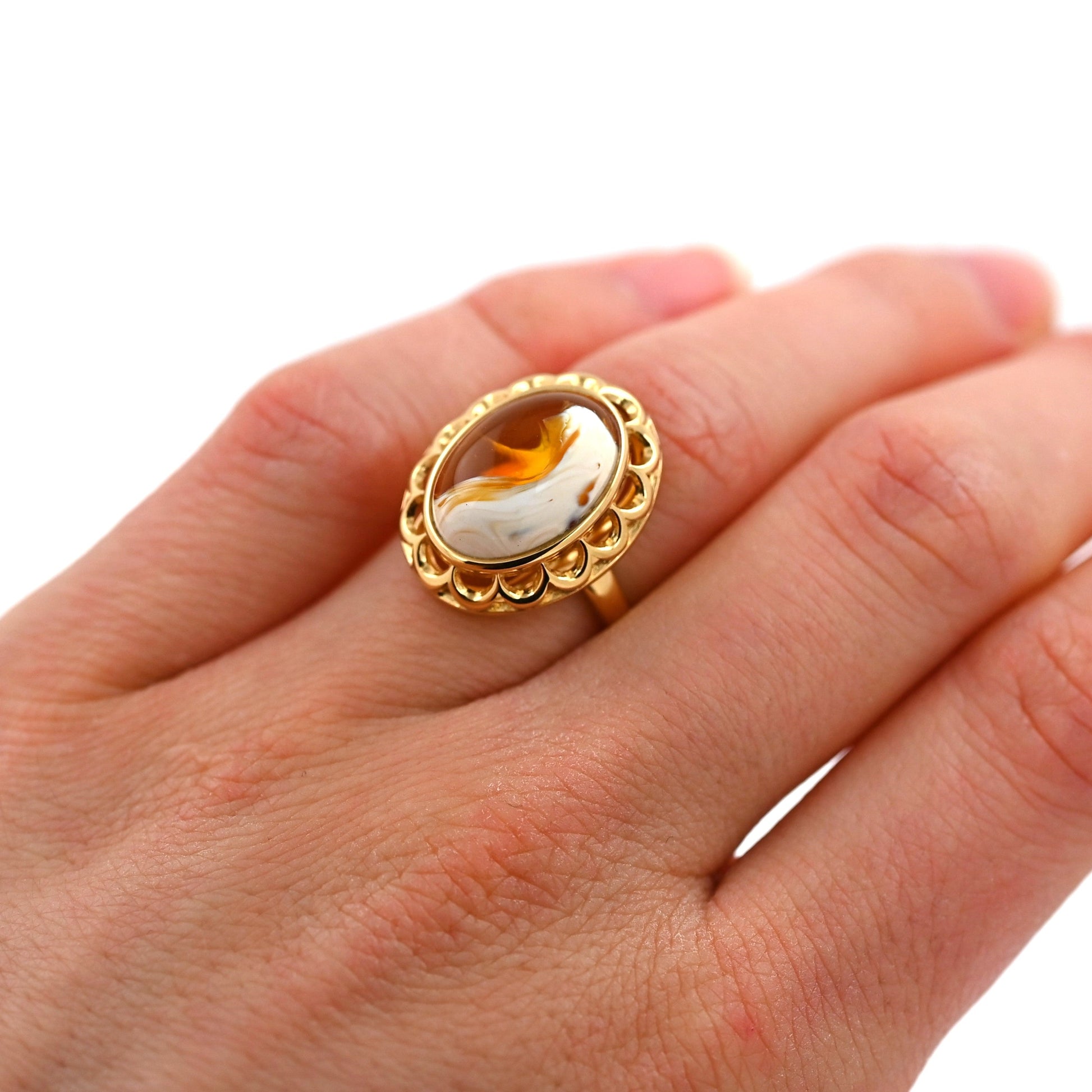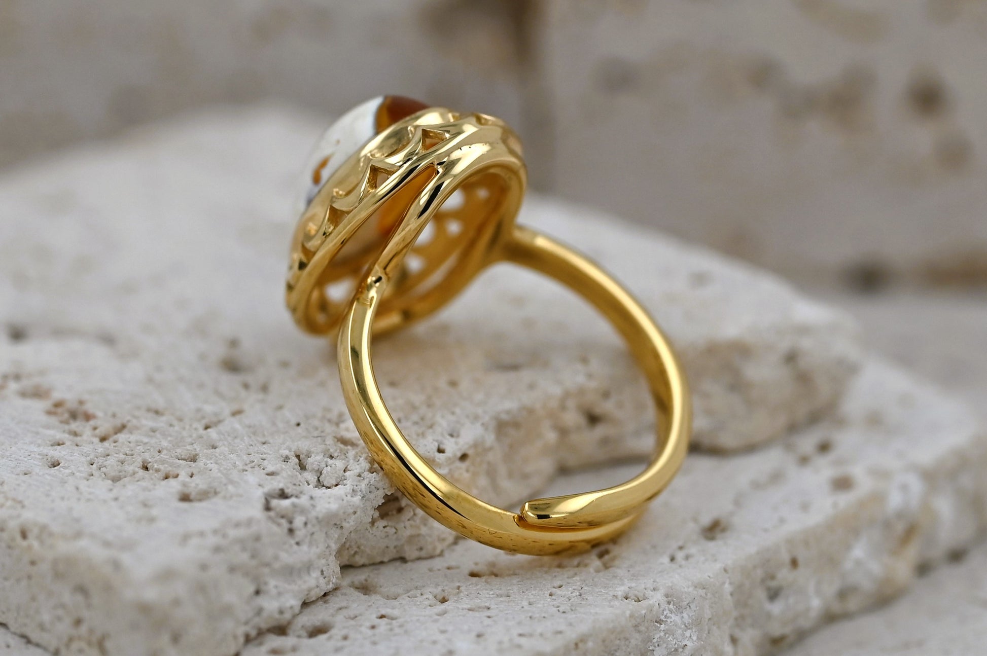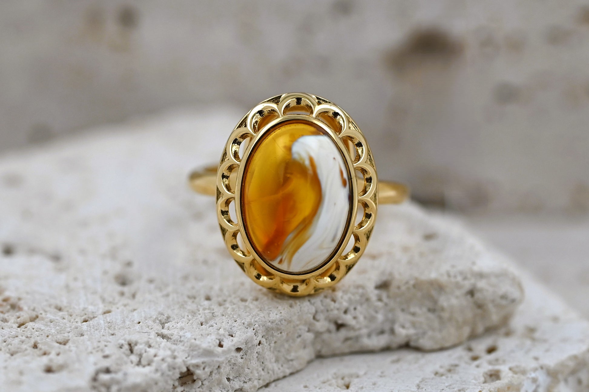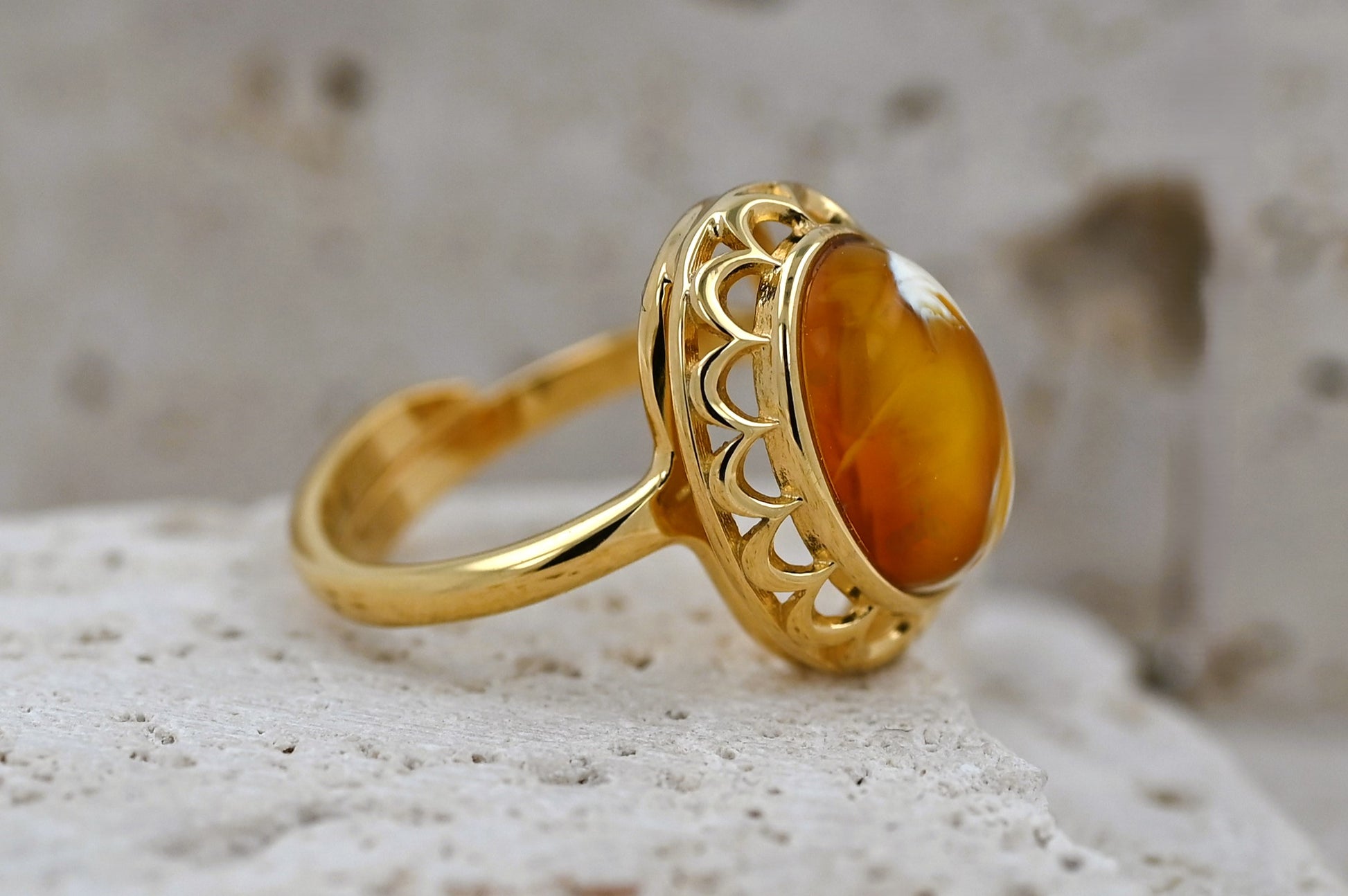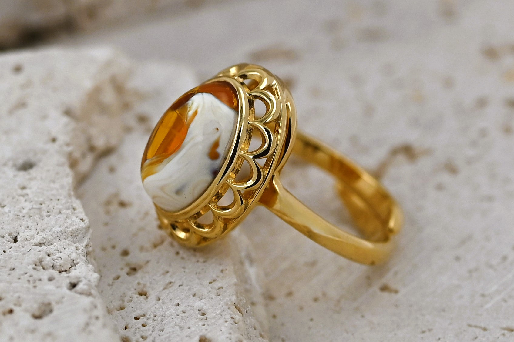 Unikatowy Pierścionek Bursztynowa Elegancja, Mleczny, Pozłacane Srebro