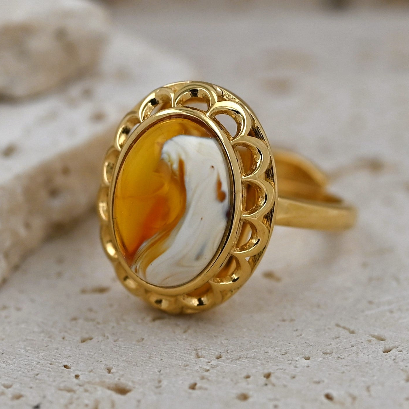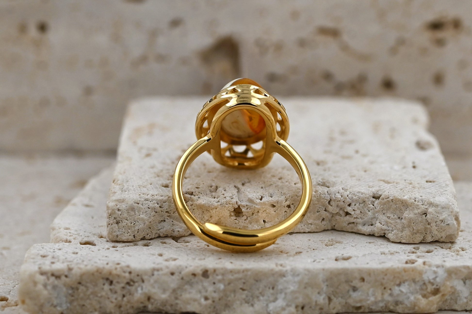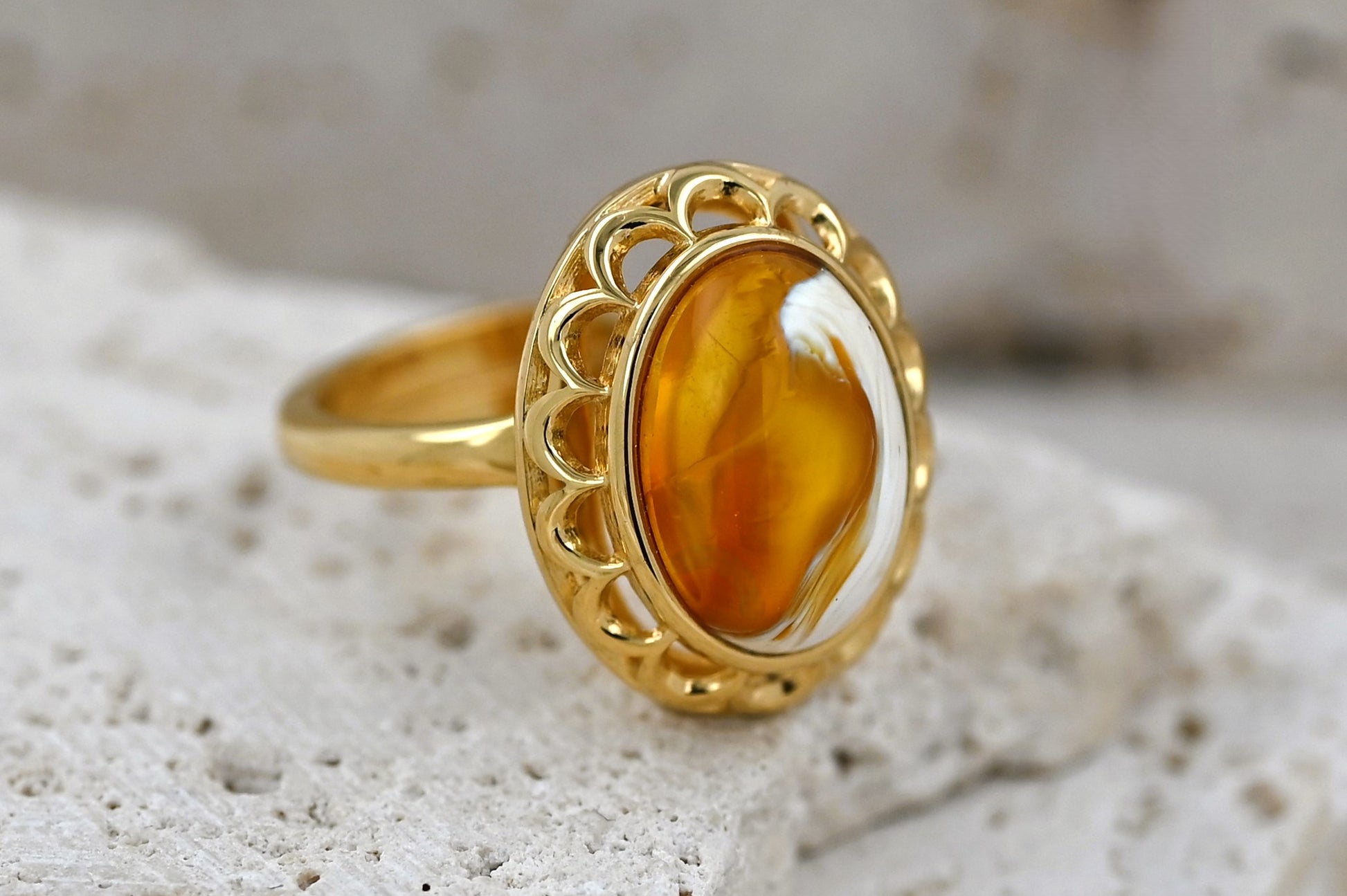 Bursztyn został oprawiony w elegancką, złoconą oprawę, która pięknie podkreśla jego organiczny charakter i ciepłe barwy. Pierścionek doskonale sprawdzi się zarówno jako wyrazisty akcent codziennej stylizacji, jak i wyjątkowy dodatek na specjalne okazje.
