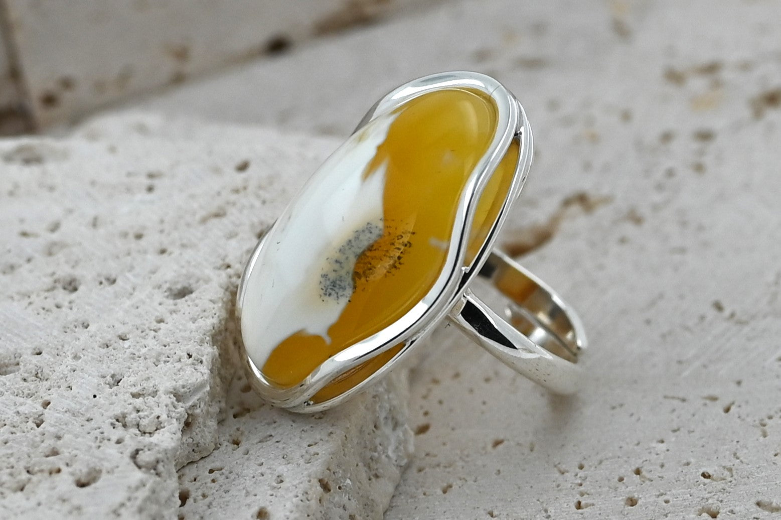 Unikatowy pierścionek z mlecznym bursztynem bałtyckim i naturalnymi inkluzjami. Srebro 925, wyjątkowa biżuteria handmade.
