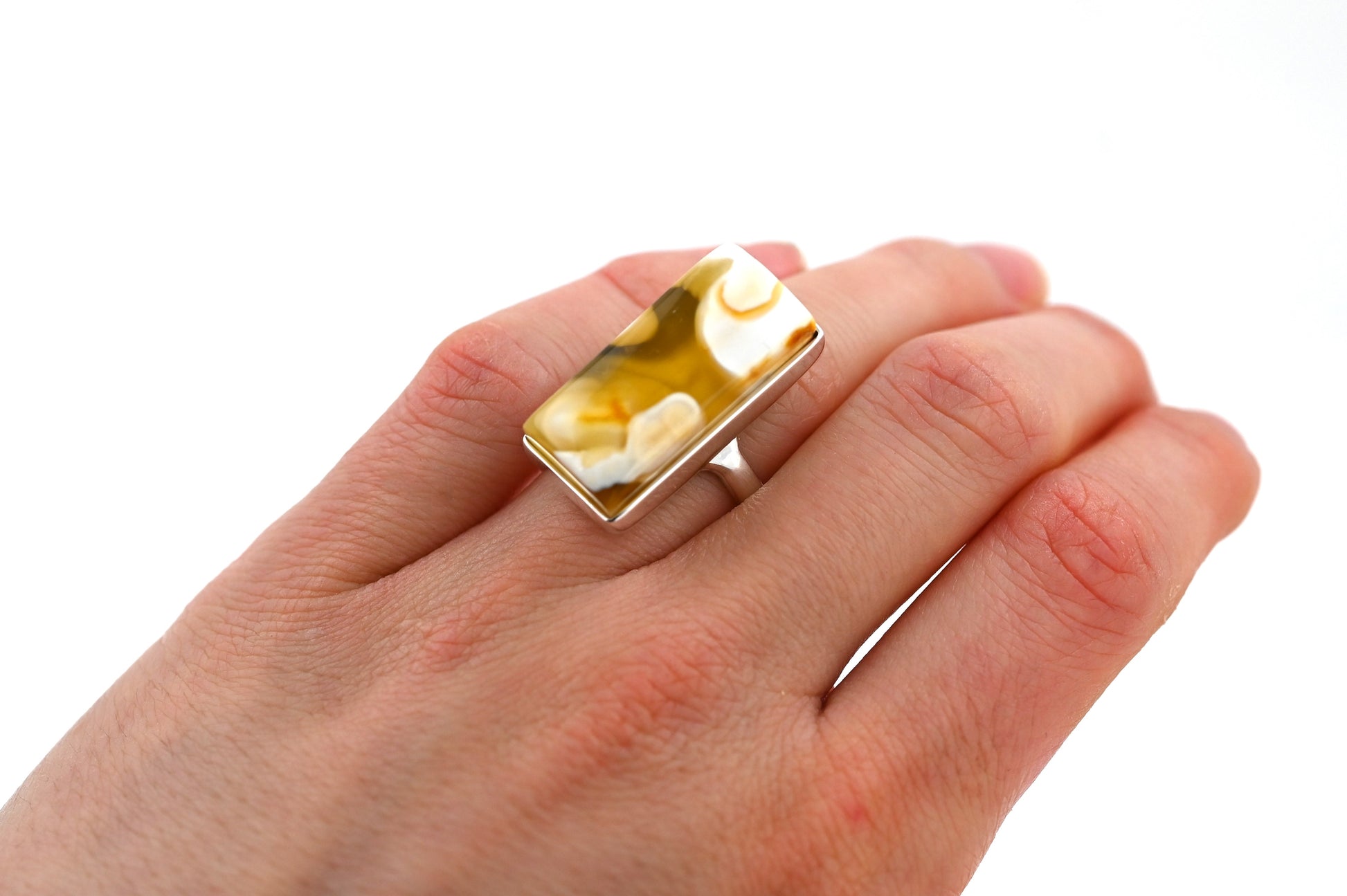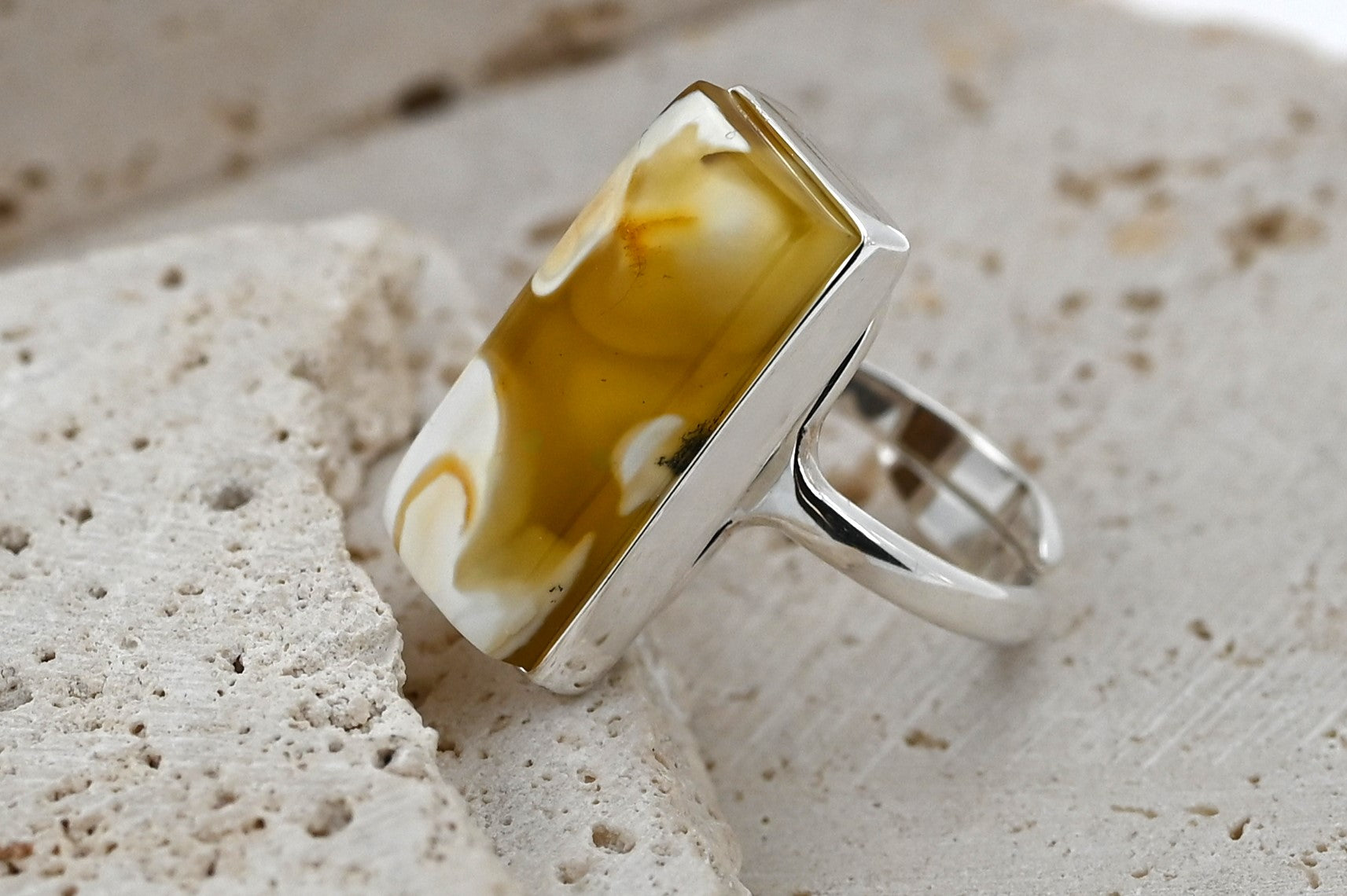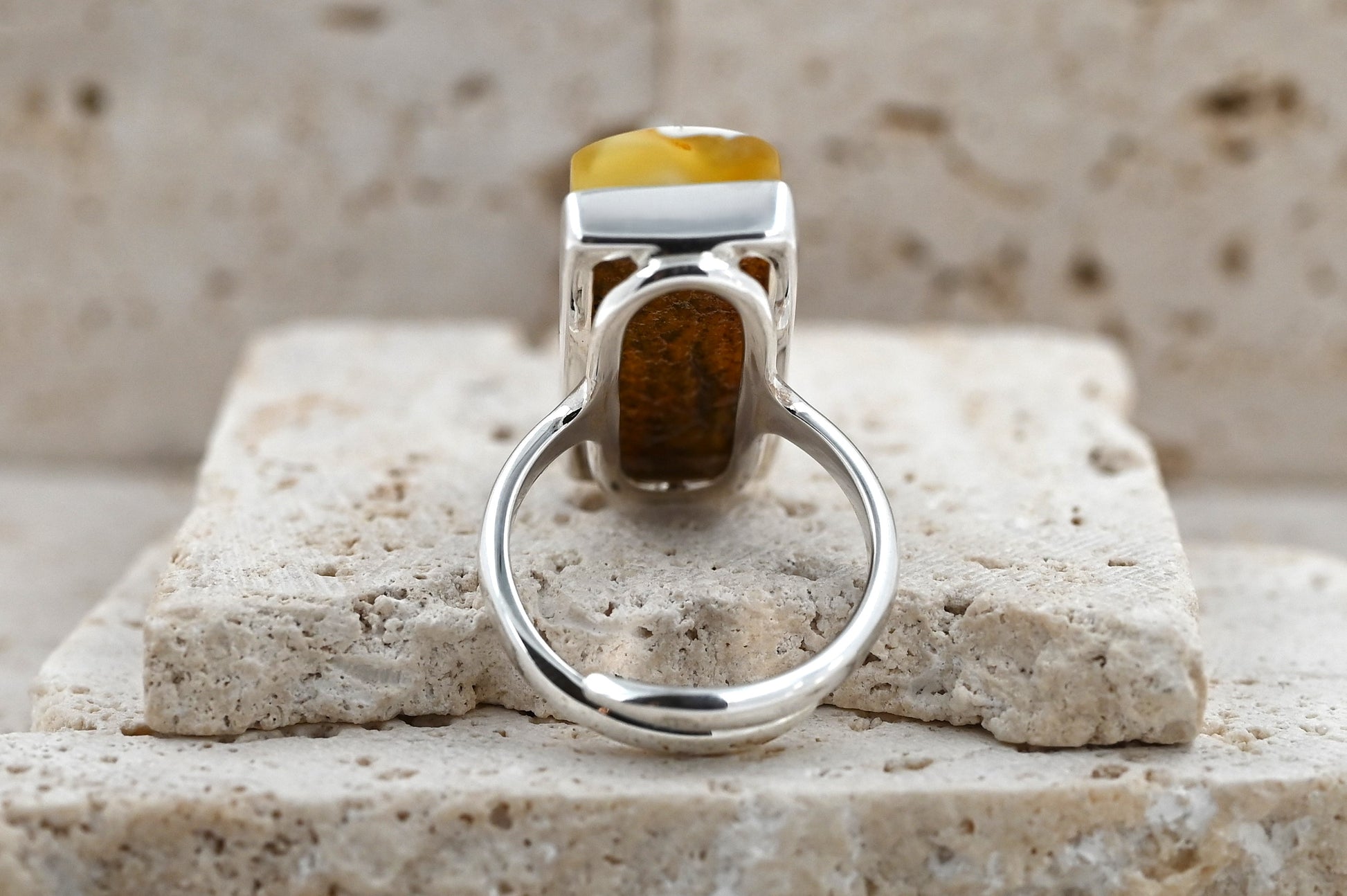 Unikatowy Prostokątny Pierścionek Mleczny Bursztynowy, Srebro 925