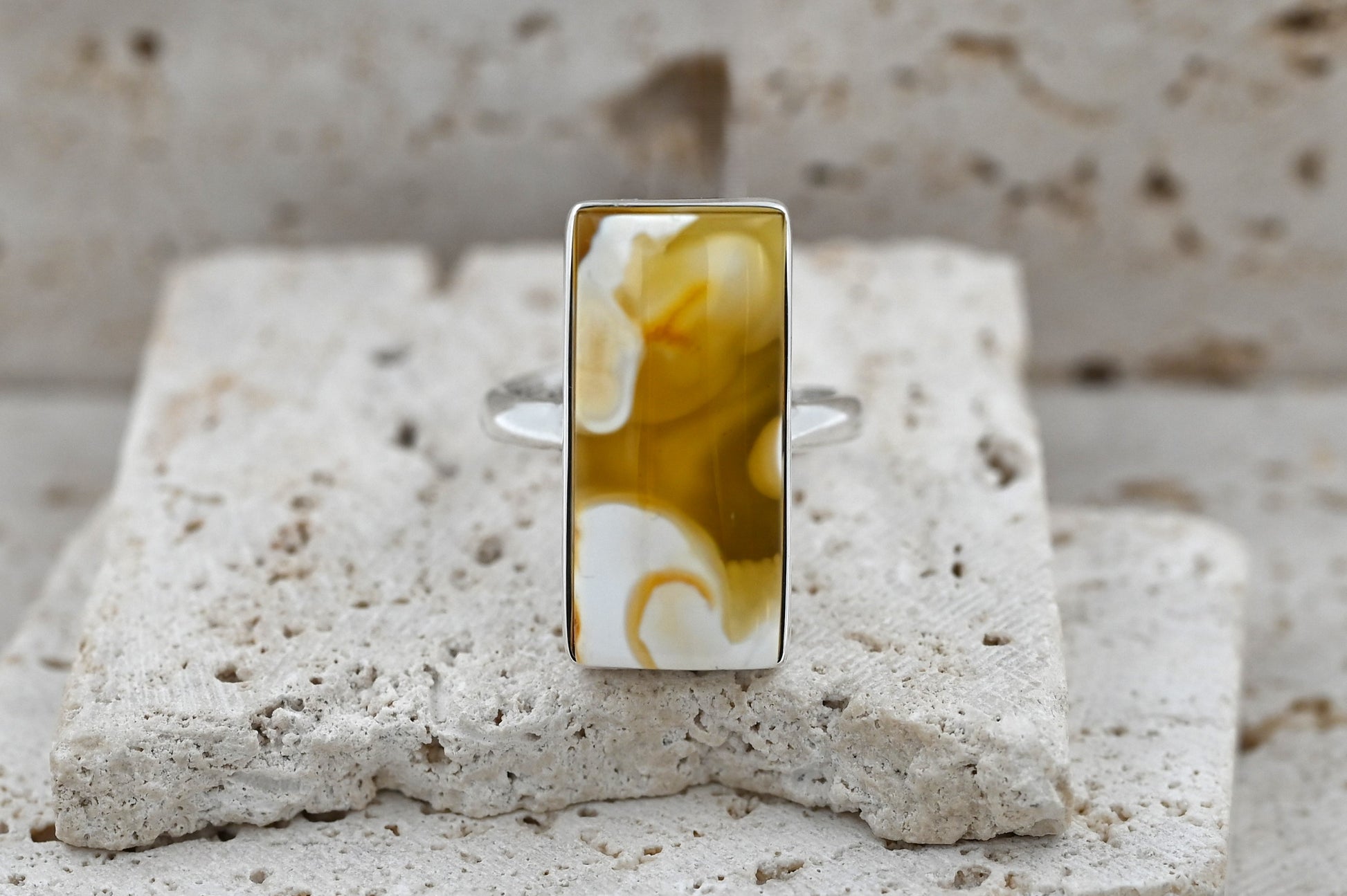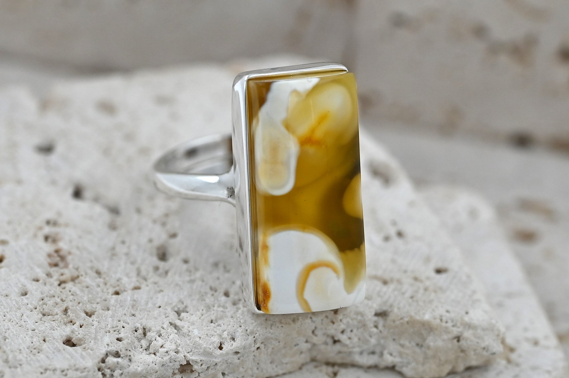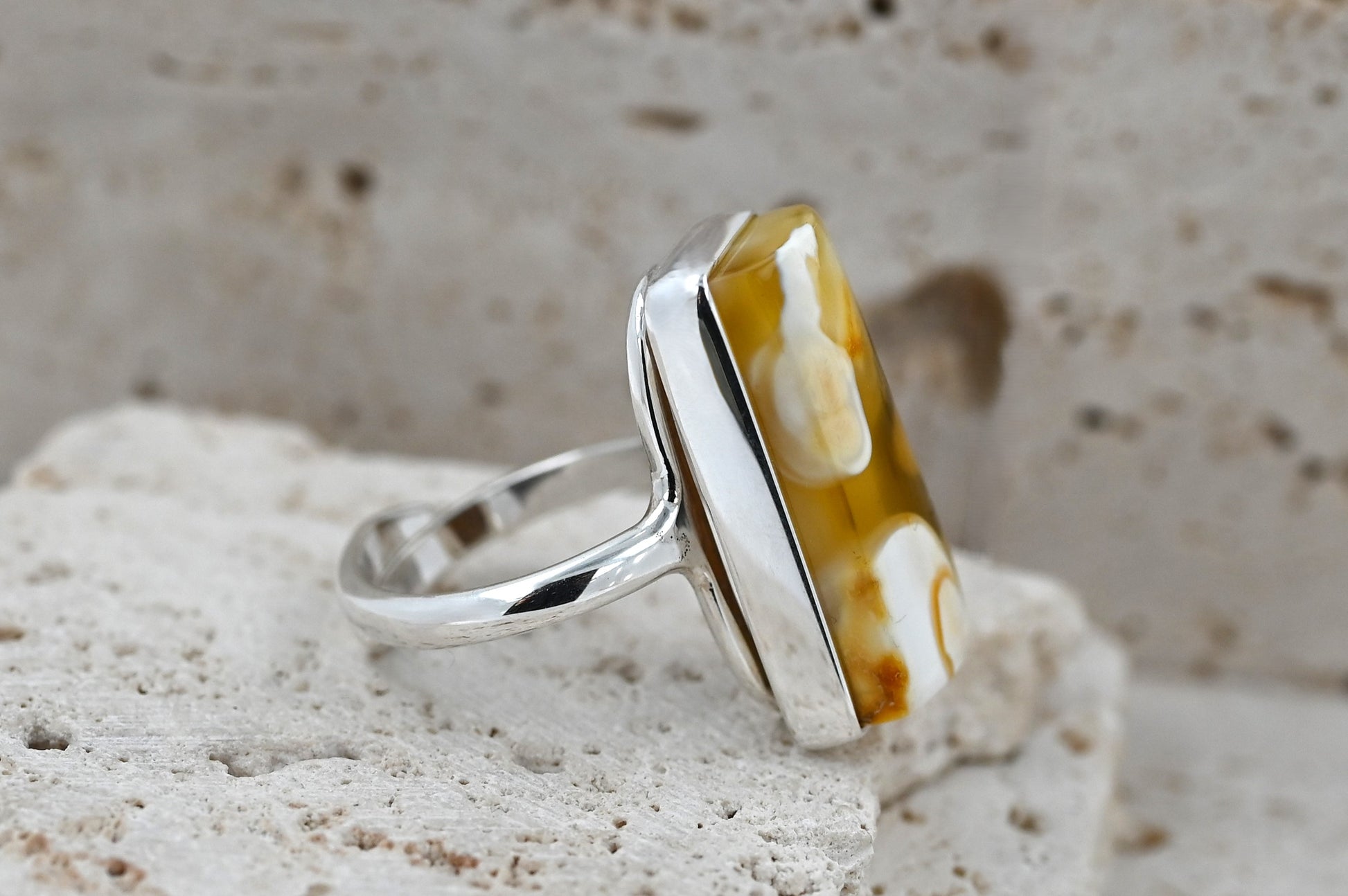 Unikatowy Prostokątny Pierścionek Mleczny Bursztynowy, Srebro 925