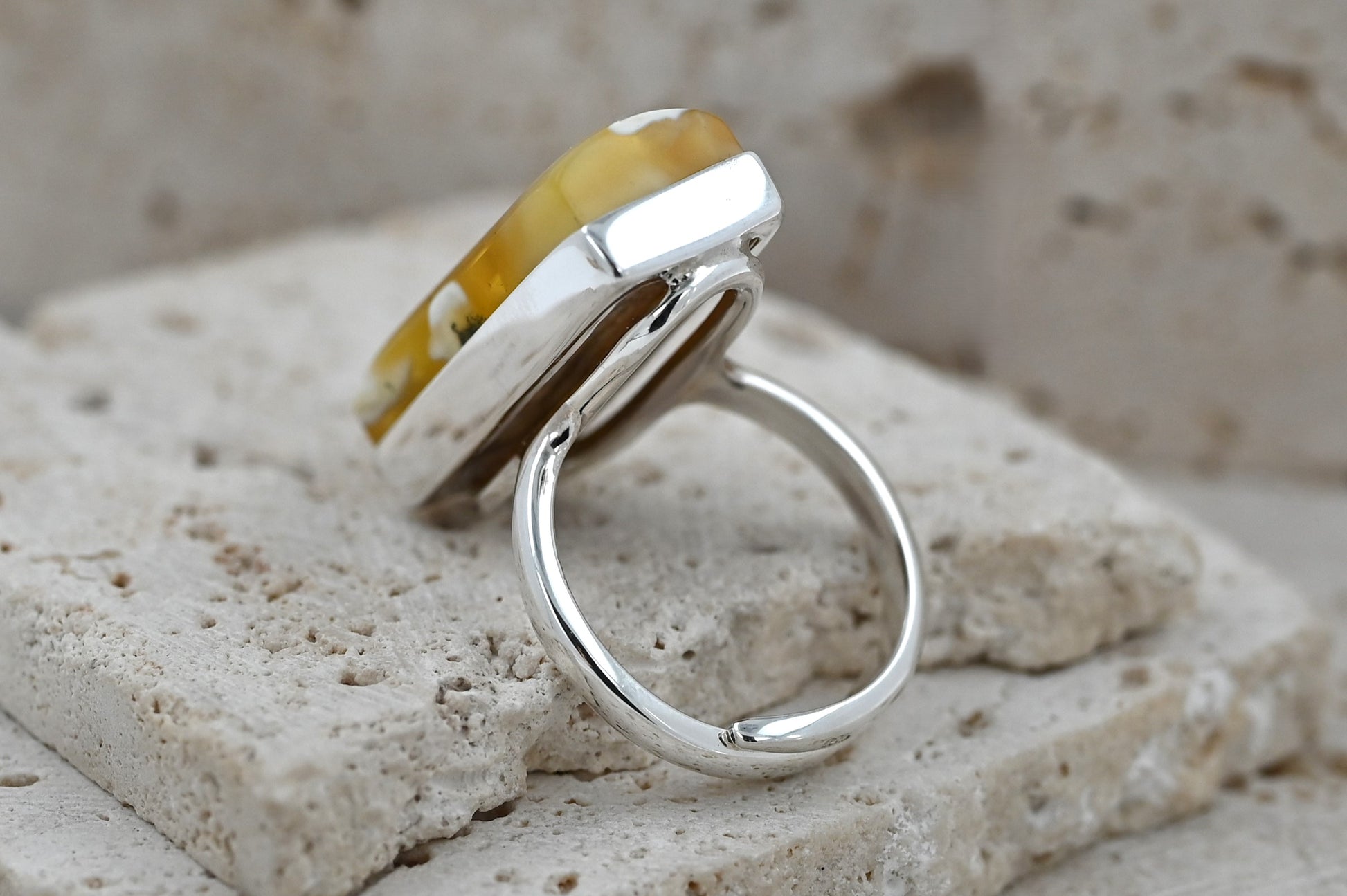Każdy detal bursztynu powstał przez miliony lat, bez ingerencji człowieka. Jego ciepła kolorystyka i naturalne inkluzje sprawiają, że pierścionek przyciąga wzrok i emanuje spokojną, ponadczasową elegancją.