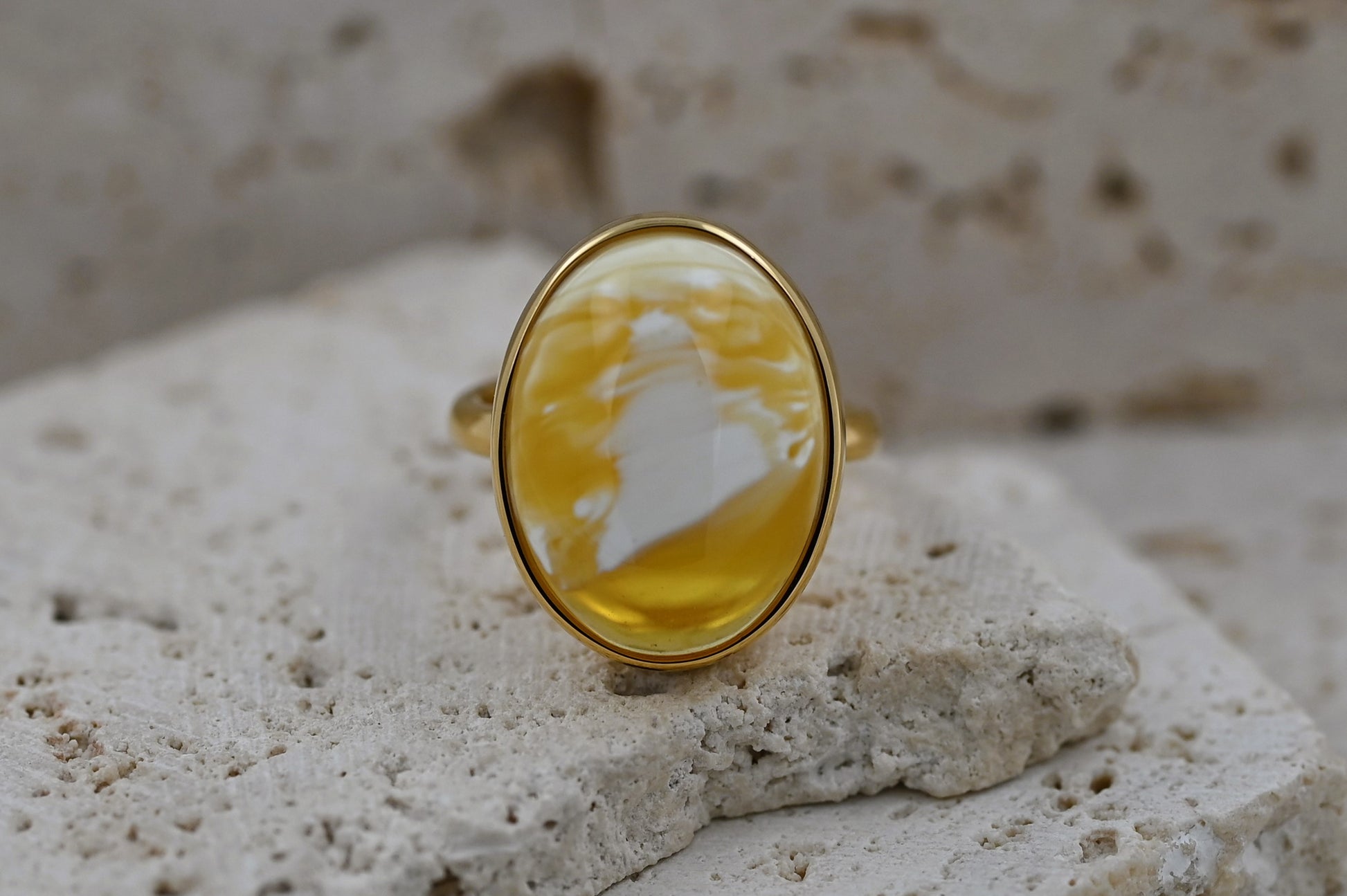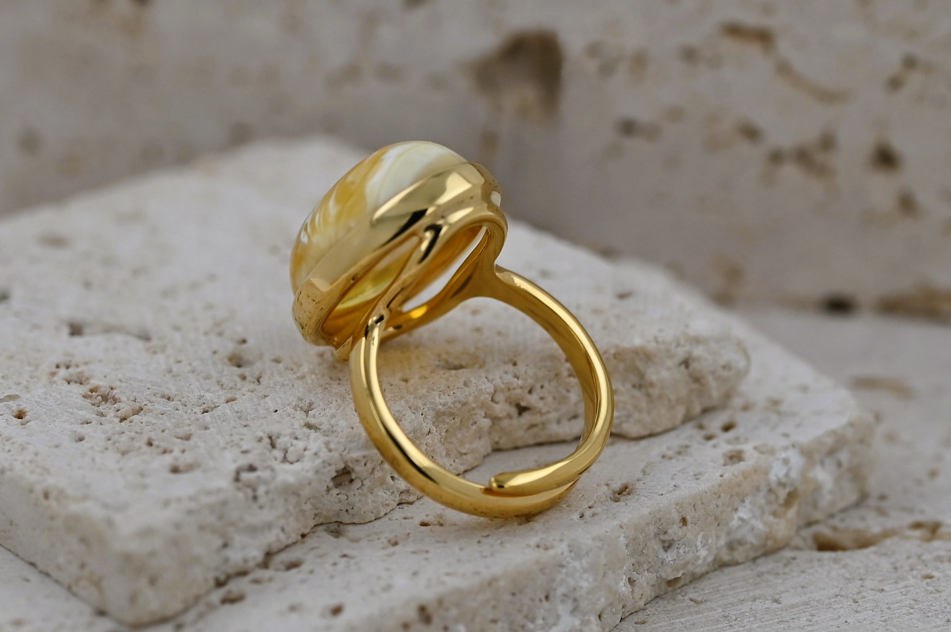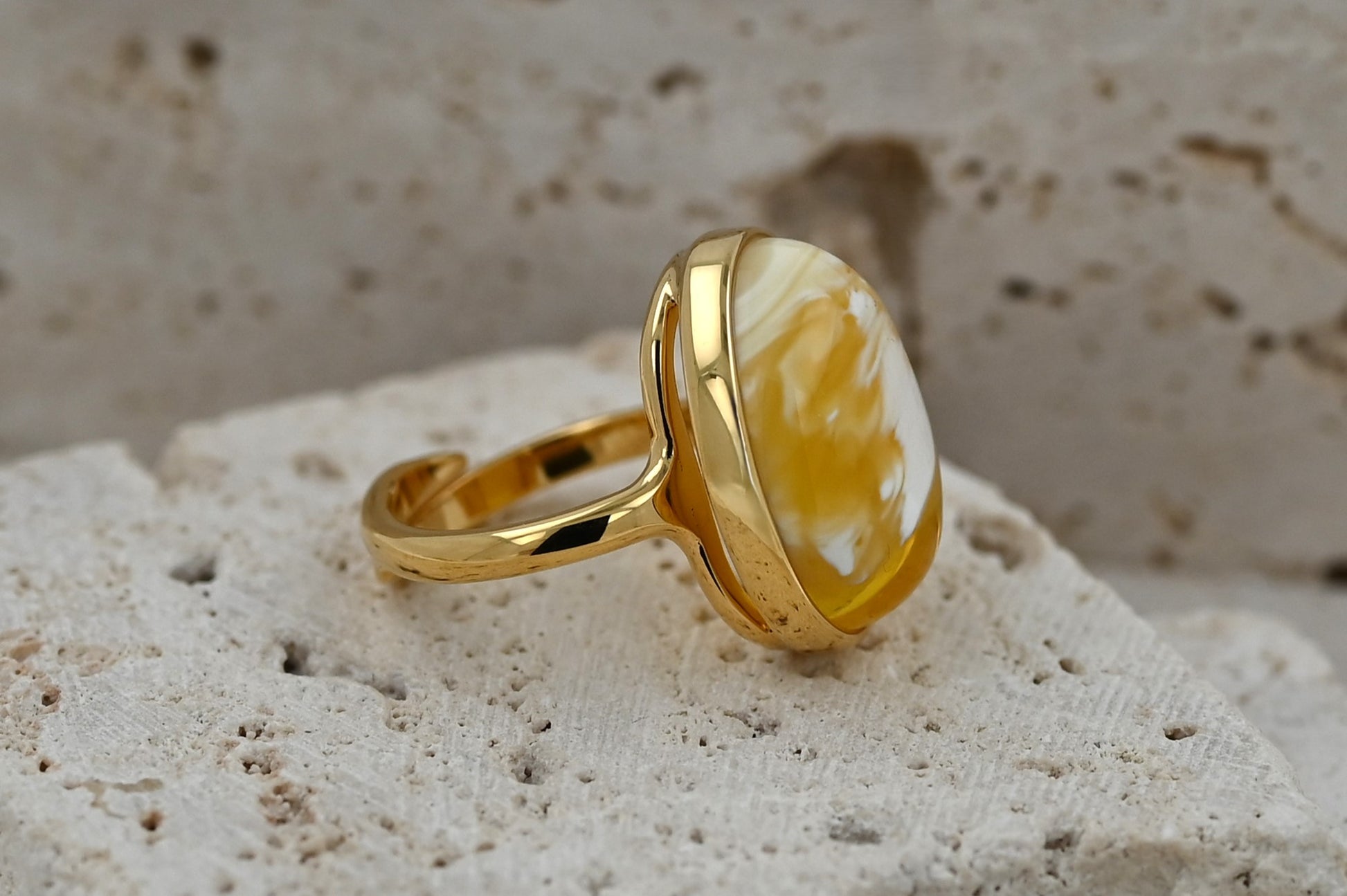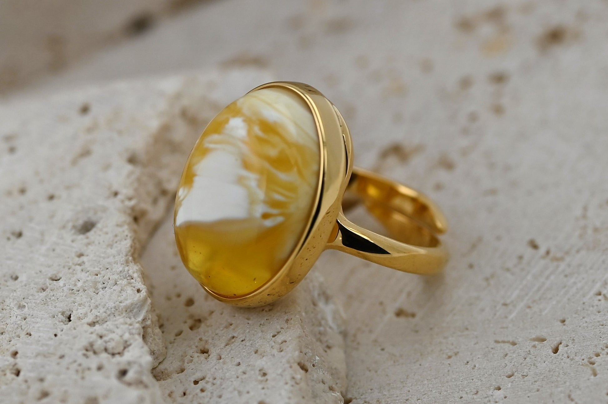 Podkreśl swoją wyjątkowość dzięki niezwykłemu unikatowemu pierścionkowi z mlecznym bursztynem bałtyckim, oprawionym w pozłacane srebro 925. To jedyny w swoim rodzaju model – bursztyn o tak niepowtarzalnym, mleczno-złocistym wzorze występuje tylko raz. Każdy egzemplarz jest absolutnie unikatowy, co czyni ten pierścionek wyjątkową biżuterią dla kobiet ceniących indywidualny styl.