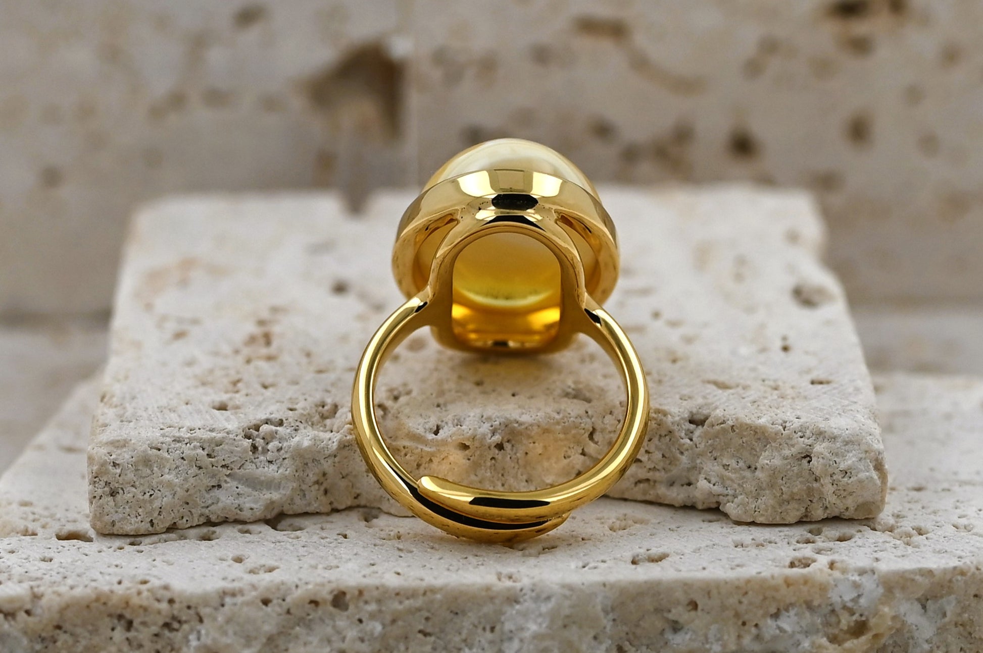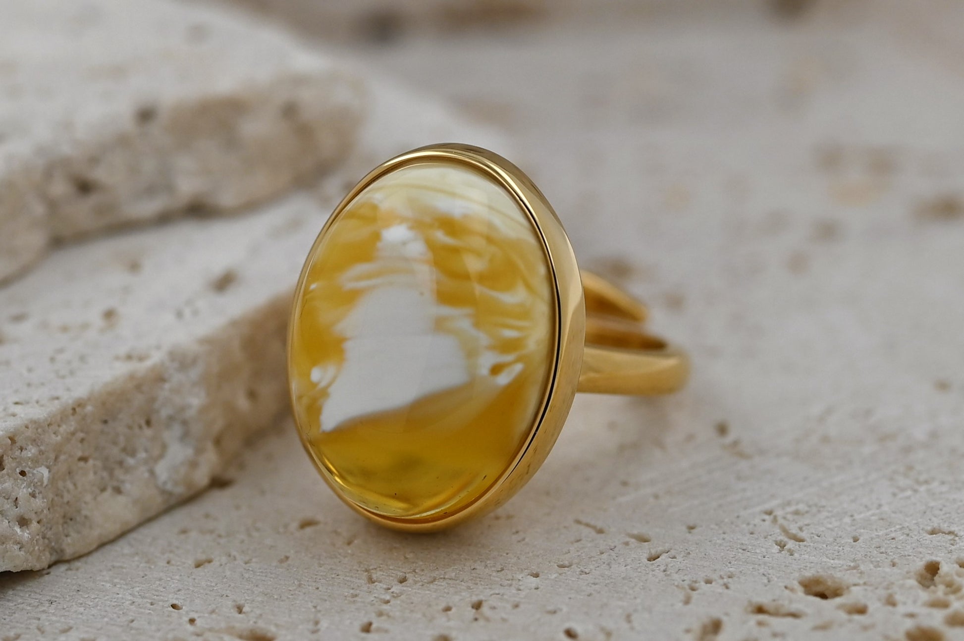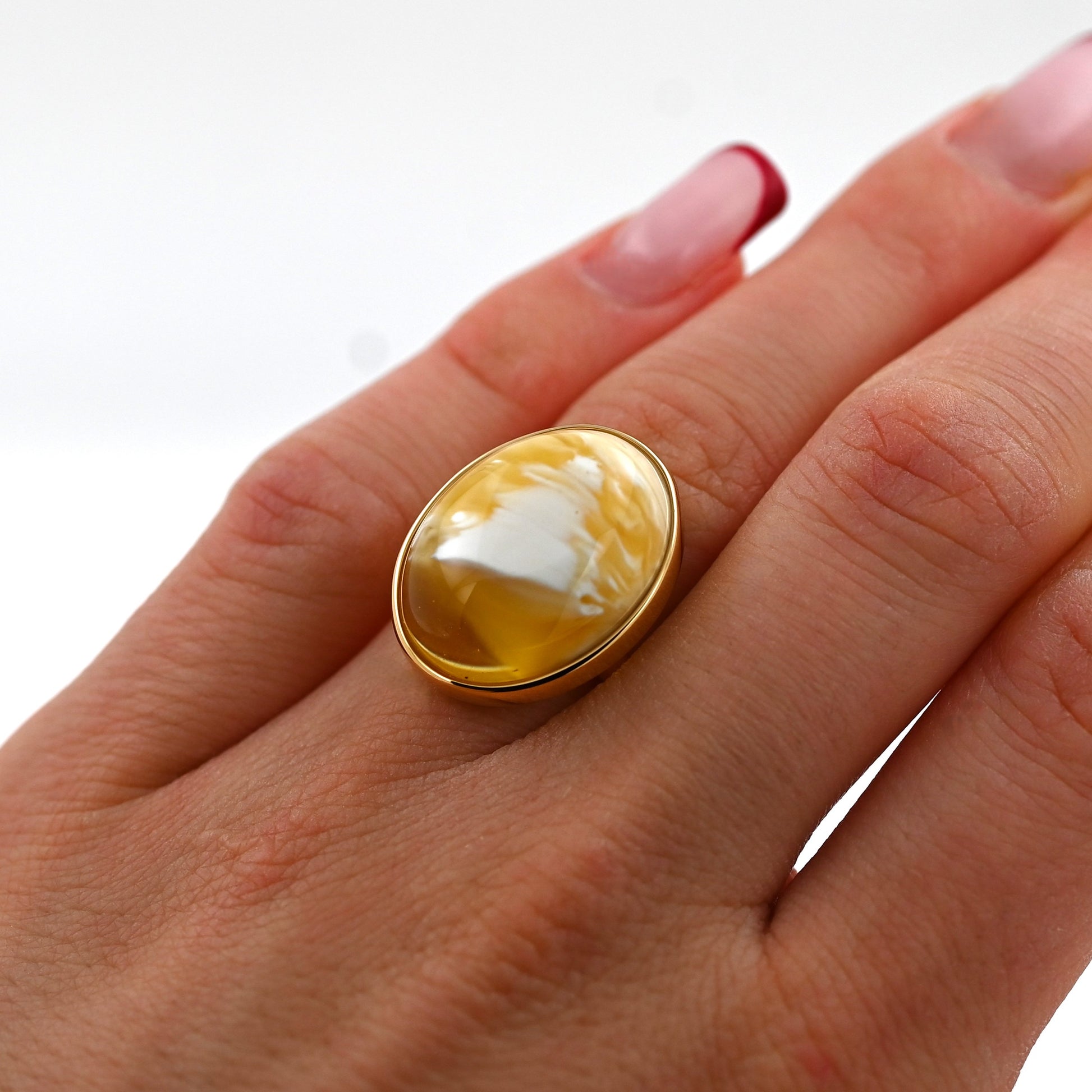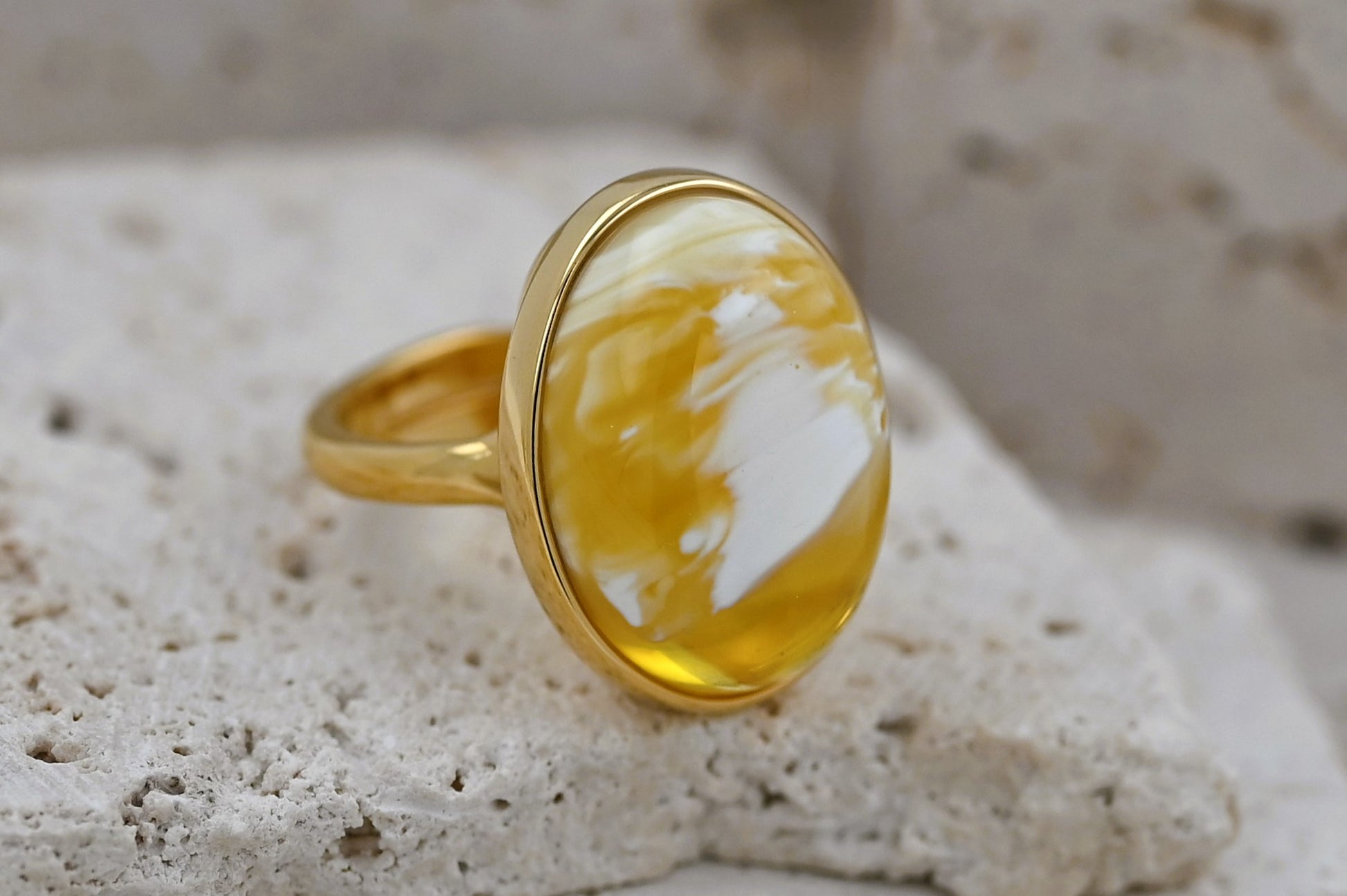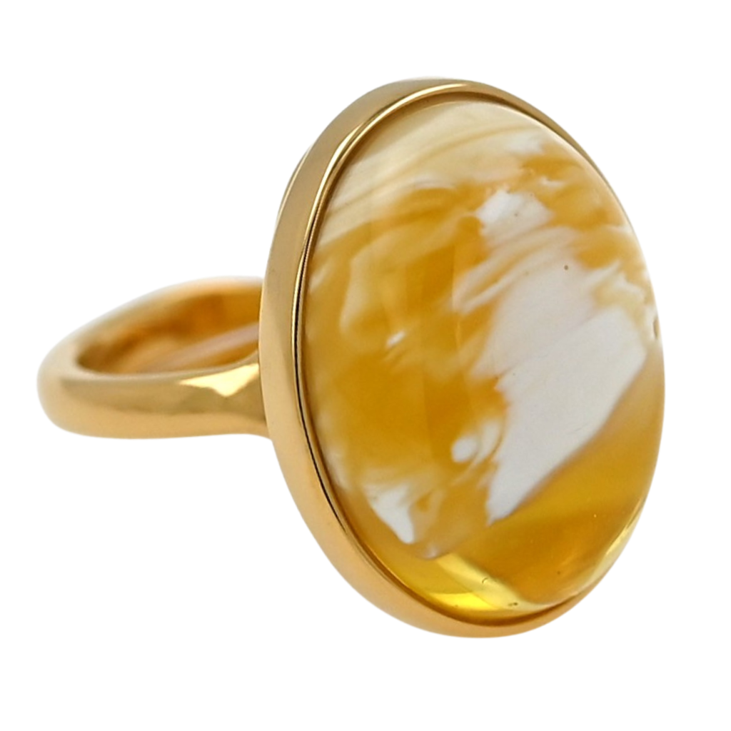 Podkreśl swoją wyjątkowość dzięki niezwykłemu unikatowemu pierścionkowi z mlecznym bursztynem bałtyckim, oprawionym w pozłacane srebro 925. To jedyny w swoim rodzaju model – bursztyn o tak niepowtarzalnym, mleczno-złocistym wzorze występuje tylko raz. Każdy egzemplarz jest absolutnie unikatowy, co czyni ten pierścionek wyjątkową biżuterią dla kobiet ceniących indywidualny styl.